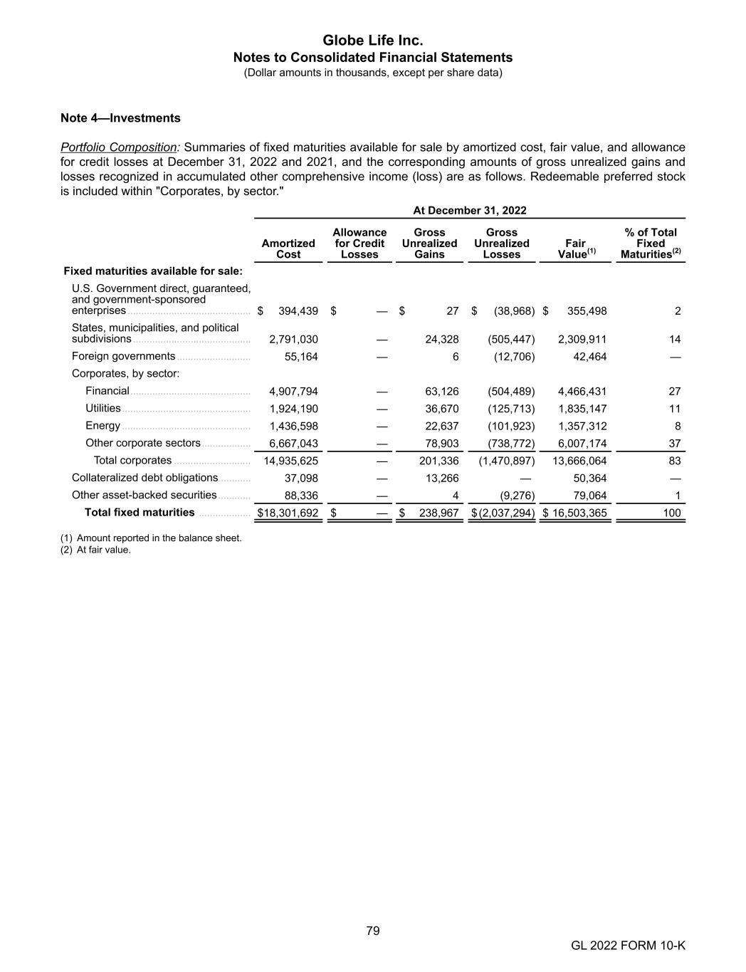 Note 4—Investments Portfolio Composition: Summaries of fixed maturities available for sale by amortized cost, fair value, and allowance for credit losses at December 31, 2022 and 2021, and the corresponding amounts of gross unrealized gains and losses recognized in accumulated other comprehensive income (loss) are as follows. Redeemable preferred stock is included within "Corporates, by sector." At December 31, 2022 Amortized Cost Allowance for Credit Losses Gross Unrealized Gains Gross Unrealized Losses Fair Value(1) % of Total Fixed Maturities(2) Fixed maturities available for sale: U.S. Government direct, guaranteed, and government-sponsored enterprises ............................................. $ 394,439 $ — $ 27 $ (38,968) $ 355,498 2 States, municipalities, and political subdivisions ........................................... 2,791,030 — 24,328 (505,447) 2,309,911 14 Foreign governments ........................... 55,164 — 6 (12,706) 42,464 — Corporates, by sector: Financial............................................ 4,907,794 — 63,126 (504,489) 4,466,431 27 Utilities ............................................... 1,924,190 — 36,670 (125,713) 1,835,147 11 Energy ............................................... 1,436,598 — 22,637 (101,923) 1,357,312 8 Other corporate sectors.................. 6,667,043 — 78,903 (738,772) 6,007,174 37 Total corporates ............................ 14,935,625 — 201,336 (1,470,897) 13,666,064 83 Collateralized debt obligations............ 37,098 — 13,266 — 50,364 — Other asset-backed securities ............ 88,336 — 4 (9,276) 79,064 1 Total fixed maturities ................... $18,301,692 $ — $ 238,967 $(2,037,294) $ 16,503,365 100 (1) Amount reported in the balance sheet. (2) At fair value. Globe Life Inc. Notes to Consolidated Financial Statements (Dollar amounts in thousands, except per share data) 79 GL 2022 FORM 10-K