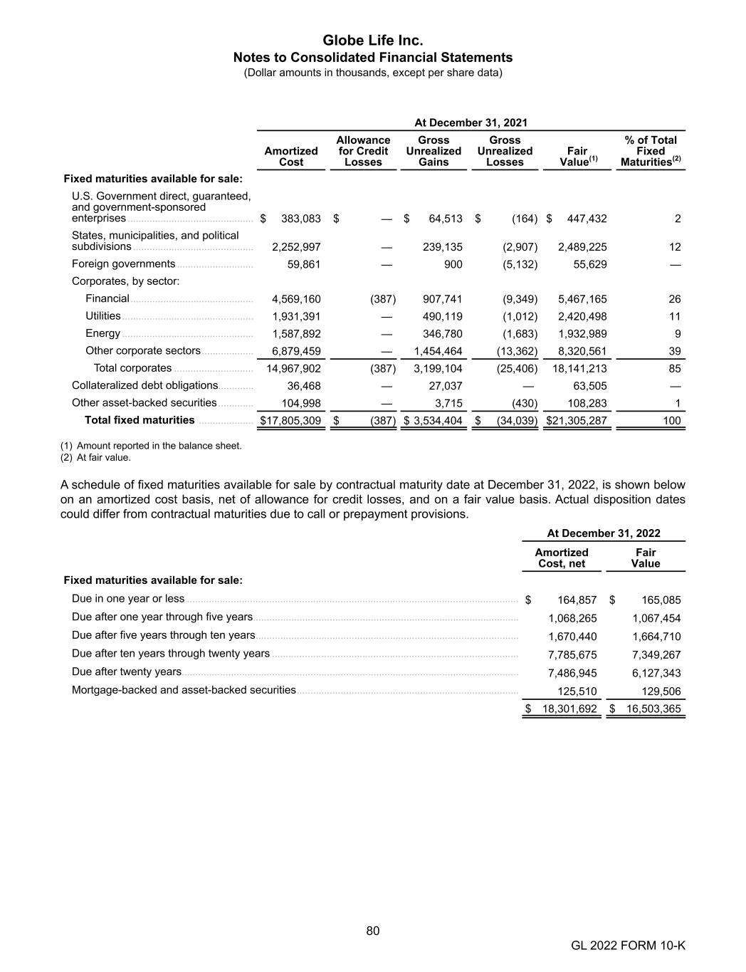 At December 31, 2021 Amortized Cost Allowance for Credit Losses Gross Unrealized Gains Gross Unrealized Losses Fair Value(1) % of Total Fixed Maturities(2) Fixed maturities available for sale: U.S. Government direct, guaranteed, and government-sponsored enterprises .............................................. $ 383,083 $ — $ 64,513 $ (164) $ 447,432 2 States, municipalities, and political subdivisions ............................................ 2,252,997 — 239,135 (2,907) 2,489,225 12 Foreign governments ............................ 59,861 — 900 (5,132) 55,629 — Corporates, by sector: Financial............................................. 4,569,160 (387) 907,741 (9,349) 5,467,165 26 Utilities ................................................ 1,931,391 — 490,119 (1,012) 2,420,498 11 Energy ................................................ 1,587,892 — 346,780 (1,683) 1,932,989 9 Other corporate sectors................... 6,879,459 — 1,454,464 (13,362) 8,320,561 39 Total corporates ............................. 14,967,902 (387) 3,199,104 (25,406) 18,141,213 85 Collateralized debt obligations............. 36,468 — 27,037 — 63,505 — Other asset-backed securities ............. 104,998 — 3,715 (430) 108,283 1 Total fixed maturities .................... $17,805,309 $ (387) $ 3,534,404 $ (34,039) $21,305,287 100 (1) Amount reported in the balance sheet. (2) At fair value. A schedule of fixed maturities available for sale by contractual maturity date at December 31, 2022, is shown below on an amortized cost basis, net of allowance for credit losses, and on a fair value basis. Actual disposition dates could differ from contractual maturities due to call or prepayment provisions. At December 31, 2022 Amortized Cost, net Fair Value Fixed maturities available for sale: Due in one year or less ......................................................................................................................... $ 164,857 $ 165,085 Due after one year through five years................................................................................................. 1,068,265 1,067,454 Due after five years through ten years................................................................................................ 1,670,440 1,664,710 Due after ten years through twenty years .......................................................................................... 7,785,675 7,349,267 Due after twenty years........................................................................................................................... 7,486,945 6,127,343 Mortgage-backed and asset-backed securities................................................................................. 125,510 129,506 $ 18,301,692 $ 16,503,365 Globe Life Inc. Notes to Consolidated Financial Statements (Dollar amounts in thousands, except per share data) 80 GL 2022 FORM 10-K