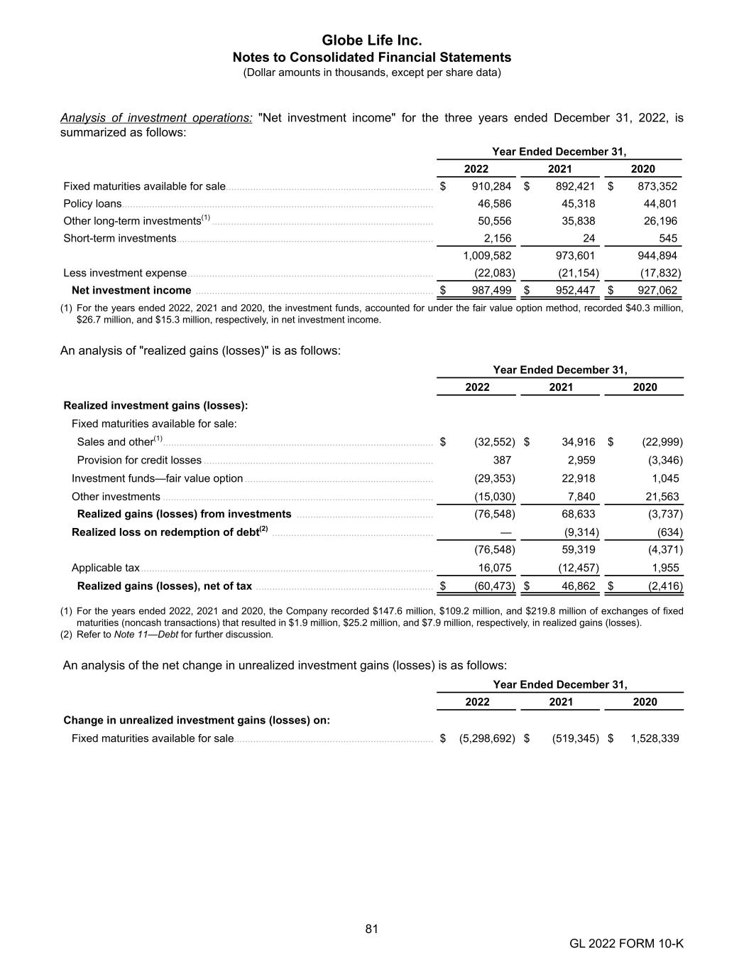 Analysis of investment operations: "Net investment income" for the three years ended December 31, 2022, is summarized as follows: Year Ended December 31, 2022 2021 2020 Fixed maturities available for sale............................................................................ $ 910,284 $ 892,421 $ 873,352 Policy loans.................................................................................................................. 46,586 45,318 44,801 Other long-term investments(1) ................................................................................. 50,556 35,838 26,196 Short-term investments.............................................................................................. 2,156 24 545 1,009,582 973,601 944,894 Less investment expense.......................................................................................... (22,083) (21,154) (17,832) Net investment income ....................................................................................... $ 987,499 $ 952,447 $ 927,062 (1) For the years ended 2022, 2021 and 2020, the investment funds, accounted for under the fair value option method, recorded $40.3 million, $26.7 million, and $15.3 million, respectively, in net investment income. An analysis of "realized gains (losses)" is as follows: Year Ended December 31, 2022 2021 2020 Realized investment gains (losses): Fixed maturities available for sale: Sales and other(1)................................................................................................... $ (32,552) $ 34,916 $ (22,999) Provision for credit losses .................................................................................... 387 2,959 (3,346) Investment funds—fair value option ..................................................................... (29,353) 22,918 1,045 Other investments ................................................................................................... (15,030) 7,840 21,563 Realized gains (losses) from investments .................................................. (76,548) 68,633 (3,737) Realized loss on redemption of debt(2) ........................................................... — (9,314) (634) (76,548) 59,319 (4,371) Applicable tax ........................................................................................................... 16,075 (12,457) 1,955 Realized gains (losses), net of tax ................................................................. $ (60,473) $ 46,862 $ (2,416) (1) For the years ended 2022, 2021 and 2020, the Company recorded $147.6 million, $109.2 million, and $219.8 million of exchanges of fixed maturities (noncash transactions) that resulted in $1.9 million, $25.2 million, and $7.9 million, respectively, in realized gains (losses). (2) Refer to Note 11—Debt for further discussion. An analysis of the net change in unrealized investment gains (losses) is as follows: Year Ended December 31, 2022 2021 2020 Change in unrealized investment gains (losses) on: Fixed maturities available for sale......................................................................... $ (5,298,692) $ (519,345) $ 1,528,339 Globe Life Inc. Notes to Consolidated Financial Statements (Dollar amounts in thousands, except per share data) 81 GL 2022 FORM 10-K