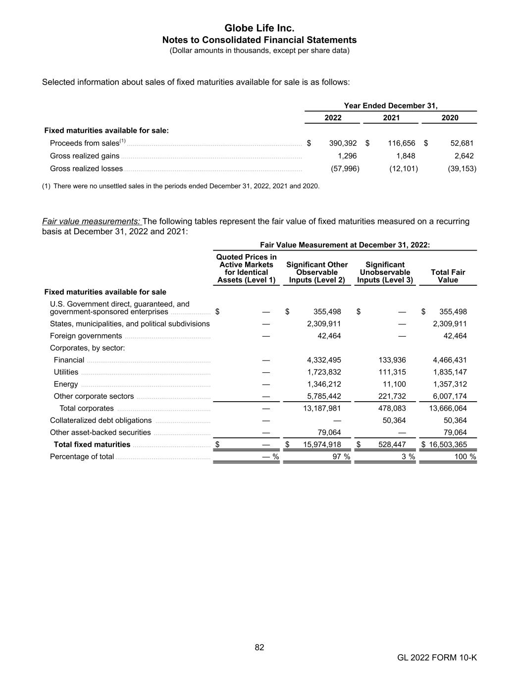 Selected information about sales of fixed maturities available for sale is as follows: Year Ended December 31, 2022 2021 2020 Fixed maturities available for sale: Proceeds from sales(1) ............................................................................................ $ 390,392 $ 116,656 $ 52,681 Gross realized gains ............................................................................................... 1,296 1,848 2,642 Gross realized losses.............................................................................................. (57,996) (12,101) (39,153) (1) There were no unsettled sales in the periods ended December 31, 2022, 2021 and 2020. Fair value measurements: The following tables represent the fair value of fixed maturities measured on a recurring basis at December 31, 2022 and 2021: Fair Value Measurement at December 31, 2022: Quoted Prices in Active Markets for Identical Assets (Level 1) Significant Other Observable Inputs (Level 2) Significant Unobservable Inputs (Level 3) Total Fair Value Fixed maturities available for sale U.S. Government direct, guaranteed, and government-sponsored enterprises ..................... $ — $ 355,498 $ — $ 355,498 States, municipalities, and political subdivisions — 2,309,911 — 2,309,911 Foreign governments ............................................. — 42,464 — 42,464 Corporates, by sector: Financial ................................................................. — 4,332,495 133,936 4,466,431 Utilities .................................................................... — 1,723,832 111,315 1,835,147 Energy .................................................................... — 1,346,212 11,100 1,357,312 Other corporate sectors ....................................... — 5,785,442 221,732 6,007,174 Total corporates ................................................. — 13,187,981 478,083 13,666,064 Collateralized debt obligations ............................. — — 50,364 50,364 Other asset-backed securities .............................. — 79,064 — 79,064 Total fixed maturities ......................................... $ — $ 15,974,918 $ 528,447 $ 16,503,365 Percentage of total .................................................. — % 97 % 3 % 100 % Globe Life Inc. Notes to Consolidated Financial Statements (Dollar amounts in thousands, except per share data) 82 GL 2022 FORM 10-K