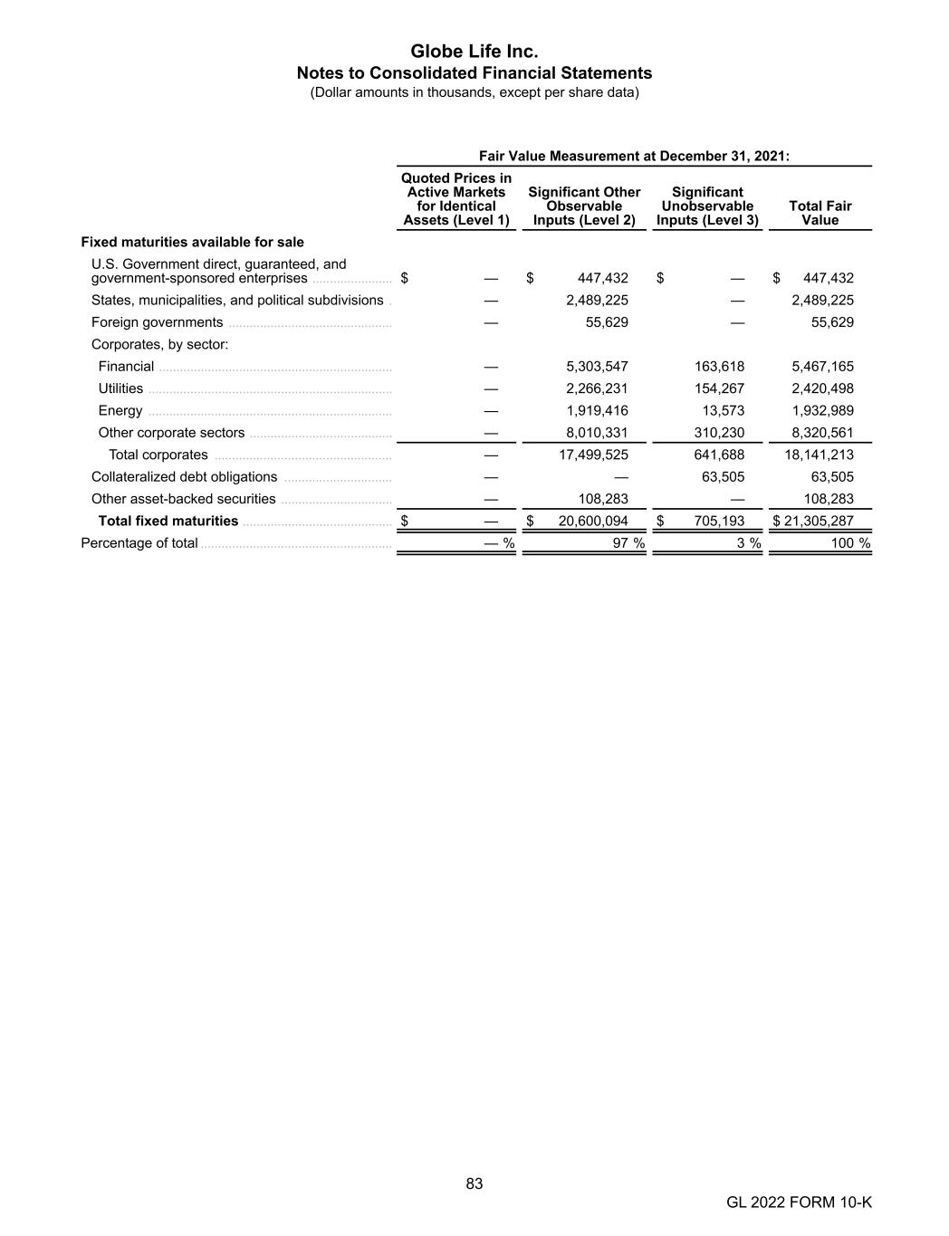 Fair Value Measurement at December 31, 2021: Quoted Prices in Active Markets for Identical Assets (Level 1) Significant Other Observable Inputs (Level 2) Significant Unobservable Inputs (Level 3) Total Fair Value Fixed maturities available for sale U.S. Government direct, guaranteed, and government-sponsored enterprises ....................... $ — $ 447,432 $ — $ 447,432 States, municipalities, and political subdivisions . — 2,489,225 — 2,489,225 Foreign governments ............................................... — 55,629 — 55,629 Corporates, by sector: Financial ................................................................... — 5,303,547 163,618 5,467,165 Utilities ...................................................................... — 2,266,231 154,267 2,420,498 Energy ...................................................................... — 1,919,416 13,573 1,932,989 Other corporate sectors ......................................... — 8,010,331 310,230 8,320,561 Total corporates ................................................... — 17,499,525 641,688 18,141,213 Collateralized debt obligations ............................... — — 63,505 63,505 Other asset-backed securities ................................ — 108,283 — 108,283 Total fixed maturities ........................................... $ — $ 20,600,094 $ 705,193 $ 21,305,287 Percentage of total ....................................................... — % 97 % 3 % 100 % Globe Life Inc. Notes to Consolidated Financial Statements (Dollar amounts in thousands, except per share data) 83 GL 2022 FORM 10-K