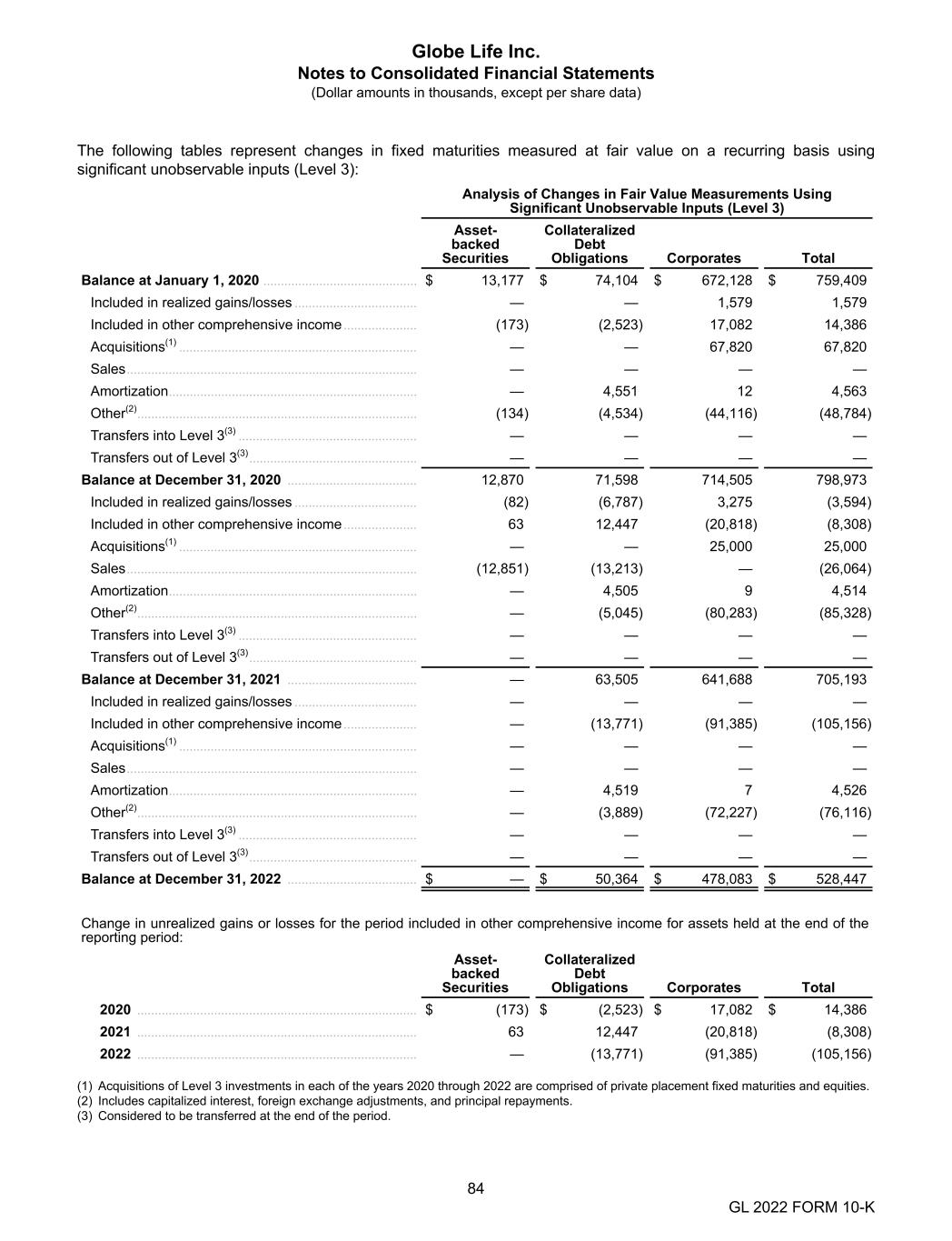 The following tables represent changes in fixed maturities measured at fair value on a recurring basis using significant unobservable inputs (Level 3): Analysis of Changes in Fair Value Measurements Using Significant Unobservable Inputs (Level 3) Asset- backed Securities Collateralized Debt Obligations Corporates Total Balance at January 1, 2020 ............................................ $ 13,177 $ 74,104 $ 672,128 $ 759,409 Included in realized gains/losses ................................... — — 1,579 1,579 Included in other comprehensive income ..................... (173) (2,523) 17,082 14,386 Acquisitions(1) .................................................................... — — 67,820 67,820 Sales................................................................................... — — — — Amortization....................................................................... — 4,551 12 4,563 Other(2)................................................................................ (134) (4,534) (44,116) (48,784) Transfers into Level 3(3) ................................................... — — — — Transfers out of Level 3(3)................................................ — — — — Balance at December 31, 2020 ..................................... 12,870 71,598 714,505 798,973 Included in realized gains/losses ................................... (82) (6,787) 3,275 (3,594) Included in other comprehensive income ..................... 63 12,447 (20,818) (8,308) Acquisitions(1) .................................................................... — — 25,000 25,000 Sales................................................................................... (12,851) (13,213) — (26,064) Amortization....................................................................... — 4,505 9 4,514 Other(2)................................................................................ — (5,045) (80,283) (85,328) Transfers into Level 3(3) ................................................... — — — — Transfers out of Level 3(3)................................................ — — — — Balance at December 31, 2021 ..................................... — 63,505 641,688 705,193 Included in realized gains/losses ................................... — — — — Included in other comprehensive income ..................... — (13,771) (91,385) (105,156) Acquisitions(1) .................................................................... — — — — Sales................................................................................... — — — — Amortization....................................................................... — 4,519 7 4,526 Other(2)................................................................................ — (3,889) (72,227) (76,116) Transfers into Level 3(3) ................................................... — — — — Transfers out of Level 3(3)................................................ — — — — Balance at December 31, 2022 ..................................... $ — $ 50,364 $ 478,083 $ 528,447 Change in unrealized gains or losses for the period included in other comprehensive income for assets held at the end of the reporting period: Asset- backed Securities Collateralized Debt Obligations Corporates Total 2020 ................................................................................ $ (173) $ (2,523) $ 17,082 $ 14,386 2021 ................................................................................ 63 12,447 (20,818) (8,308) 2022 ................................................................................ — (13,771) (91,385) (105,156) (1) Acquisitions of Level 3 investments in each of the years 2020 through 2022 are comprised of private placement fixed maturities and equities. (2) Includes capitalized interest, foreign exchange adjustments, and principal repayments. (3) Considered to be transferred at the end of the period. Globe Life Inc. Notes to Consolidated Financial Statements (Dollar amounts in thousands, except per share data) 84 GL 2022 FORM 10-K