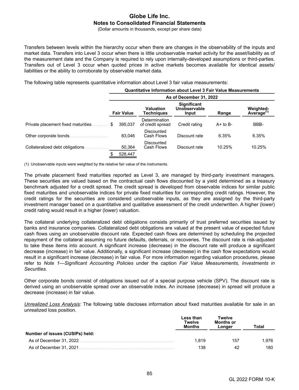 Transfers between levels within the hierarchy occur when there are changes in the observability of the inputs and market data. Transfers into Level 3 occur when there is little unobservable market activity for the asset/liability as of the measurement date and the Company is required to rely upon internally-developed assumptions or third-parties. Transfers out of Level 3 occur when quoted prices in active markets becomes available for identical assets/ liabilities or the ability to corroborate by observable market data. The following table represents quantitative information about Level 3 fair value measurements: Quantitative Information about Level 3 Fair Value Measurements As of December 31, 2022 Fair Value Valuation Techniques Significant Unobservable Input Range Weighted- Average(1) Private placement fixed maturities............... $ 395,037 Determination of credit spread Credit rating A+ to B- BBB- Other corporate bonds................................... 83,046 Discounted Cash Flows Discount rate 6.35% 6.35% Collateralized debt obligations ..................... 50,364 Discounted Cash Flows Discount rate 10.25% 10.25% $ 528,447 (1) Unobservable inputs were weighted by the relative fair value of the instruments. The private placement fixed maturities reported as Level 3, are managed by third-party investment managers. These securities are valued based on the contractual cash flows discounted by a yield determined as a treasury benchmark adjusted for a credit spread. The credit spread is developed from observable indices for similar public fixed maturities and unobservable indices for private fixed maturities for corresponding credit ratings. However, the credit ratings for the securities are considered unobservable inputs, as they are assigned by the third-party investment manager based on a quantitative and qualitative assessment of the credit underwritten. A higher (lower) credit rating would result in a higher (lower) valuation. The collateral underlying collateralized debt obligations consists primarily of trust preferred securities issued by banks and insurance companies. Collateralized debt obligations are valued at the present value of expected future cash flows using an unobservable discount rate. Expected cash flows are determined by scheduling the projected repayment of the collateral assuming no future defaults, deferrals, or recoveries. The discount rate is risk-adjusted to take these items into account. A significant increase (decrease) in the discount rate will produce a significant decrease (increase) in fair value. Additionally, a significant increase (decrease) in the cash flow expectations would result in a significant increase (decrease) in fair value. For more information regarding valuation procedures, please refer to Note 1—Significant Accounting Policies under the caption Fair Value Measurements, Investments in Securities. Other corporate bonds consist of obligations issued out of a special purpose vehicle (SPV). The discount rate is derived using an unobservable spread over an observable index. An increase (decrease) in spread will produce a decrease (increase) in fair value. Unrealized Loss Analysis: The following table discloses information about fixed maturities available for sale in an unrealized loss position. Less than Twelve Months Twelve Months or Longer Total Number of issues (CUSIPs) held: As of December 31, 2022....................................................................................... 1,819 157 1,976 As of December 31, 2021....................................................................................... 138 42 180 Globe Life Inc. Notes to Consolidated Financial Statements (Dollar amounts in thousands, except per share data) 85 GL 2022 FORM 10-K