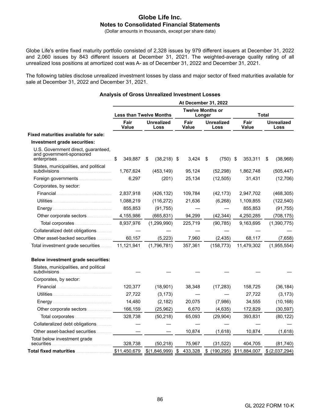 Globe Life's entire fixed maturity portfolio consisted of 2,328 issues by 979 different issuers at December 31, 2022 and 2,060 issues by 843 different issuers at December 31, 2021. The weighted-average quality rating of all unrealized loss positions at amortized cost was A- as of December 31, 2022 and December 31, 2021. The following tables disclose unrealized investment losses by class and major sector of fixed maturities available for sale at December 31, 2022 and December 31, 2021. Analysis of Gross Unrealized Investment Losses At December 31, 2022 Less than Twelve Months Twelve Months or Longer Total Fair Value Unrealized Loss Fair Value Unrealized Loss Fair Value Unrealized Loss Fixed maturities available for sale: Investment grade securities: U.S. Government direct, guaranteed, and government-sponsored enterprises .............................................. $ 349,887 $ (38,218) $ 3,424 $ (750) $ 353,311 $ (38,968) States, municipalities, and political subdivisions ............................................ 1,767,624 (453,149) 95,124 (52,298) 1,862,748 (505,447) Foreign governments ............................ 6,297 (201) 25,134 (12,505) 31,431 (12,706) Corporates, by sector: Financial............................................... 2,837,918 (426,132) 109,784 (42,173) 2,947,702 (468,305) Utilities .................................................. 1,088,219 (116,272) 21,636 (6,268) 1,109,855 (122,540) Energy .................................................. 855,853 (91,755) — — 855,853 (91,755) Other corporate sectors..................... 4,155,986 (665,831) 94,299 (42,344) 4,250,285 (708,175) Total corporates ............................... 8,937,976 (1,299,990) 225,719 (90,785) 9,163,695 (1,390,775) Collateralized debt obligations............. — — — — — — Other asset-backed securities ............. 60,157 (5,223) 7,960 (2,435) 68,117 (7,658) Total investment grade securities.......... 11,121,941 (1,796,781) 357,361 (158,773) 11,479,302 (1,955,554) Below investment grade securities: States, municipalities, and political subdivisions ............................................ — — — — — — Corporates, by sector: Financial............................................... 120,377 (18,901) 38,348 (17,283) 158,725 (36,184) Utilities .................................................. 27,722 (3,173) — — 27,722 (3,173) Energy .................................................. 14,480 (2,182) 20,075 (7,986) 34,555 (10,168) Other corporate sectors..................... 166,159 (25,962) 6,670 (4,635) 172,829 (30,597) Total corporates ............................... 328,738 (50,218) 65,093 (29,904) 393,831 (80,122) Collateralized debt obligations............. — — — — — — Other asset-backed securities ............. — — 10,874 (1,618) 10,874 (1,618) Total below investment grade securities ................................................... 328,738 (50,218) 75,967 (31,522) 404,705 (81,740) Total fixed maturities .............................. $11,450,679 $(1,846,999) $ 433,328 $ (190,295) $11,884,007 $ (2,037,294) Globe Life Inc. Notes to Consolidated Financial Statements (Dollar amounts in thousands, except per share data) 86 GL 2022 FORM 10-K