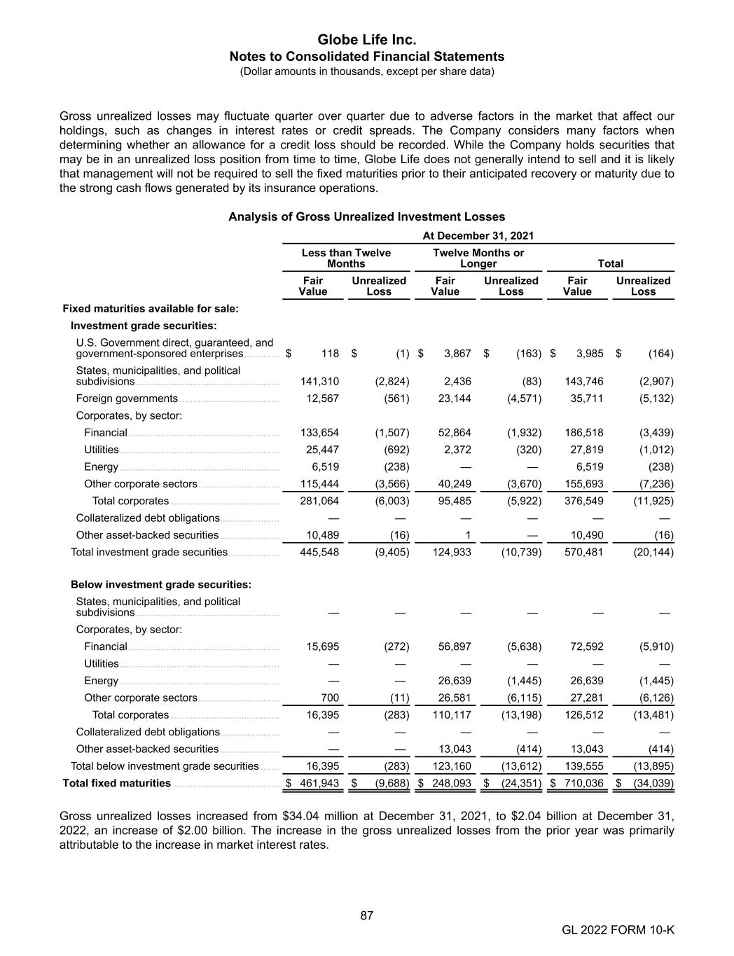 Gross unrealized losses may fluctuate quarter over quarter due to adverse factors in the market that affect our holdings, such as changes in interest rates or credit spreads. The Company considers many factors when determining whether an allowance for a credit loss should be recorded. While the Company holds securities that may be in an unrealized loss position from time to time, Globe Life does not generally intend to sell and it is likely that management will not be required to sell the fixed maturities prior to their anticipated recovery or maturity due to the strong cash flows generated by its insurance operations. Analysis of Gross Unrealized Investment Losses At December 31, 2021 Less than Twelve Months Twelve Months or Longer Total Fair Value Unrealized Loss Fair Value Unrealized Loss Fair Value Unrealized Loss Fixed maturities available for sale: Investment grade securities: U.S. Government direct, guaranteed, and government-sponsored enterprises............. $ 118 $ (1) $ 3,867 $ (163) $ 3,985 $ (164) States, municipalities, and political subdivisions ..................................................... 141,310 (2,824) 2,436 (83) 143,746 (2,907) Foreign governments ..................................... 12,567 (561) 23,144 (4,571) 35,711 (5,132) Corporates, by sector: Financial........................................................ 133,654 (1,507) 52,864 (1,932) 186,518 (3,439) Utilities ........................................................... 25,447 (692) 2,372 (320) 27,819 (1,012) Energy ........................................................... 6,519 (238) — — 6,519 (238) Other corporate sectors.............................. 115,444 (3,566) 40,249 (3,670) 155,693 (7,236) Total corporates ........................................ 281,064 (6,003) 95,485 (5,922) 376,549 (11,925) Collateralized debt obligations...................... — — — — — — Other asset-backed securities ...................... 10,489 (16) 1 — 10,490 (16) Total investment grade securities................... 445,548 (9,405) 124,933 (10,739) 570,481 (20,144) Below investment grade securities: States, municipalities, and political subdivisions ..................................................... — — — — — — Corporates, by sector: Financial........................................................ 15,695 (272) 56,897 (5,638) 72,592 (5,910) Utilities ........................................................... — — — — — — Energy ........................................................... — — 26,639 (1,445) 26,639 (1,445) Other corporate sectors.............................. 700 (11) 26,581 (6,115) 27,281 (6,126) Total corporates ........................................ 16,395 (283) 110,117 (13,198) 126,512 (13,481) Collateralized debt obligations...................... — — — — — — Other asset-backed securities ...................... — — 13,043 (414) 13,043 (414) Total below investment grade securities ....... 16,395 (283) 123,160 (13,612) 139,555 (13,895) Total fixed maturities ....................................... $ 461,943 $ (9,688) $ 248,093 $ (24,351) $ 710,036 $ (34,039) Gross unrealized losses increased from $34.04 million at December 31, 2021, to $2.04 billion at December 31, 2022, an increase of $2.00 billion. The increase in the gross unrealized losses from the prior year was primarily attributable to the increase in market interest rates. Globe Life Inc. Notes to Consolidated Financial Statements (Dollar amounts in thousands, except per share data) 87 GL 2022 FORM 10-K