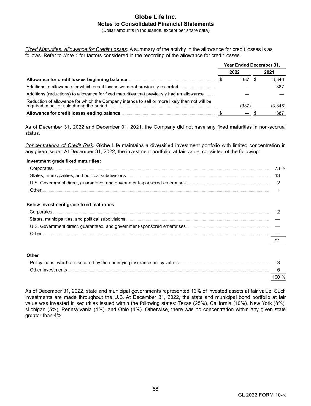 Fixed Maturities, Allowance for Credit Losses: A summary of the activity in the allowance for credit losses is as follows. Refer to Note 1 for factors considered in the recording of the allowance for credit losses. Year Ended December 31, 2022 2021 Allowance for credit losses beginning balance ........................................................................... $ 387 $ 3,346 Additions to allowance for which credit losses were not previously recorded................................ — 387 Additions (reductions) to allowance for fixed maturities that previously had an allowance ......... — — Reduction of allowance for which the Company intends to sell or more likely than not will be required to sell or sold during the period.............................................................................................. (387) (3,346) Allowance for credit losses ending balance ................................................................................. $ — $ 387 As of December 31, 2022 and December 31, 2021, the Company did not have any fixed maturities in non-accrual status. Concentrations of Credit Risk: Globe Life maintains a diversified investment portfolio with limited concentration in any given issuer. At December 31, 2022, the investment portfolio, at fair value, consisted of the following: Investment grade fixed maturities: Corporates ............................................................................................................................................................................................. 73 % States, municipalities, and political subdivisions ............................................................................................................................. 13 U.S. Government direct, guaranteed, and government-sponsored enterprises......................................................................... 2 Other....................................................................................................................................................................................................... 1 Below investment grade fixed maturities: Corporates ............................................................................................................................................................................................. 2 States, municipalities, and political subdivisions ............................................................................................................................. — U.S. Government direct, guaranteed, and government-sponsored enterprises......................................................................... — Other....................................................................................................................................................................................................... — 91 Other Policy loans, which are secured by the underlying insurance policy values............................................................................... 3 Other investments ................................................................................................................................................................................ 6 100 % As of December 31, 2022, state and municipal governments represented 13% of invested assets at fair value. Such investments are made throughout the U.S. At December 31, 2022, the state and municipal bond portfolio at fair value was invested in securities issued within the following states: Texas (25%), California (10%), New York (8%), Michigan (5%), Pennsylvania (4%), and Ohio (4%). Otherwise, there was no concentration within any given state greater than 4%. Globe Life Inc. Notes to Consolidated Financial Statements (Dollar amounts in thousands, except per share data) 88 GL 2022 FORM 10-K