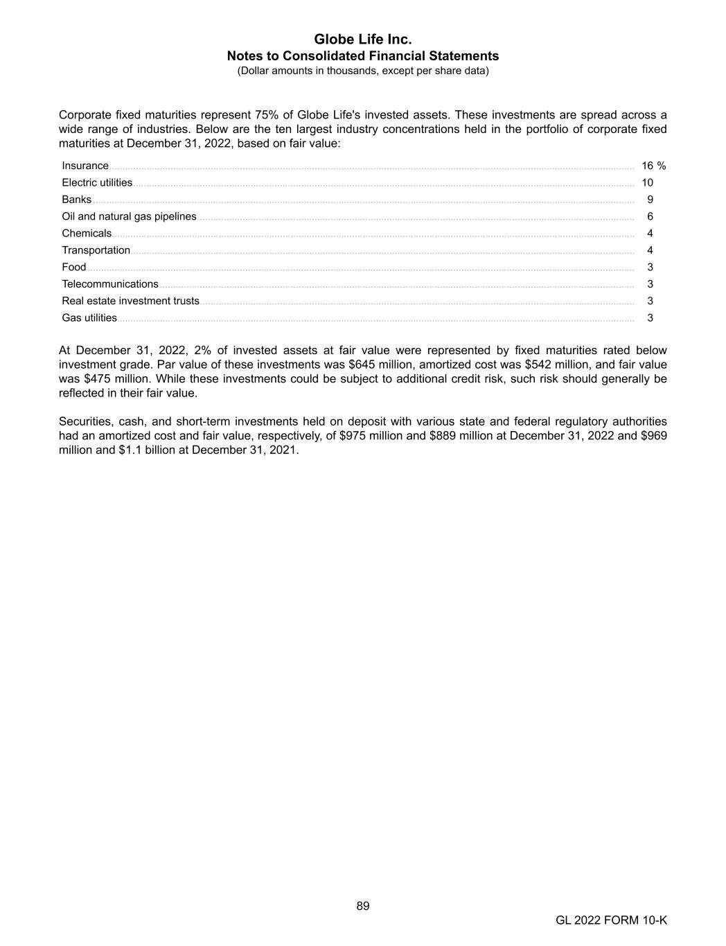 Corporate fixed maturities represent 75% of Globe Life's invested assets. These investments are spread across a wide range of industries. Below are the ten largest industry concentrations held in the portfolio of corporate fixed maturities at December 31, 2022, based on fair value: Insurance..................................................................................................................................................................................................... 16 % Electric utilities............................................................................................................................................................................................ 10 Banks ........................................................................................................................................................................................................... 9 Oil and natural gas pipelines.................................................................................................................................................................... 6 Chemicals.................................................................................................................................................................................................... 4 Transportation............................................................................................................................................................................................. 4 Food ............................................................................................................................................................................................................. 3 Telecommunications .................................................................................................................................................................................. 3 Real estate investment trusts................................................................................................................................................................... 3 Gas utilities.................................................................................................................................................................................................. 3 At December 31, 2022, 2% of invested assets at fair value were represented by fixed maturities rated below investment grade. Par value of these investments was $645 million, amortized cost was $542 million, and fair value was $475 million. While these investments could be subject to additional credit risk, such risk should generally be reflected in their fair value. Securities, cash, and short-term investments held on deposit with various state and federal regulatory authorities had an amortized cost and fair value, respectively, of $975 million and $889 million at December 31, 2022 and $969 million and $1.1 billion at December 31, 2021. Globe Life Inc. Notes to Consolidated Financial Statements (Dollar amounts in thousands, except per share data) 89 GL 2022 FORM 10-K