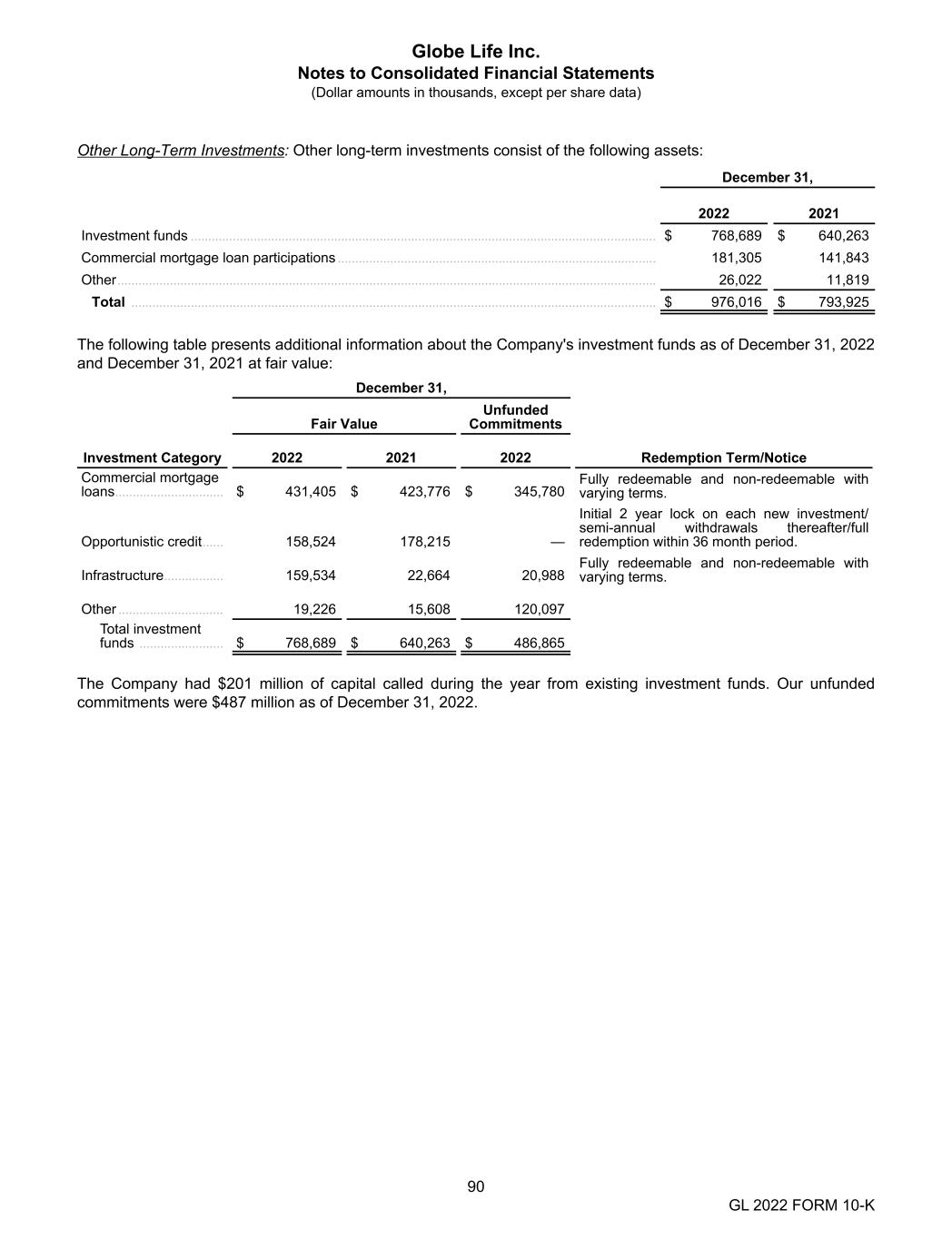 Other Long-Term Investments: Other long-term investments consist of the following assets: December 31, 2022 2021 Investment funds ..................................................................................................................................... $ 768,689 $ 640,263 Commercial mortgage loan participations ........................................................................................... 181,305 141,843 Other.......................................................................................................................................................... 26,022 11,819 Total ...................................................................................................................................................... $ 976,016 $ 793,925 The following table presents additional information about the Company's investment funds as of December 31, 2022 and December 31, 2021 at fair value: December 31, Fair Value Unfunded Commitments Investment Category 2022 2021 2022 Redemption Term/Notice Commercial mortgage loans............................... $ 431,405 $ 423,776 $ 345,780 Fully redeemable and non-redeemable with varying terms. Opportunistic credit...... 158,524 178,215 — Initial 2 year lock on each new investment/ semi-annual withdrawals thereafter/full redemption within 36 month period. Infrastructure................. 159,534 22,664 20,988 Fully redeemable and non-redeemable with varying terms. Other .............................. 19,226 15,608 120,097 Total investment funds ........................ $ 768,689 $ 640,263 $ 486,865 The Company had $201 million of capital called during the year from existing investment funds. Our unfunded commitments were $487 million as of December 31, 2022. Globe Life Inc. Notes to Consolidated Financial Statements (Dollar amounts in thousands, except per share data) 90 GL 2022 FORM 10-K