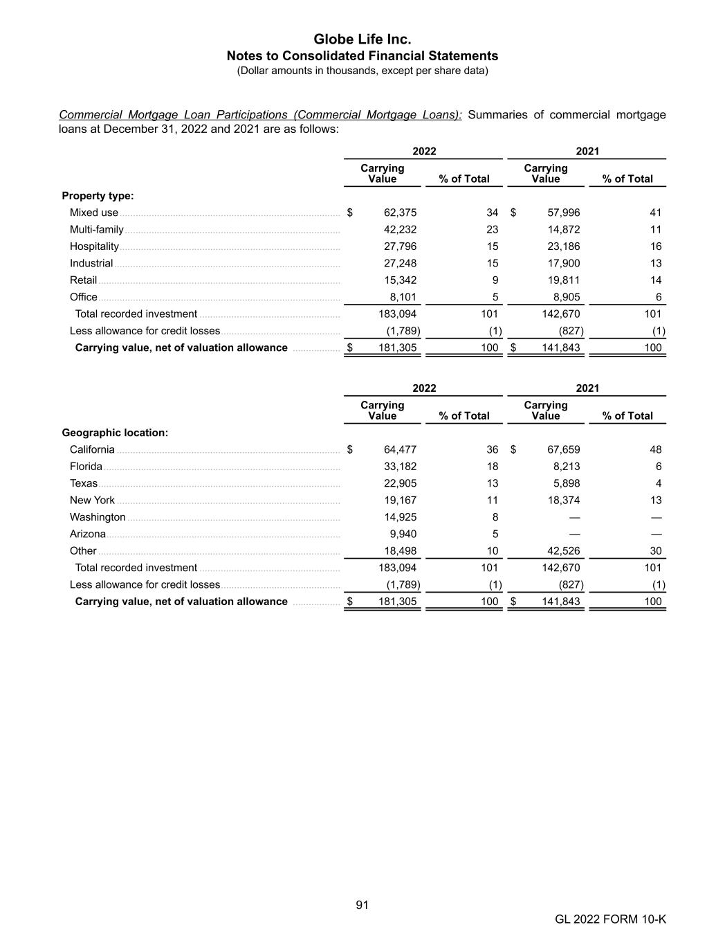 Commercial Mortgage Loan Participations (Commercial Mortgage Loans): Summaries of commercial mortgage loans at December 31, 2022 and 2021 are as follows: 2022 2021 Carrying Value % of Total Carrying Value % of Total Property type: Mixed use ................................................................................... $ 62,375 34 $ 57,996 41 Multi-family ................................................................................. 42,232 23 14,872 11 Hospitality................................................................................... 27,796 15 23,186 16 Industrial ..................................................................................... 27,248 15 17,900 13 Retail ........................................................................................... 15,342 9 19,811 14 Office........................................................................................... 8,101 5 8,905 6 Total recorded investment ..................................................... 183,094 101 142,670 101 Less allowance for credit losses............................................. (1,789) (1) (827) (1) Carrying value, net of valuation allowance .................. $ 181,305 100 $ 141,843 100 2022 2021 Carrying Value % of Total Carrying Value % of Total Geographic location: California .................................................................................... $ 64,477 36 $ 67,659 48 Florida ......................................................................................... 33,182 18 8,213 6 Texas........................................................................................... 22,905 13 5,898 4 New York .................................................................................... 19,167 11 18,374 13 Washington ................................................................................ 14,925 8 — — Arizona........................................................................................ 9,940 5 — — Other ........................................................................................... 18,498 10 42,526 30 Total recorded investment ..................................................... 183,094 101 142,670 101 Less allowance for credit losses............................................. (1,789) (1) (827) (1) Carrying value, net of valuation allowance .................. $ 181,305 100 $ 141,843 100 Globe Life Inc. Notes to Consolidated Financial Statements (Dollar amounts in thousands, except per share data) 91 GL 2022 FORM 10-K