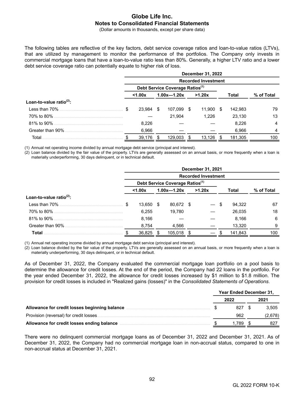 The following tables are reflective of the key factors, debt service coverage ratios and loan-to-value ratios (LTVs), that are utilized by management to monitor the performance of the portfolios. The Company only invests in commercial mortgage loans that have a loan-to-value ratio less than 80%. Generally, a higher LTV ratio and a lower debt service coverage ratio can potentially equate to higher risk of loss. December 31, 2022 Recorded Investment Debt Service Coverage Ratios(1) <1.00x 1.00x—1.20x >1.20x Total % of Total Loan-to-value ratio(2): Less than 70% ......................................................... $ 23,984 $ 107,099 $ 11,900 $ 142,983 79 70% to 80% .............................................................. — 21,904 1,226 23,130 13 81% to 90% .............................................................. 8,226 — — 8,226 4 Greater than 90% .................................................... 6,966 — — 6,966 4 Total......................................................................... $ 39,176 $ 129,003 $ 13,126 $ 181,305 100 (1) Annual net operating income divided by annual mortgage debt service (principal and interest). (2) Loan balance divided by the fair value of the property. LTVs are generally assessed on an annual basis, or more frequently when a loan is materially underperforming, 30 days delinquent, or in technical default. December 31, 2021 Recorded Investment Debt Service Coverage Ratios(1) <1.00x 1.00x—1.20x >1.20x Total % of Total Loan-to-value ratio(2): Less than 70% ......................................................... $ 13,650 $ 80,672 $ — $ 94,322 67 70% to 80% .............................................................. 6,255 19,780 — 26,035 18 81% to 90% .............................................................. 8,166 — — 8,166 6 Greater than 90% .................................................... 8,754 4,566 — 13,320 9 Total ....................................................................... $ 36,825 $ 105,018 $ — $ 141,843 100 (1) Annual net operating income divided by annual mortgage debt service (principal and interest). (2) Loan balance divided by the fair value of the property. LTVs are generally assessed on an annual basis, or more frequently when a loan is materially underperforming, 30 days delinquent, or in technical default. As of December 31, 2022, the Company evaluated the commercial mortgage loan portfolio on a pool basis to determine the allowance for credit losses. At the end of the period, the Company had 22 loans in the portfolio. For the year ended December 31, 2022, the allowance for credit losses increased by $1 million to $1.8 million. The provision for credit losses is included in "Realized gains (losses)" in the Consolidated Statements of Operations. Year Ended December 31, 2022 2021 Allowance for credit losses beginning balance ........................................................................... $ 827 $ 3,505 Provision (reversal) for credit losses ..................................................................................................... 962 (2,678) Allowance for credit losses ending balance ................................................................................. $ 1,789 $ 827 There were no delinquent commercial mortgage loans as of December 31, 2022 and December 31, 2021. As of December 31, 2022, the Company had no commercial mortgage loan in non-accrual status, compared to one in non-accrual status at December 31, 2021. Globe Life Inc. Notes to Consolidated Financial Statements (Dollar amounts in thousands, except per share data) 92 GL 2022 FORM 10-K