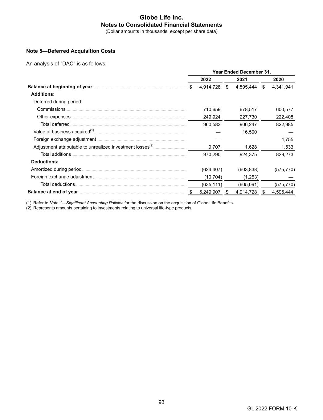 Note 5—Deferred Acquisition Costs An analysis of "DAC" is as follows: Year Ended December 31, 2022 2021 2020 Balance at beginning of year .............................................................................. $ 4,914,728 $ 4,595,444 $ 4,341,941 Additions: Deferred during period: Commissions...................................................................................................... 710,659 678,517 600,577 Other expenses ................................................................................................. 249,924 227,730 222,408 Total deferred .................................................................................................. 960,583 906,247 822,985 Value of business acquired(1).............................................................................. — 16,500 — Foreign exchange adjustment............................................................................ — — 4,755 Adjustment attributable to unrealized investment losses(2)............................ 9,707 1,628 1,533 Total additions ................................................................................................. 970,290 924,375 829,273 Deductions: Amortized during period ........................................................................................ (624,407) (603,838) (575,770) Foreign exchange adjustment.............................................................................. (10,704) (1,253) — Total deductions.............................................................................................. (635,111) (605,091) (575,770) Balance at end of year .......................................................................................... $ 5,249,907 $ 4,914,728 $ 4,595,444 (1) Refer to Note 1—Significant Accounting Policies for the discussion on the acquisition of Globe Life Benefits. (2) Represents amounts pertaining to investments relating to universal life-type products. Globe Life Inc. Notes to Consolidated Financial Statements (Dollar amounts in thousands, except per share data) 93 GL 2022 FORM 10-K