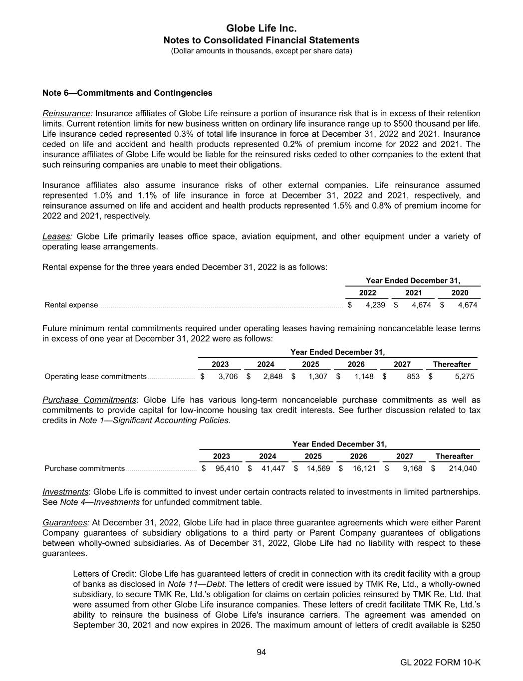 Note 6—Commitments and Contingencies Reinsurance: Insurance affiliates of Globe Life reinsure a portion of insurance risk that is in excess of their retention limits. Current retention limits for new business written on ordinary life insurance range up to $500 thousand per life. Life insurance ceded represented 0.3% of total life insurance in force at December 31, 2022 and 2021. Insurance ceded on life and accident and health products represented 0.2% of premium income for 2022 and 2021. The insurance affiliates of Globe Life would be liable for the reinsured risks ceded to other companies to the extent that such reinsuring companies are unable to meet their obligations. Insurance affiliates also assume insurance risks of other external companies. Life reinsurance assumed represented 1.0% and 1.1% of life insurance in force at December 31, 2022 and 2021, respectively, and reinsurance assumed on life and accident and health products represented 1.5% and 0.8% of premium income for 2022 and 2021, respectively. Leases: Globe Life primarily leases office space, aviation equipment, and other equipment under a variety of operating lease arrangements. Rental expense for the three years ended December 31, 2022 is as follows: Year Ended December 31, 2022 2021 2020 Rental expense ............................................................................................................................... $ 4,239 $ 4,674 $ 4,674 Future minimum rental commitments required under operating leases having remaining noncancelable lease terms in excess of one year at December 31, 2022 were as follows: Year Ended December 31, 2023 2024 2025 2026 2027 Thereafter Operating lease commitments ......................... $ 3,706 $ 2,848 $ 1,307 $ 1,148 $ 853 $ 5,275 Purchase Commitments: Globe Life has various long-term noncancelable purchase commitments as well as commitments to provide capital for low-income housing tax credit interests. See further discussion related to tax credits in Note 1—Significant Accounting Policies. Year Ended December 31, 2023 2024 2025 2026 2027 Thereafter Purchase commitments ..................................... $ 95,410 $ 41,447 $ 14,569 $ 16,121 $ 9,168 $ 214,040 Investments: Globe Life is committed to invest under certain contracts related to investments in limited partnerships. See Note 4—Investments for unfunded commitment table. Guarantees: At December 31, 2022, Globe Life had in place three guarantee agreements which were either Parent Company guarantees of subsidiary obligations to a third party or Parent Company guarantees of obligations between wholly-owned subsidiaries. As of December 31, 2022, Globe Life had no liability with respect to these guarantees. Letters of Credit: Globe Life has guaranteed letters of credit in connection with its credit facility with a group of banks as disclosed in Note 11—Debt. The letters of credit were issued by TMK Re, Ltd., a wholly-owned subsidiary, to secure TMK Re, Ltd.’s obligation for claims on certain policies reinsured by TMK Re, Ltd. that were assumed from other Globe Life insurance companies. These letters of credit facilitate TMK Re, Ltd.’s ability to reinsure the business of Globe Life's insurance carriers. The agreement was amended on September 30, 2021 and now expires in 2026. The maximum amount of letters of credit available is $250 Globe Life Inc. Notes to Consolidated Financial Statements (Dollar amounts in thousands, except per share data) 94 GL 2022 FORM 10-K