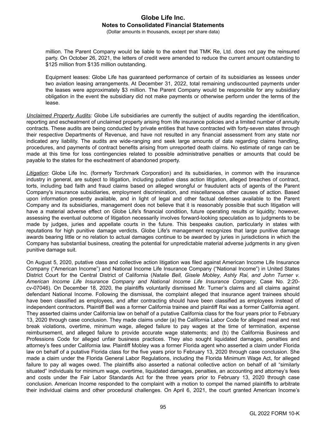 million. The Parent Company would be liable to the extent that TMK Re, Ltd. does not pay the reinsured party. On October 26, 2021, the letters of credit were amended to reduce the current amount outstanding to $125 million from $135 million outstanding. Equipment leases: Globe Life has guaranteed performance of certain of its subsidiaries as lessees under two aviation leasing arrangements. At December 31, 2022, total remaining undiscounted payments under the leases were approximately $3 million. The Parent Company would be responsible for any subsidiary obligation in the event the subsidiary did not make payments or otherwise perform under the terms of the lease. Unclaimed Property Audits: Globe Life subsidiaries are currently the subject of audits regarding the identification, reporting and escheatment of unclaimed property arising from life insurance policies and a limited number of annuity contracts. These audits are being conducted by private entities that have contracted with forty-seven states through their respective Departments of Revenue, and have not resulted in any financial assessment from any state nor indicated any liability. The audits are wide-ranging and seek large amounts of data regarding claims handling, procedures, and payments of contract benefits arising from unreported death claims. No estimate of range can be made at this time for loss contingencies related to possible administrative penalties or amounts that could be payable to the states for the escheatment of abandoned property. Litigation: Globe Life Inc. (formerly Torchmark Corporation) and its subsidiaries, in common with the insurance industry in general, are subject to litigation, including putative class action litigation, alleged breaches of contract, torts, including bad faith and fraud claims based on alleged wrongful or fraudulent acts of agents of the Parent Company's insurance subsidiaries, employment discrimination, and miscellaneous other causes of action. Based upon information presently available, and in light of legal and other factual defenses available to the Parent Company and its subsidiaries, management does not believe that it is reasonably possible that such litigation will have a material adverse effect on Globe Life's financial condition, future operating results or liquidity; however, assessing the eventual outcome of litigation necessarily involves forward-looking speculation as to judgments to be made by judges, juries and appellate courts in the future. This bespeaks caution, particularly in states with reputations for high punitive damage verdicts. Globe Life's management recognizes that large punitive damage awards bearing little or no relation to actual damages continue to be awarded by juries in jurisdictions in which the Company has substantial business, creating the potential for unpredictable material adverse judgments in any given punitive damage suit. On August 5, 2020, putative class and collective action litigation was filed against American Income Life Insurance Company (“American Income”) and National Income Life Insurance Company (“National Income”) in United States District Court for the Central District of California (Natalie Bell, Gisele Mobley, Ashly Rai, and John Turner v. American Income Life Insurance Company and National Income Life Insurance Company, Case No. 2:20- cv-07046). On December 18, 2020, the plaintiffs voluntarily dismissed Mr. Turner’s claims and all claims against defendant National Income. Following the dismissal, the complaint alleged that insurance agent trainees should have been classified as employees, and after contracting should have been classified as employees instead of independent contractors. Plaintiff Bell was a former California trainee and plaintiff Rai was a former California agent. They asserted claims under California law on behalf of a putative California class for the four years prior to February 13, 2020 through case conclusion. They made claims under (a) the California Labor Code for alleged meal and rest break violations, overtime, minimum wage, alleged failure to pay wages at the time of termination, expense reimbursement, and alleged failure to provide accurate wage statements; and (b) the California Business and Professions Code for alleged unfair business practices. They also sought liquidated damages, penalties and attorney’s fees under California law. Plaintiff Mobley was a former Florida agent who asserted a claim under Florida law on behalf of a putative Florida class for the five years prior to February 13, 2020 through case conclusion. She made a claim under the Florida General Labor Regulations, including the Florida Minimum Wage Act, for alleged failure to pay all wages owed. The plaintiffs also asserted a national collective action on behalf of all “similarly situated” individuals for minimum wage, overtime, liquidated damages, penalties, an accounting and attorney’s fees and costs under the Fair Labor Standards Act for the three years prior to February 13, 2020 through case conclusion. American Income responded to the complaint with a motion to compel the named plaintiffs to arbitrate their individual claims and other procedural challenges. On April 6, 2021, the court granted American Income’s Globe Life Inc. Notes to Consolidated Financial Statements (Dollar amounts in thousands, except per share data) 95 GL 2022 FORM 10-K