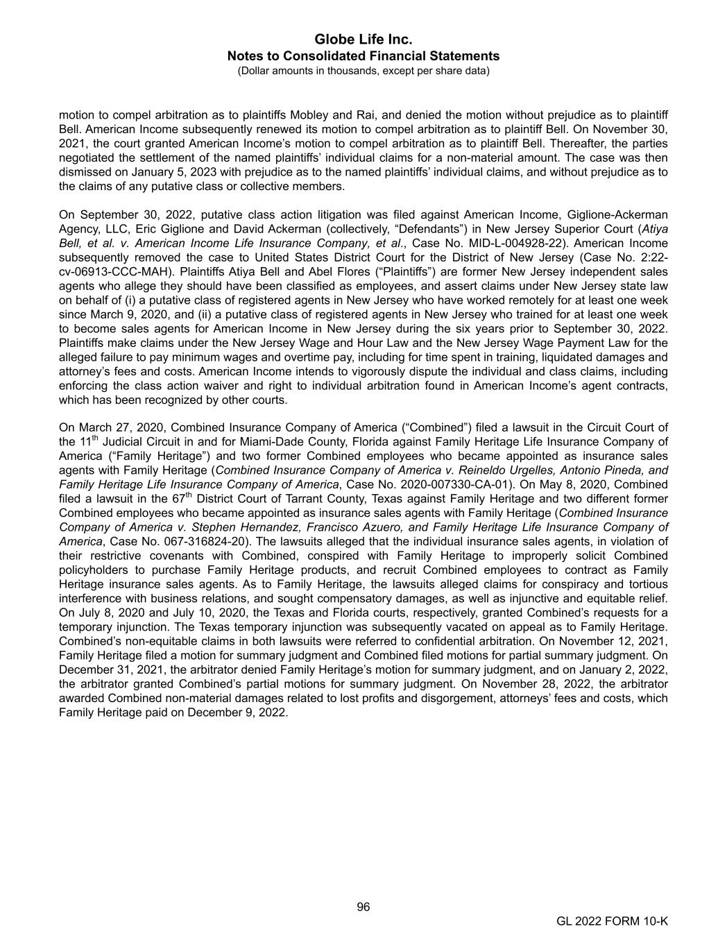 motion to compel arbitration as to plaintiffs Mobley and Rai, and denied the motion without prejudice as to plaintiff Bell. American Income subsequently renewed its motion to compel arbitration as to plaintiff Bell. On November 30, 2021, the court granted American Income’s motion to compel arbitration as to plaintiff Bell. Thereafter, the parties negotiated the settlement of the named plaintiffs’ individual claims for a non-material amount. The case was then dismissed on January 5, 2023 with prejudice as to the named plaintiffs’ individual claims, and without prejudice as to the claims of any putative class or collective members. On September 30, 2022, putative class action litigation was filed against American Income, Giglione-Ackerman Agency, LLC, Eric Giglione and David Ackerman (collectively, “Defendants”) in New Jersey Superior Court (Atiya Bell, et al. v. American Income Life Insurance Company, et al., Case No. MID-L-004928-22). American Income subsequently removed the case to United States District Court for the District of New Jersey (Case No. 2:22- cv-06913-CCC-MAH). Plaintiffs Atiya Bell and Abel Flores (“Plaintiffs”) are former New Jersey independent sales agents who allege they should have been classified as employees, and assert claims under New Jersey state law on behalf of (i) a putative class of registered agents in New Jersey who have worked remotely for at least one week since March 9, 2020, and (ii) a putative class of registered agents in New Jersey who trained for at least one week to become sales agents for American Income in New Jersey during the six years prior to September 30, 2022. Plaintiffs make claims under the New Jersey Wage and Hour Law and the New Jersey Wage Payment Law for the alleged failure to pay minimum wages and overtime pay, including for time spent in training, liquidated damages and attorney’s fees and costs. American Income intends to vigorously dispute the individual and class claims, including enforcing the class action waiver and right to individual arbitration found in American Income’s agent contracts, which has been recognized by other courts. On March 27, 2020, Combined Insurance Company of America (“Combined”) filed a lawsuit in the Circuit Court of the 11th Judicial Circuit in and for Miami-Dade County, Florida against Family Heritage Life Insurance Company of America (“Family Heritage”) and two former Combined employees who became appointed as insurance sales agents with Family Heritage (Combined Insurance Company of America v. Reineldo Urgelles, Antonio Pineda, and Family Heritage Life Insurance Company of America, Case No. 2020-007330-CA-01). On May 8, 2020, Combined filed a lawsuit in the 67th District Court of Tarrant County, Texas against Family Heritage and two different former Combined employees who became appointed as insurance sales agents with Family Heritage (Combined Insurance Company of America v. Stephen Hernandez, Francisco Azuero, and Family Heritage Life Insurance Company of America, Case No. 067-316824-20). The lawsuits alleged that the individual insurance sales agents, in violation of their restrictive covenants with Combined, conspired with Family Heritage to improperly solicit Combined policyholders to purchase Family Heritage products, and recruit Combined employees to contract as Family Heritage insurance sales agents. As to Family Heritage, the lawsuits alleged claims for conspiracy and tortious interference with business relations, and sought compensatory damages, as well as injunctive and equitable relief. On July 8, 2020 and July 10, 2020, the Texas and Florida courts, respectively, granted Combined’s requests for a temporary injunction. The Texas temporary injunction was subsequently vacated on appeal as to Family Heritage. Combined’s non-equitable claims in both lawsuits were referred to confidential arbitration. On November 12, 2021, Family Heritage filed a motion for summary judgment and Combined filed motions for partial summary judgment. On December 31, 2021, the arbitrator denied Family Heritage’s motion for summary judgment, and on January 2, 2022, the arbitrator granted Combined’s partial motions for summary judgment. On November 28, 2022, the arbitrator awarded Combined non-material damages related to lost profits and disgorgement, attorneys’ fees and costs, which Family Heritage paid on December 9, 2022. Globe Life Inc. Notes to Consolidated Financial Statements (Dollar amounts in thousands, except per share data) 96 GL 2022 FORM 10-K