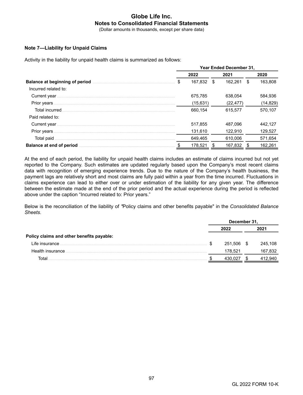 Note 7—Liability for Unpaid Claims Activity in the liability for unpaid health claims is summarized as follows: Year Ended December 31, 2022 2021 2020 Balance at beginning of period .......................................................................... $ 167,832 $ 162,261 $ 163,808 Incurred related to: Current year .......................................................................................................... 675,785 638,054 584,936 Prior years ............................................................................................................. (15,631) (22,477) (14,829) Total incurred...................................................................................................... 660,154 615,577 570,107 Paid related to: Current year .......................................................................................................... 517,855 487,096 442,127 Prior years ............................................................................................................. 131,610 122,910 129,527 Total paid ............................................................................................................ 649,465 610,006 571,654 Balance at end of period ...................................................................................... $ 178,521 $ 167,832 $ 162,261 At the end of each period, the liability for unpaid health claims includes an estimate of claims incurred but not yet reported to the Company. Such estimates are updated regularly based upon the Company’s most recent claims data with recognition of emerging experience trends. Due to the nature of the Company’s health business, the payment lags are relatively short and most claims are fully paid within a year from the time incurred. Fluctuations in claims experience can lead to either over or under estimation of the liability for any given year. The difference between the estimate made at the end of the prior period and the actual experience during the period is reflected above under the caption “Incurred related to: Prior years.” Below is the reconciliation of the liability of "Policy claims and other benefits payable" in the Consolidated Balance Sheets. December 31, 2022 2021 Policy claims and other benefits payable: Life insurance .................................................................................................................................... $ 251,506 $ 245,108 Health insurance ............................................................................................................................... 178,521 167,832 Total............................................................................................................................................... $ 430,027 $ 412,940 Globe Life Inc. Notes to Consolidated Financial Statements (Dollar amounts in thousands, except per share data) 97 GL 2022 FORM 10-K