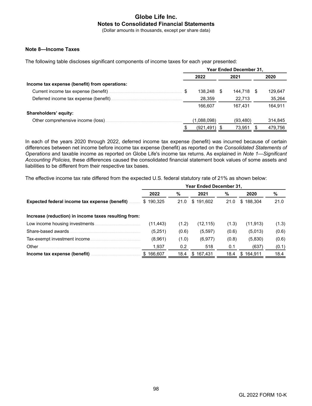 Note 8—Income Taxes The following table discloses significant components of income taxes for each year presented: Year Ended December 31, 2022 2021 2020 Income tax expense (benefit) from operations: Current income tax expense (benefit) ................................................................ $ 138,248 $ 144,718 $ 129,647 Deferred income tax expense (benefit).............................................................. 28,359 22,713 35,264 166,607 167,431 164,911 Shareholders’ equity: Other comprehensive income (loss)................................................................... (1,088,098) (93,480) 314,845 $ (921,491) $ 73,951 $ 479,756 In each of the years 2020 through 2022, deferred income tax expense (benefit) was incurred because of certain differences between net income before income tax expense (benefit) as reported on the Consolidated Statements of Operations and taxable income as reported on Globe Life's income tax returns. As explained in Note 1—Significant Accounting Policies, these differences caused the consolidated financial statement book values of some assets and liabilities to be different from their respective tax bases. The effective income tax rate differed from the expected U.S. federal statutory rate of 21% as shown below: Year Ended December 31, 2022 % 2021 % 2020 % Expected federal income tax expense (benefit) .......... $ 190,325 21.0 $ 191,602 21.0 $ 188,304 21.0 Increase (reduction) in income taxes resulting from: Low income housing investments ........................................ (11,443) (1.2) (12,115) (1.3) (11,913) (1.3) Share-based awards .............................................................. (5,251) (0.6) (5,597) (0.6) (5,013) (0.6) Tax-exempt investment income............................................ (8,961) (1.0) (6,977) (0.8) (5,830) (0.6) Other......................................................................................... 1,937 0.2 518 0.1 (637) (0.1) Income tax expense (benefit) ........................................... $ 166,607 18.4 $ 167,431 18.4 $ 164,911 18.4 Globe Life Inc. Notes to Consolidated Financial Statements (Dollar amounts in thousands, except per share data) 98 GL 2022 FORM 10-K