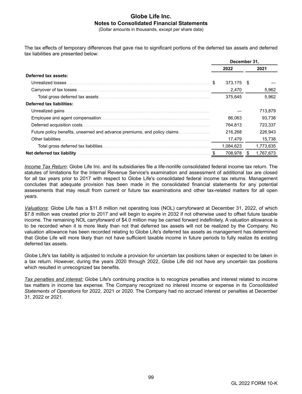 The tax effects of temporary differences that gave rise to significant portions of the deferred tax assets and deferred tax liabilities are presented below: December 31, 2022 2021 Deferred tax assets: Unrealized losses ................................................................................................................................. $ 373,175 $ — Carryover of tax losses........................................................................................................................ 2,470 5,962 Total gross deferred tax assets .................................................................................................... 375,645 5,962 Deferred tax liabilities: Unrealized gains................................................................................................................................... — 713,879 Employee and agent compensation.................................................................................................. 86,063 93,738 Deferred acquisition costs................................................................................................................... 764,813 723,337 Future policy benefits, unearned and advance premiums, and policy claims ............................ 216,268 226,943 Other liabilities ...................................................................................................................................... 17,479 15,738 Total gross deferred tax liabilities................................................................................................. 1,084,623 1,773,635 Net deferred tax liability ....................................................................................................................... $ 708,978 $ 1,767,673 Income Tax Return: Globe Life Inc. and its subsidiaries file a life-nonlife consolidated federal income tax return. The statutes of limitations for the Internal Revenue Service's examination and assessment of additional tax are closed for all tax years prior to 2017 with respect to Globe Life's consolidated federal income tax returns. Management concludes that adequate provision has been made in the consolidated financial statements for any potential assessments that may result from current or future tax examinations and other tax-related matters for all open years. Valuations: Globe Life has a $11.8 million net operating loss (NOL) carryforward at December 31, 2022, of which $7.8 million was created prior to 2017 and will begin to expire in 2032 if not otherwise used to offset future taxable income. The remaining NOL carryforward of $4.0 million may be carried forward indefinitely. A valuation allowance is to be recorded when it is more likely than not that deferred tax assets will not be realized by the Company. No valuation allowance has been recorded relating to Globe Life's deferred tax assets as management has determined that Globe Life will more likely than not have sufficient taxable income in future periods to fully realize its existing deferred tax assets. Globe Life's tax liability is adjusted to include a provision for uncertain tax positions taken or expected to be taken in a tax return. However, during the years 2020 through 2022, Globe Life did not have any uncertain tax positions which resulted in unrecognized tax benefits. Tax penalties and interest: Globe Life's continuing practice is to recognize penalties and interest related to income tax matters in income tax expense. The Company recognized no interest income or expense in its Consolidated Statements of Operations for 2022, 2021 or 2020. The Company had no accrued interest or penalties at December 31, 2022 or 2021. Globe Life Inc. Notes to Consolidated Financial Statements (Dollar amounts in thousands, except per share data) 99 GL 2022 FORM 10-K