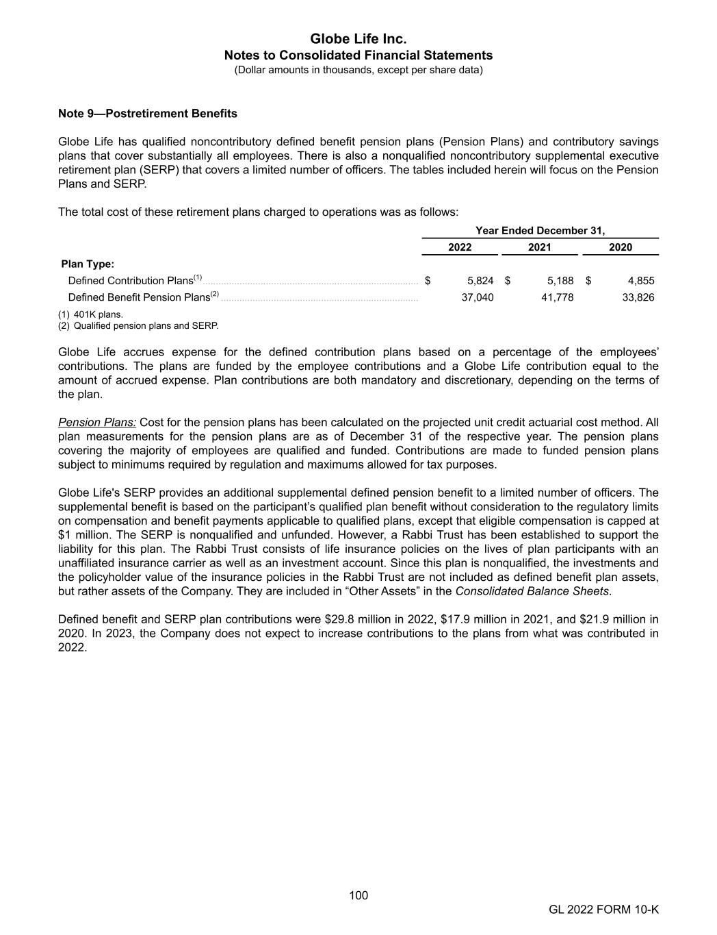 Note 9—Postretirement Benefits Globe Life has qualified noncontributory defined benefit pension plans (Pension Plans) and contributory savings plans that cover substantially all employees. There is also a nonqualified noncontributory supplemental executive retirement plan (SERP) that covers a limited number of officers. The tables included herein will focus on the Pension Plans and SERP. The total cost of these retirement plans charged to operations was as follows: Year Ended December 31, 2022 2021 2020 Plan Type: Defined Contribution Plans(1).................................................................................. $ 5,824 $ 5,188 $ 4,855 Defined Benefit Pension Plans(2) ........................................................................... 37,040 41,778 33,826 (1) 401K plans. (2) Qualified pension plans and SERP. Globe Life accrues expense for the defined contribution plans based on a percentage of the employees’ contributions. The plans are funded by the employee contributions and a Globe Life contribution equal to the amount of accrued expense. Plan contributions are both mandatory and discretionary, depending on the terms of the plan. Pension Plans: Cost for the pension plans has been calculated on the projected unit credit actuarial cost method. All plan measurements for the pension plans are as of December 31 of the respective year. The pension plans covering the majority of employees are qualified and funded. Contributions are made to funded pension plans subject to minimums required by regulation and maximums allowed for tax purposes. Globe Life's SERP provides an additional supplemental defined pension benefit to a limited number of officers. The supplemental benefit is based on the participant’s qualified plan benefit without consideration to the regulatory limits on compensation and benefit payments applicable to qualified plans, except that eligible compensation is capped at $1 million. The SERP is nonqualified and unfunded. However, a Rabbi Trust has been established to support the liability for this plan. The Rabbi Trust consists of life insurance policies on the lives of plan participants with an unaffiliated insurance carrier as well as an investment account. Since this plan is nonqualified, the investments and the policyholder value of the insurance policies in the Rabbi Trust are not included as defined benefit plan assets, but rather assets of the Company. They are included in “Other Assets” in the Consolidated Balance Sheets. Defined benefit and SERP plan contributions were $29.8 million in 2022, $17.9 million in 2021, and $21.9 million in 2020. In 2023, the Company does not expect to increase contributions to the plans from what was contributed in 2022. Globe Life Inc. Notes to Consolidated Financial Statements (Dollar amounts in thousands, except per share data) 100 GL 2022 FORM 10-K