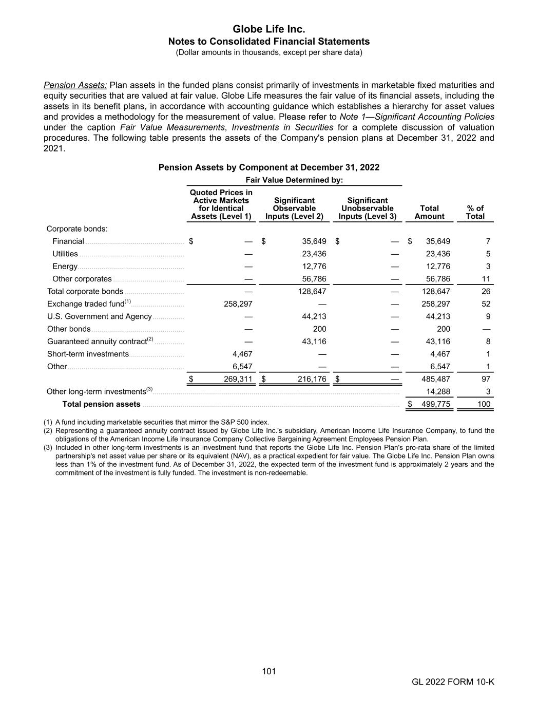 Pension Assets: Plan assets in the funded plans consist primarily of investments in marketable fixed maturities and equity securities that are valued at fair value. Globe Life measures the fair value of its financial assets, including the assets in its benefit plans, in accordance with accounting guidance which establishes a hierarchy for asset values and provides a methodology for the measurement of value. Please refer to Note 1—Significant Accounting Policies under the caption Fair Value Measurements, Investments in Securities for a complete discussion of valuation procedures. The following table presents the assets of the Company's pension plans at December 31, 2022 and 2021. Pension Assets by Component at December 31, 2022 Fair Value Determined by: Quoted Prices in Active Markets for Identical Assets (Level 1) Significant Observable Inputs (Level 2) Significant Unobservable Inputs (Level 3) Total Amount % of Total Corporate bonds: Financial .................................................. $ — $ 35,649 $ — $ 35,649 7 Utilities ..................................................... — 23,436 — 23,436 5 Energy...................................................... — 12,776 — 12,776 3 Other corporates .................................... — 56,786 — 56,786 11 Total corporate bonds .............................. — 128,647 — 128,647 26 Exchange traded fund(1)........................... 258,297 — — 258,297 52 U.S. Government and Agency ................ — 44,213 — 44,213 9 Other bonds............................................... — 200 — 200 — Guaranteed annuity contract(2) ............... — 43,116 — 43,116 8 Short-term investments............................ 4,467 — — 4,467 1 Other........................................................... 6,547 — — 6,547 1 $ 269,311 $ 216,176 $ — 485,487 97 Other long-term investments(3)............................................................................................................................. 14,288 3 Total pension assets .................................................................................................................................. $ 499,775 100 (1) A fund including marketable securities that mirror the S&P 500 index. (2) Representing a guaranteed annuity contract issued by Globe Life Inc.'s subsidiary, American Income Life Insurance Company, to fund the obligations of the American Income Life Insurance Company Collective Bargaining Agreement Employees Pension Plan. (3) Included in other long-term investments is an investment fund that reports the Globe Life Inc. Pension Plan's pro-rata share of the limited partnership's net asset value per share or its equivalent (NAV), as a practical expedient for fair value. The Globe Life Inc. Pension Plan owns less than 1% of the investment fund. As of December 31, 2022, the expected term of the investment fund is approximately 2 years and the commitment of the investment is fully funded. The investment is non-redeemable. Globe Life Inc. Notes to Consolidated Financial Statements (Dollar amounts in thousands, except per share data) 101 GL 2022 FORM 10-K