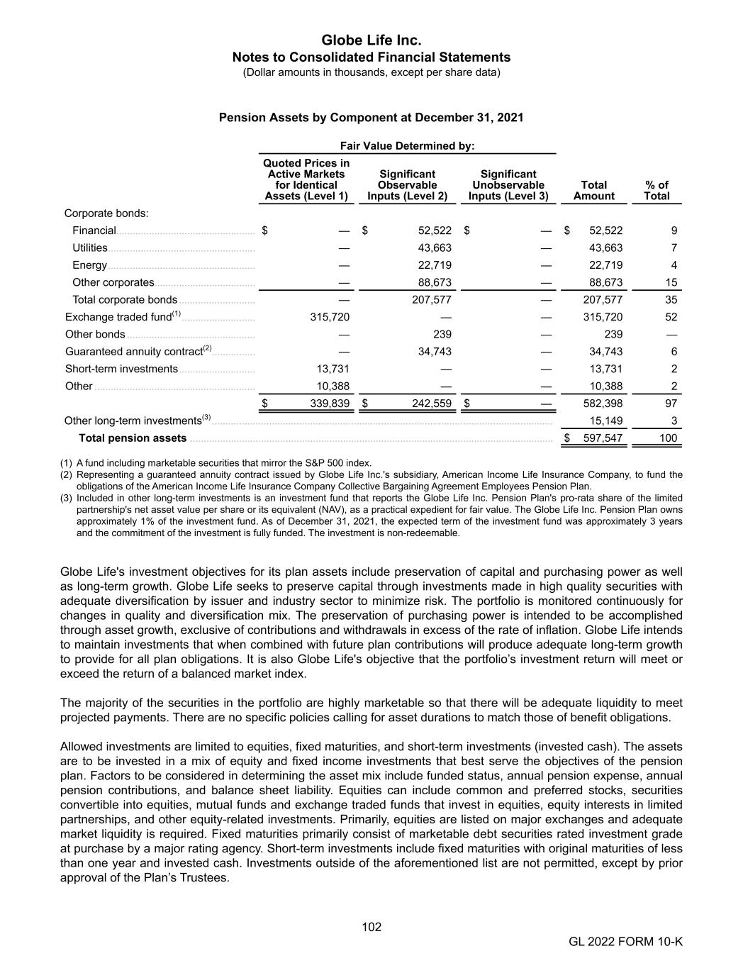 Pension Assets by Component at December 31, 2021 Fair Value Determined by: Quoted Prices in Active Markets for Identical Assets (Level 1) Significant Observable Inputs (Level 2) Significant Unobservable Inputs (Level 3) Total Amount % of Total Corporate bonds: Financial................................................... $ — $ 52,522 $ — $ 52,522 9 Utilities...................................................... — 43,663 — 43,663 7 Energy...................................................... — 22,719 — 22,719 4 Other corporates..................................... — 88,673 — 88,673 15 Total corporate bonds ............................ — 207,577 — 207,577 35 Exchange traded fund(1) ........................... 315,720 — — 315,720 52 Other bonds ............................................... — 239 — 239 — Guaranteed annuity contract(2)................ — 34,743 — 34,743 6 Short-term investments............................ 13,731 — — 13,731 2 Other ........................................................... 10,388 — — 10,388 2 $ 339,839 $ 242,559 $ — 582,398 97 Other long-term investments(3) ............................................................................................................................. 15,149 3 Total pension assets ..................................................................................................................................... $ 597,547 100 (1) A fund including marketable securities that mirror the S&P 500 index. (2) Representing a guaranteed annuity contract issued by Globe Life Inc.'s subsidiary, American Income Life Insurance Company, to fund the obligations of the American Income Life Insurance Company Collective Bargaining Agreement Employees Pension Plan. (3) Included in other long-term investments is an investment fund that reports the Globe Life Inc. Pension Plan's pro-rata share of the limited partnership's net asset value per share or its equivalent (NAV), as a practical expedient for fair value. The Globe Life Inc. Pension Plan owns approximately 1% of the investment fund. As of December 31, 2021, the expected term of the investment fund was approximately 3 years and the commitment of the investment is fully funded. The investment is non-redeemable. Globe Life's investment objectives for its plan assets include preservation of capital and purchasing power as well as long-term growth. Globe Life seeks to preserve capital through investments made in high quality securities with adequate diversification by issuer and industry sector to minimize risk. The portfolio is monitored continuously for changes in quality and diversification mix. The preservation of purchasing power is intended to be accomplished through asset growth, exclusive of contributions and withdrawals in excess of the rate of inflation. Globe Life intends to maintain investments that when combined with future plan contributions will produce adequate long-term growth to provide for all plan obligations. It is also Globe Life's objective that the portfolio’s investment return will meet or exceed the return of a balanced market index. The majority of the securities in the portfolio are highly marketable so that there will be adequate liquidity to meet projected payments. There are no specific policies calling for asset durations to match those of benefit obligations. Allowed investments are limited to equities, fixed maturities, and short-term investments (invested cash). The assets are to be invested in a mix of equity and fixed income investments that best serve the objectives of the pension plan. Factors to be considered in determining the asset mix include funded status, annual pension expense, annual pension contributions, and balance sheet liability. Equities can include common and preferred stocks, securities convertible into equities, mutual funds and exchange traded funds that invest in equities, equity interests in limited partnerships, and other equity-related investments. Primarily, equities are listed on major exchanges and adequate market liquidity is required. Fixed maturities primarily consist of marketable debt securities rated investment grade at purchase by a major rating agency. Short-term investments include fixed maturities with original maturities of less than one year and invested cash. Investments outside of the aforementioned list are not permitted, except by prior approval of the Plan’s Trustees. Globe Life Inc. Notes to Consolidated Financial Statements (Dollar amounts in thousands, except per share data) 102 GL 2022 FORM 10-K