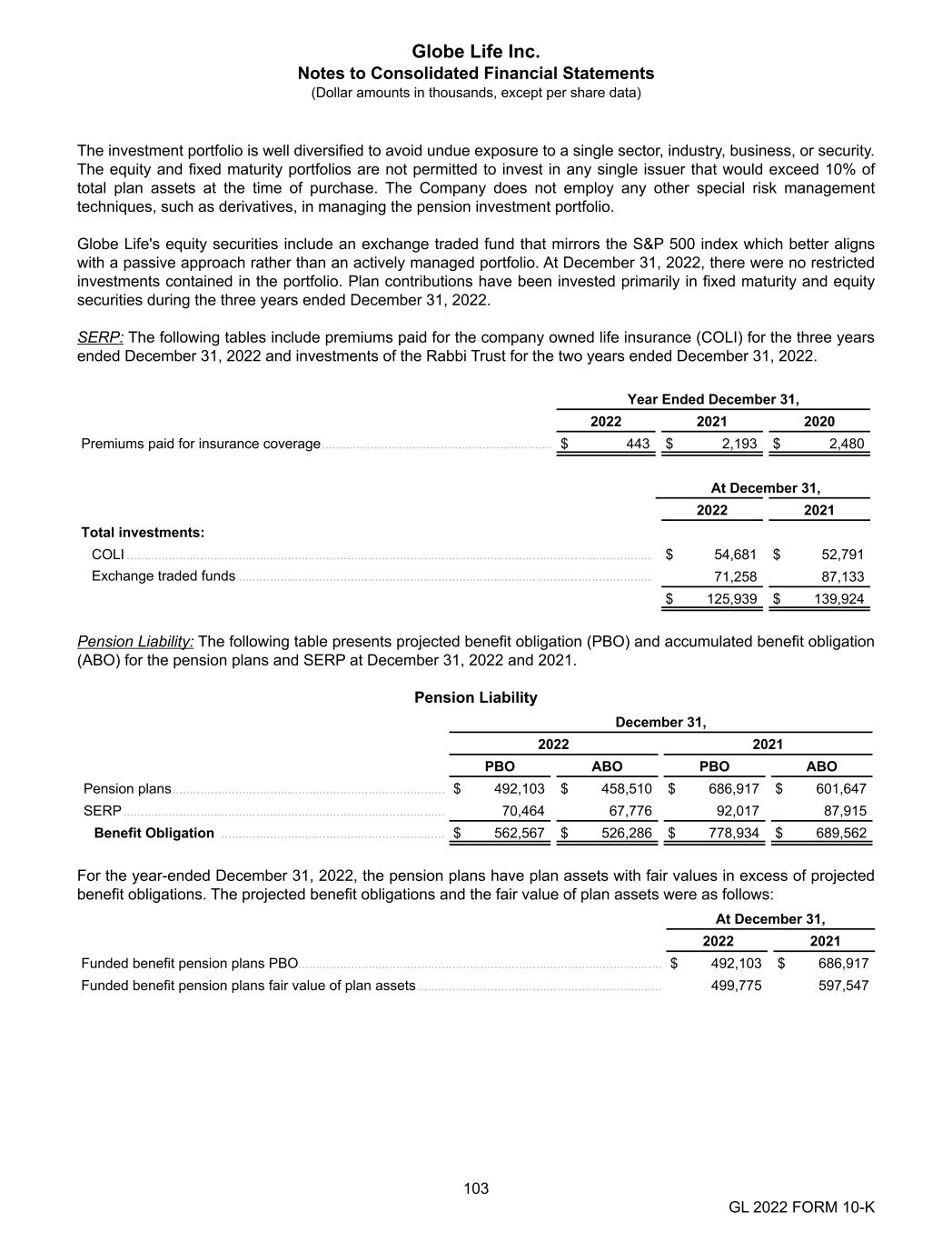 The investment portfolio is well diversified to avoid undue exposure to a single sector, industry, business, or security. The equity and fixed maturity portfolios are not permitted to invest in any single issuer that would exceed 10% of total plan assets at the time of purchase. The Company does not employ any other special risk management techniques, such as derivatives, in managing the pension investment portfolio. Globe Life's equity securities include an exchange traded fund that mirrors the S&P 500 index which better aligns with a passive approach rather than an actively managed portfolio. At December 31, 2022, there were no restricted investments contained in the portfolio. Plan contributions have been invested primarily in fixed maturity and equity securities during the three years ended December 31, 2022. SERP: The following tables include premiums paid for the company owned life insurance (COLI) for the three years ended December 31, 2022 and investments of the Rabbi Trust for the two years ended December 31, 2022. Year Ended December 31, 2022 2021 2020 Premiums paid for insurance coverage.................................................................. $ 443 $ 2,193 $ 2,480 At December 31, 2022 2021 Total investments: COLI ...................................................................................................................................................... $ 54,681 $ 52,791 Exchange traded funds ...................................................................................................................... 71,258 87,133 $ 125,939 $ 139,924 Pension Liability: The following table presents projected benefit obligation (PBO) and accumulated benefit obligation (ABO) for the pension plans and SERP at December 31, 2022 and 2021. Pension Liability December 31, 2022 2021 PBO ABO PBO ABO Pension plans.............................................................................. $ 492,103 $ 458,510 $ 686,917 $ 601,647 SERP ............................................................................................ 70,464 67,776 92,017 87,915 Benefit Obligation ................................................................ $ 562,567 $ 526,286 $ 778,934 $ 689,562 For the year-ended December 31, 2022, the pension plans have plan assets with fair values in excess of projected benefit obligations. The projected benefit obligations and the fair value of plan assets were as follows: At December 31, 2022 2021 Funded benefit pension plans PBO........................................................................................................ $ 492,103 $ 686,917 Funded benefit pension plans fair value of plan assets ...................................................................... 499,775 597,547 Globe Life Inc. Notes to Consolidated Financial Statements (Dollar amounts in thousands, except per share data) 103 GL 2022 FORM 10-K