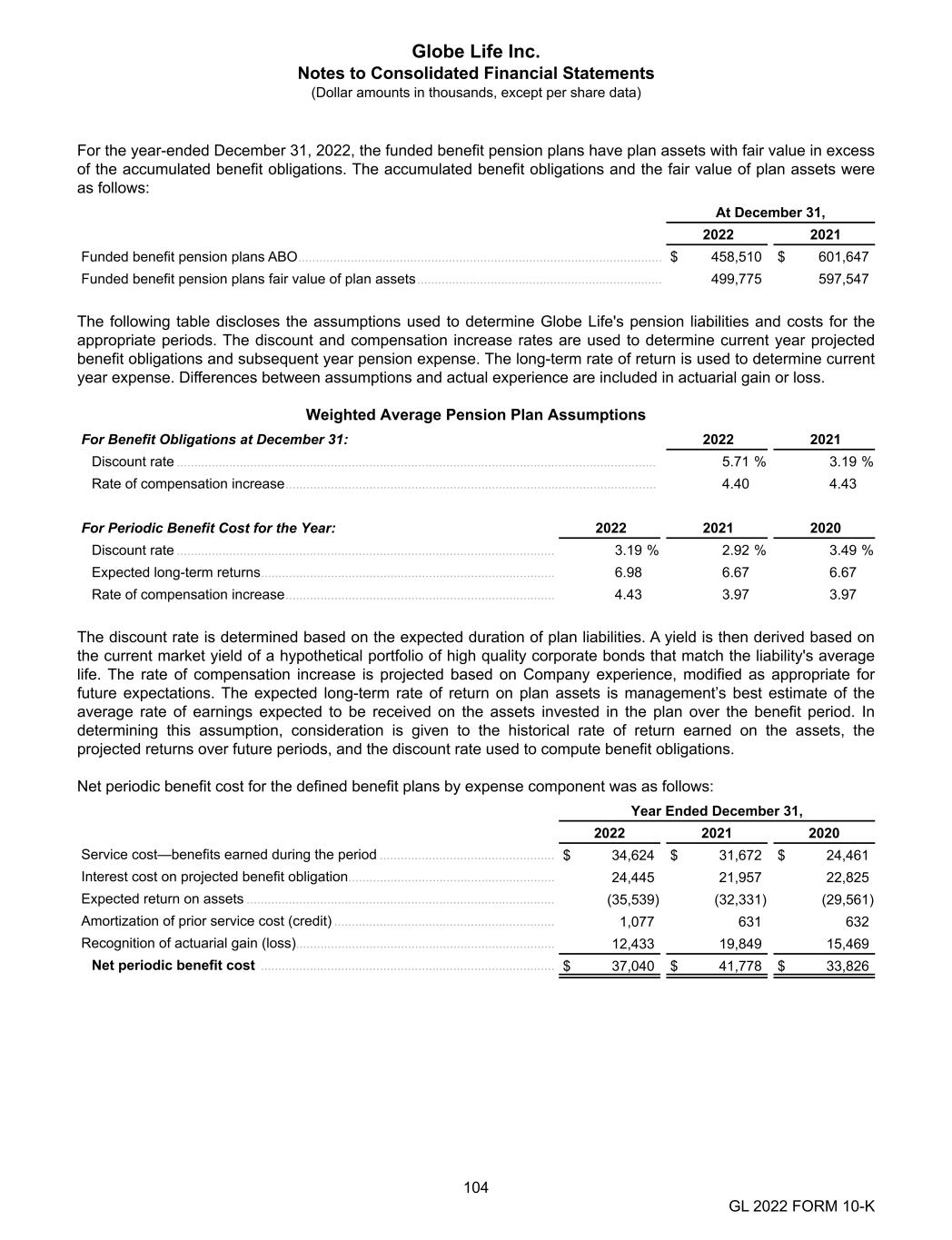 For the year-ended December 31, 2022, the funded benefit pension plans have plan assets with fair value in excess of the accumulated benefit obligations. The accumulated benefit obligations and the fair value of plan assets were as follows: At December 31, 2022 2021 Funded benefit pension plans ABO........................................................................................................ $ 458,510 $ 601,647 Funded benefit pension plans fair value of plan assets ...................................................................... 499,775 597,547 The following table discloses the assumptions used to determine Globe Life's pension liabilities and costs for the appropriate periods. The discount and compensation increase rates are used to determine current year projected benefit obligations and subsequent year pension expense. The long-term rate of return is used to determine current year expense. Differences between assumptions and actual experience are included in actuarial gain or loss. Weighted Average Pension Plan Assumptions For Benefit Obligations at December 31: 2022 2021 Discount rate ......................................................................................................................................... 5.71 % 3.19 % Rate of compensation increase.......................................................................................................... 4.40 4.43 For Periodic Benefit Cost for the Year: 2022 2021 2020 Discount rate ............................................................................................................ 3.19 % 2.92 % 3.49 % Expected long-term returns.................................................................................... 6.98 6.67 6.67 Rate of compensation increase............................................................................. 4.43 3.97 3.97 The discount rate is determined based on the expected duration of plan liabilities. A yield is then derived based on the current market yield of a hypothetical portfolio of high quality corporate bonds that match the liability's average life. The rate of compensation increase is projected based on Company experience, modified as appropriate for future expectations. The expected long-term rate of return on plan assets is management’s best estimate of the average rate of earnings expected to be received on the assets invested in the plan over the benefit period. In determining this assumption, consideration is given to the historical rate of return earned on the assets, the projected returns over future periods, and the discount rate used to compute benefit obligations. Net periodic benefit cost for the defined benefit plans by expense component was as follows: Year Ended December 31, 2022 2021 2020 Service cost—benefits earned during the period .................................................. $ 34,624 $ 31,672 $ 24,461 Interest cost on projected benefit obligation........................................................... 24,445 21,957 22,825 Expected return on assets ........................................................................................ (35,539) (32,331) (29,561) Amortization of prior service cost (credit) ............................................................... 1,077 631 632 Recognition of actuarial gain (loss).......................................................................... 12,433 19,849 15,469 Net periodic benefit cost .................................................................................... $ 37,040 $ 41,778 $ 33,826 Globe Life Inc. Notes to Consolidated Financial Statements (Dollar amounts in thousands, except per share data) 104 GL 2022 FORM 10-K