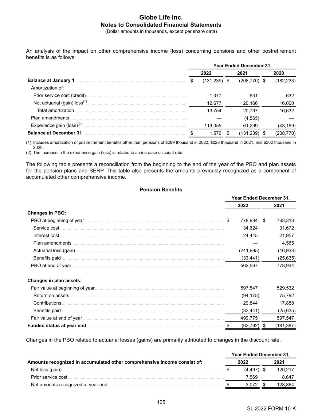 An analysis of the impact on other comprehensive income (loss) concerning pensions and other postretirement benefits is as follows: Year Ended December 31, 2022 2021 2020 Balance at January 1 .............................................................................................. $ (131,239) $ (208,770) $ (182,233) Amortization of: Prior service cost (credit)...................................................................................... 1,077 631 632 Net actuarial (gain) loss(1)..................................................................................... 12,677 20,166 16,000 Total amortization................................................................................................ 13,754 20,797 16,632 Plan amendments.................................................................................................... — (4,565) — Experience gain (loss)(2) ......................................................................................... 119,055 61,299 (43,169) Balance at December 31 ........................................................................................ $ 1,570 $ (131,239) $ (208,770) (1) Includes amortization of postretirement benefits other than pensions of $289 thousand in 2022, $228 thousand in 2021, and $302 thousand in 2020. (2) The increase in the experience gain (loss) is related to an increase discount rate. The following table presents a reconciliation from the beginning to the end of the year of the PBO and plan assets for the pension plans and SERP. This table also presents the amounts previously recognized as a component of accumulated other comprehensive income. Pension Benefits Year Ended December 31, 2022 2021 Changes in PBO: PBO at beginning of year...................................................................................................................... $ 778,934 $ 763,313 Service cost........................................................................................................................................... 34,624 31,672 Interest cost........................................................................................................................................... 24,445 21,957 Plan amendments ................................................................................................................................ — 4,565 Actuarial loss (gain) ............................................................................................................................. (241,995) (16,938) Benefits paid ......................................................................................................................................... (33,441) (25,635) PBO at end of year................................................................................................................................. 562,567 778,934 Changes in plan assets: Fair value at beginning of year............................................................................................................. 597,547 529,532 Return on assets .................................................................................................................................. (94,175) 75,792 Contributions ......................................................................................................................................... 29,844 17,858 Benefits paid ......................................................................................................................................... (33,441) (25,635) Fair value at end of year ....................................................................................................................... 499,775 597,547 Funded status at year end ................................................................................................................... $ (62,792) $ (181,387) Changes in the PBO related to actuarial losses (gains) are primarily attributed to changes in the discount rate. Year Ended December 31, Amounts recognized in accumulated other comprehensive income consist of: 2022 2021 Net loss (gain)......................................................................................................................................... $ (4,497) $ 120,217 Prior service cost.................................................................................................................................... 7,569 8,647 Net amounts recognized at year end .................................................................................................. $ 3,072 $ 128,864 Globe Life Inc. Notes to Consolidated Financial Statements (Dollar amounts in thousands, except per share data) 105 GL 2022 FORM 10-K