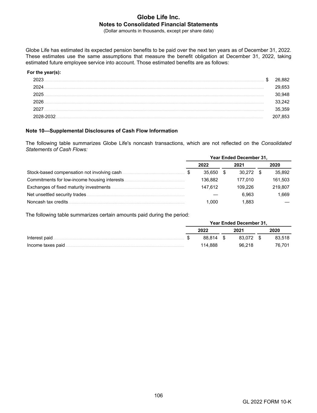Globe Life has estimated its expected pension benefits to be paid over the next ten years as of December 31, 2022. These estimates use the same assumptions that measure the benefit obligation at December 31, 2022, taking estimated future employee service into account. Those estimated benefits are as follows: For the year(s): 2023............................................................................................................................................................................................. $ 26,882 2024............................................................................................................................................................................................. 29,653 2025............................................................................................................................................................................................. 30,948 2026............................................................................................................................................................................................. 33,242 2027............................................................................................................................................................................................. 35,359 2028-2032.................................................................................................................................................................................. 207,853 Note 10—Supplemental Disclosures of Cash Flow Information The following table summarizes Globe Life's noncash transactions, which are not reflected on the Consolidated Statements of Cash Flows: Year Ended December 31, 2022 2021 2020 Stock-based compensation not involving cash...................................................... $ 35,650 $ 30,272 $ 35,892 Commitments for low-income housing interests.................................................... 136,882 177,010 161,503 Exchanges of fixed maturity investments ............................................................... 147,612 109,226 219,807 Net unsettled security trades .................................................................................... — 6,963 1,669 Noncash tax credits.................................................................................................... 1,000 1,883 — The following table summarizes certain amounts paid during the period: Year Ended December 31, 2022 2021 2020 Interest paid................................................................................................................. $ 88,814 $ 83,072 $ 83,518 Income taxes paid ...................................................................................................... 114,888 96,218 76,701 Globe Life Inc. Notes to Consolidated Financial Statements (Dollar amounts in thousands, except per share data) 106 GL 2022 FORM 10-K