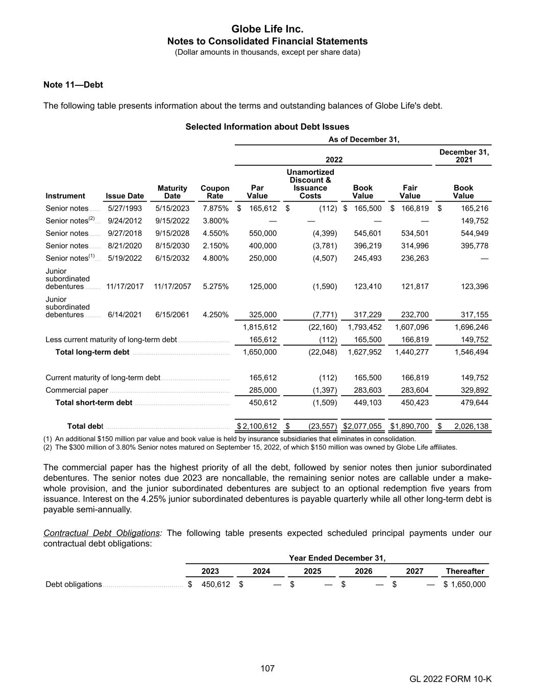 Note 11—Debt The following table presents information about the terms and outstanding balances of Globe Life's debt. Selected Information about Debt Issues As of December 31, 2022 December 31, 2021 Instrument Issue Date Maturity Date Coupon Rate Par Value Unamortized Discount & Issuance Costs Book Value Fair Value Book Value Senior notes ...... 5/27/1993 5/15/2023 7.875% $ 165,612 $ (112) $ 165,500 $ 166,819 $ 165,216 Senior notes(2)... 9/24/2012 9/15/2022 3.800% — — — — 149,752 Senior notes ...... 9/27/2018 9/15/2028 4.550% 550,000 (4,399) 545,601 534,501 544,949 Senior notes ...... 8/21/2020 8/15/2030 2.150% 400,000 (3,781) 396,219 314,996 395,778 Senior notes(1)... 5/19/2022 6/15/2032 4.800% 250,000 (4,507) 245,493 236,263 — Junior subordinated debentures ........ 11/17/2017 11/17/2057 5.275% 125,000 (1,590) 123,410 121,817 123,396 Junior subordinated debentures ........ 6/14/2021 6/15/2061 4.250% 325,000 (7,771) 317,229 232,700 317,155 1,815,612 (22,160) 1,793,452 1,607,096 1,696,246 Less current maturity of long-term debt ........................... 165,612 (112) 165,500 166,819 149,752 Total long-term debt ................................................... 1,650,000 (22,048) 1,627,952 1,440,277 1,546,494 Current maturity of long-term debt .................................... 165,612 (112) 165,500 166,819 149,752 Commercial paper ............................................................... 285,000 (1,397) 283,603 283,604 329,892 Total short-term debt .................................................. 450,612 (1,509) 449,103 450,423 479,644 Total debt ................................................................. $ 2,100,612 $ (23,557) $2,077,055 $1,890,700 $ 2,026,138 (1) An additional $150 million par value and book value is held by insurance subsidiaries that eliminates in consolidation. (2) The $300 million of 3.80% Senior notes matured on September 15, 2022, of which $150 million was owned by Globe Life affiliates. The commercial paper has the highest priority of all the debt, followed by senior notes then junior subordinated debentures. The senior notes due 2023 are noncallable, the remaining senior notes are callable under a make- whole provision, and the junior subordinated debentures are subject to an optional redemption five years from issuance. Interest on the 4.25% junior subordinated debentures is payable quarterly while all other long-term debt is payable semi-annually. Contractual Debt Obligations: The following table presents expected scheduled principal payments under our contractual debt obligations: Year Ended December 31, 2023 2024 2025 2026 2027 Thereafter Debt obligations......................................... $ 450,612 $ — $ — $ — $ — $ 1,650,000 Globe Life Inc. Notes to Consolidated Financial Statements (Dollar amounts in thousands, except per share data) 107 GL 2022 FORM 10-K