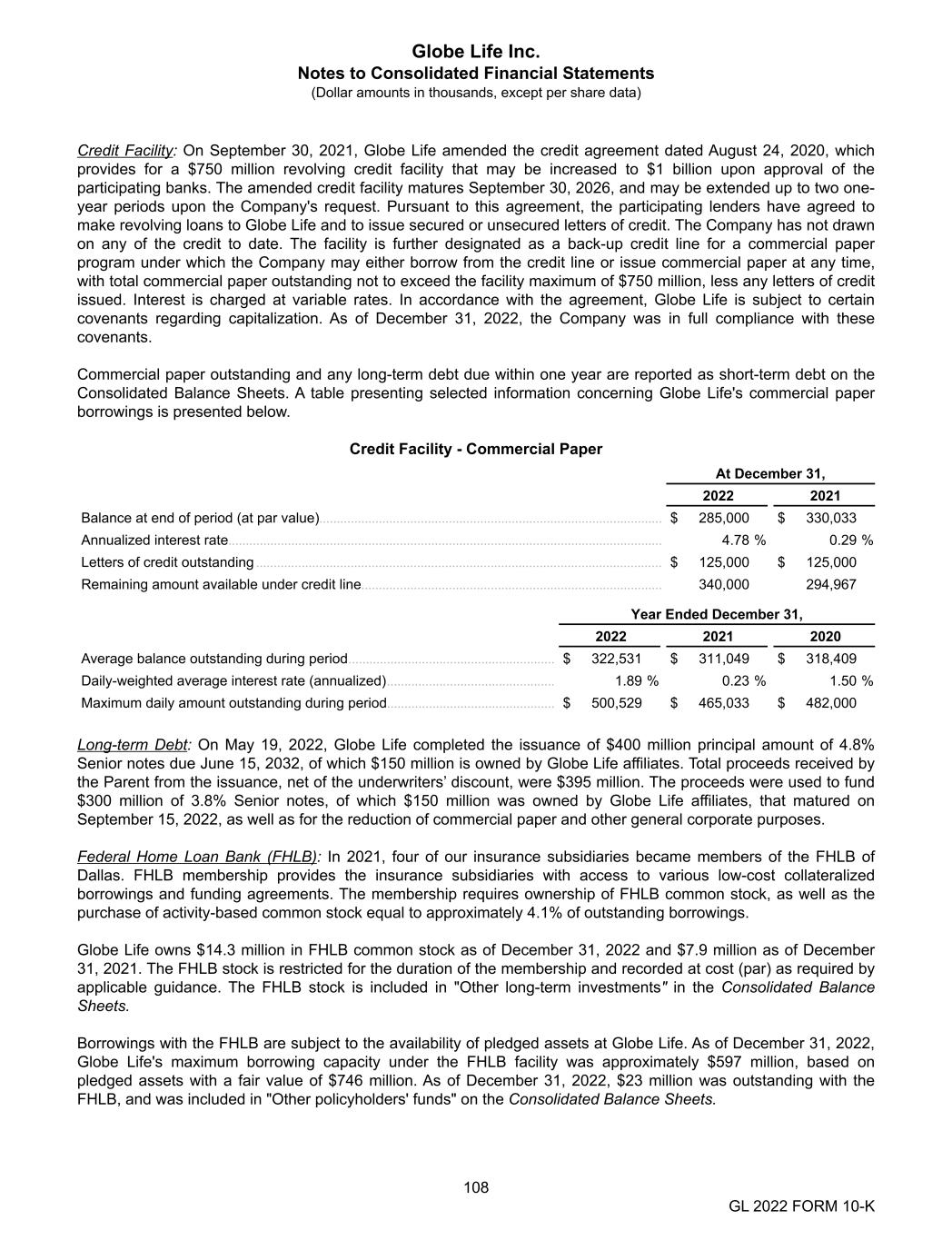 Credit Facility: On September 30, 2021, Globe Life amended the credit agreement dated August 24, 2020, which provides for a $750 million revolving credit facility that may be increased to $1 billion upon approval of the participating banks. The amended credit facility matures September 30, 2026, and may be extended up to two one- year periods upon the Company's request. Pursuant to this agreement, the participating lenders have agreed to make revolving loans to Globe Life and to issue secured or unsecured letters of credit. The Company has not drawn on any of the credit to date. The facility is further designated as a back-up credit line for a commercial paper program under which the Company may either borrow from the credit line or issue commercial paper at any time, with total commercial paper outstanding not to exceed the facility maximum of $750 million, less any letters of credit issued. Interest is charged at variable rates. In accordance with the agreement, Globe Life is subject to certain covenants regarding capitalization. As of December 31, 2022, the Company was in full compliance with these covenants. Commercial paper outstanding and any long-term debt due within one year are reported as short-term debt on the Consolidated Balance Sheets. A table presenting selected information concerning Globe Life's commercial paper borrowings is presented below. Credit Facility - Commercial Paper At December 31, 2022 2021 Balance at end of period (at par value).................................................................................................. $ 285,000 $ 330,033 Annualized interest rate............................................................................................................................ 4.78 % 0.29 % Letters of credit outstanding .................................................................................................................... $ 125,000 $ 125,000 Remaining amount available under credit line...................................................................................... 340,000 294,967 Year Ended December 31, 2022 2021 2020 Average balance outstanding during period........................................................... $ 322,531 $ 311,049 $ 318,409 Daily-weighted average interest rate (annualized)................................................ 1.89 % 0.23 % 1.50 % Maximum daily amount outstanding during period................................................ $ 500,529 $ 465,033 $ 482,000 Long-term Debt: On May 19, 2022, Globe Life completed the issuance of $400 million principal amount of 4.8% Senior notes due June 15, 2032, of which $150 million is owned by Globe Life affiliates. Total proceeds received by the Parent from the issuance, net of the underwriters’ discount, were $395 million. The proceeds were used to fund $300 million of 3.8% Senior notes, of which $150 million was owned by Globe Life affiliates, that matured on September 15, 2022, as well as for the reduction of commercial paper and other general corporate purposes. Federal Home Loan Bank (FHLB): In 2021, four of our insurance subsidiaries became members of the FHLB of Dallas. FHLB membership provides the insurance subsidiaries with access to various low-cost collateralized borrowings and funding agreements. The membership requires ownership of FHLB common stock, as well as the purchase of activity-based common stock equal to approximately 4.1% of outstanding borrowings. Globe Life owns $14.3 million in FHLB common stock as of December 31, 2022 and $7.9 million as of December 31, 2021. The FHLB stock is restricted for the duration of the membership and recorded at cost (par) as required by applicable guidance. The FHLB stock is included in "Other long-term investments" in the Consolidated Balance Sheets. Borrowings with the FHLB are subject to the availability of pledged assets at Globe Life. As of December 31, 2022, Globe Life's maximum borrowing capacity under the FHLB facility was approximately $597 million, based on pledged assets with a fair value of $746 million. As of December 31, 2022, $23 million was outstanding with the FHLB, and was included in "Other policyholders' funds" on the Consolidated Balance Sheets. Globe Life Inc. Notes to Consolidated Financial Statements (Dollar amounts in thousands, except per share data) 108 GL 2022 FORM 10-K