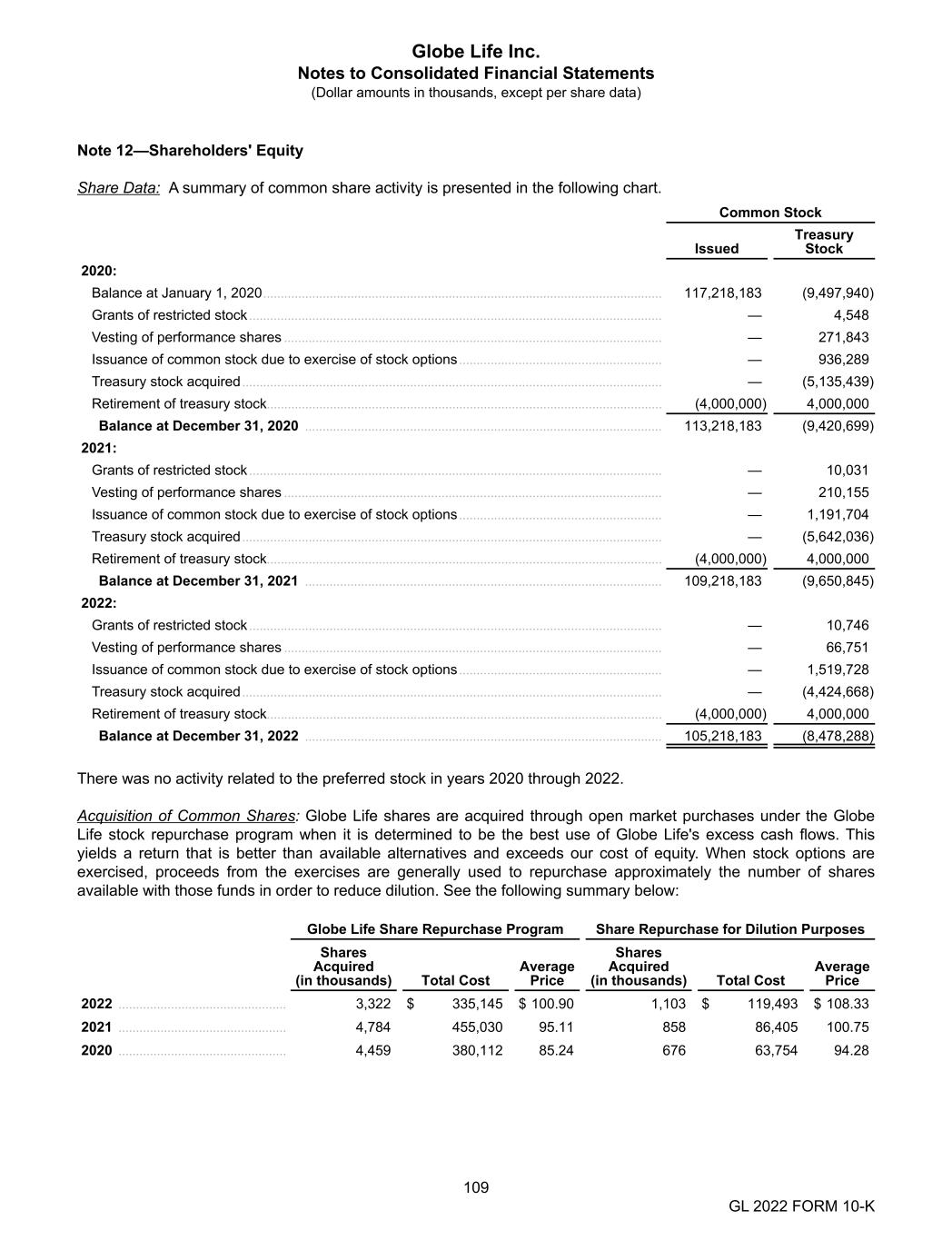 Note 12—Shareholders' Equity Share Data: A summary of common share activity is presented in the following chart. Common Stock Issued Treasury Stock 2020: Balance at January 1, 2020.................................................................................................................. 117,218,183 (9,497,940) Grants of restricted stock ...................................................................................................................... — 4,548 Vesting of performance shares ............................................................................................................ — 271,843 Issuance of common stock due to exercise of stock options .......................................................... — 936,289 Treasury stock acquired ........................................................................................................................ — (5,135,439) Retirement of treasury stock................................................................................................................. (4,000,000) 4,000,000 Balance at December 31, 2020 ...................................................................................................... 113,218,183 (9,420,699) 2021: Grants of restricted stock ...................................................................................................................... — 10,031 Vesting of performance shares ............................................................................................................ — 210,155 Issuance of common stock due to exercise of stock options .......................................................... — 1,191,704 Treasury stock acquired ........................................................................................................................ — (5,642,036) Retirement of treasury stock................................................................................................................. (4,000,000) 4,000,000 Balance at December 31, 2021 ...................................................................................................... 109,218,183 (9,650,845) 2022: Grants of restricted stock ...................................................................................................................... — 10,746 Vesting of performance shares ............................................................................................................ — 66,751 Issuance of common stock due to exercise of stock options .......................................................... — 1,519,728 Treasury stock acquired ........................................................................................................................ — (4,424,668) Retirement of treasury stock................................................................................................................. (4,000,000) 4,000,000 Balance at December 31, 2022 ...................................................................................................... 105,218,183 (8,478,288) There was no activity related to the preferred stock in years 2020 through 2022. Acquisition of Common Shares: Globe Life shares are acquired through open market purchases under the Globe Life stock repurchase program when it is determined to be the best use of Globe Life's excess cash flows. This yields a return that is better than available alternatives and exceeds our cost of equity. When stock options are exercised, proceeds from the exercises are generally used to repurchase approximately the number of shares available with those funds in order to reduce dilution. See the following summary below: Globe Life Share Repurchase Program Share Repurchase for Dilution Purposes Shares Acquired (in thousands) Total Cost Average Price Shares Acquired (in thousands) Total Cost Average Price 2022 ................................................ 3,322 $ 335,145 $ 100.90 1,103 $ 119,493 $ 108.33 2021 ................................................ 4,784 455,030 95.11 858 86,405 100.75 2020 ................................................ 4,459 380,112 85.24 676 63,754 94.28 Globe Life Inc. Notes to Consolidated Financial Statements (Dollar amounts in thousands, except per share data) 109 GL 2022 FORM 10-K