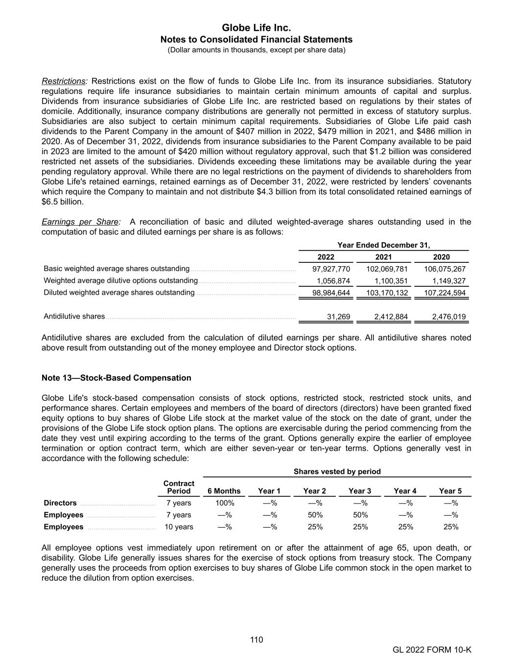 Restrictions: Restrictions exist on the flow of funds to Globe Life Inc. from its insurance subsidiaries. Statutory regulations require life insurance subsidiaries to maintain certain minimum amounts of capital and surplus. Dividends from insurance subsidiaries of Globe Life Inc. are restricted based on regulations by their states of domicile. Additionally, insurance company distributions are generally not permitted in excess of statutory surplus. Subsidiaries are also subject to certain minimum capital requirements. Subsidiaries of Globe Life paid cash dividends to the Parent Company in the amount of $407 million in 2022, $479 million in 2021, and $486 million in 2020. As of December 31, 2022, dividends from insurance subsidiaries to the Parent Company available to be paid in 2023 are limited to the amount of $420 million without regulatory approval, such that $1.2 billion was considered restricted net assets of the subsidiaries. Dividends exceeding these limitations may be available during the year pending regulatory approval. While there are no legal restrictions on the payment of dividends to shareholders from Globe Life's retained earnings, retained earnings as of December 31, 2022, were restricted by lenders’ covenants which require the Company to maintain and not distribute $4.3 billion from its total consolidated retained earnings of $6.5 billion. Earnings per Share: A reconciliation of basic and diluted weighted-average shares outstanding used in the computation of basic and diluted earnings per share is as follows: Year Ended December 31, 2022 2021 2020 Basic weighted average shares outstanding ........................................................ 97,927,770 102,069,781 106,075,267 Weighted average dilutive options outstanding.................................................... 1,056,874 1,100,351 1,149,327 Diluted weighted average shares outstanding...................................................... 98,984,644 103,170,132 107,224,594 Antidilutive shares ..................................................................................................... 31,269 2,412,884 2,476,019 Antidilutive shares are excluded from the calculation of diluted earnings per share. All antidilutive shares noted above result from outstanding out of the money employee and Director stock options. Note 13—Stock-Based Compensation Globe Life's stock-based compensation consists of stock options, restricted stock, restricted stock units, and performance shares. Certain employees and members of the board of directors (directors) have been granted fixed equity options to buy shares of Globe Life stock at the market value of the stock on the date of grant, under the provisions of the Globe Life stock option plans. The options are exercisable during the period commencing from the date they vest until expiring according to the terms of the grant. Options generally expire the earlier of employee termination or option contract term, which are either seven-year or ten-year terms. Options generally vest in accordance with the following schedule: Shares vested by period Contract Period 6 Months Year 1 Year 2 Year 3 Year 4 Year 5 Directors ........................................ 7 years 100% —% —% —% —% —% Employees ..................................... 7 years —% —% 50% 50% —% —% Employees .................................... 10 years —% —% 25% 25% 25% 25% All employee options vest immediately upon retirement on or after the attainment of age 65, upon death, or disability. Globe Life generally issues shares for the exercise of stock options from treasury stock. The Company generally uses the proceeds from option exercises to buy shares of Globe Life common stock in the open market to reduce the dilution from option exercises. Globe Life Inc. Notes to Consolidated Financial Statements (Dollar amounts in thousands, except per share data) 110 GL 2022 FORM 10-K