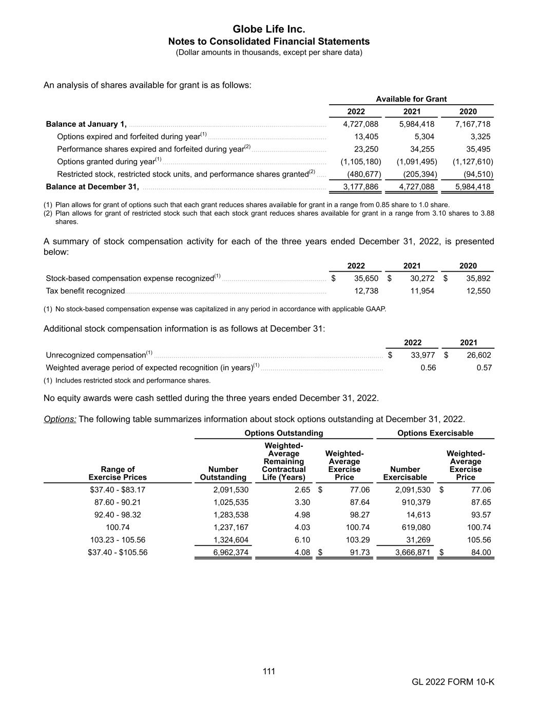 An analysis of shares available for grant is as follows: Available for Grant 2022 2021 2020 Balance at January 1, .................................................................................................... 4,727,088 5,984,418 7,167,718 Options expired and forfeited during year(1) ............................................................ 13,405 5,304 3,325 Performance shares expired and forfeited during year(2) ...................................... 23,250 34,255 35,495 Options granted during year(1) ................................................................................... (1,105,180) (1,091,495) (1,127,610) Restricted stock, restricted stock units, and performance shares granted(2) ..... (480,677) (205,394) (94,510) Balance at December 31, ............................................................................................. 3,177,886 4,727,088 5,984,418 (1) Plan allows for grant of options such that each grant reduces shares available for grant in a range from 0.85 share to 1.0 share. (2) Plan allows for grant of restricted stock such that each stock grant reduces shares available for grant in a range from 3.10 shares to 3.88 shares. A summary of stock compensation activity for each of the three years ended December 31, 2022, is presented below: 2022 2021 2020 Stock-based compensation expense recognized(1) ..................................................... $ 35,650 $ 30,272 $ 35,892 Tax benefit recognized...................................................................................................... 12,738 11,954 12,550 (1) No stock-based compensation expense was capitalized in any period in accordance with applicable GAAP. Additional stock compensation information is as follows at December 31: 2022 2021 Unrecognized compensation(1) .................................................................................................................... $ 33,977 $ 26,602 Weighted average period of expected recognition (in years)(1) .............................................................. 0.56 0.57 (1) Includes restricted stock and performance shares. No equity awards were cash settled during the three years ended December 31, 2022. Options: The following table summarizes information about stock options outstanding at December 31, 2022. Options Outstanding Options Exercisable Range of Exercise Prices Number Outstanding Weighted- Average Remaining Contractual Life (Years) Weighted- Average Exercise Price Number Exercisable Weighted- Average Exercise Price $37.40 - $83.17 2,091,530 2.65 $ 77.06 2,091,530 $ 77.06 87.60 - 90.21 1,025,535 3.30 87.64 910,379 87.65 92.40 - 98.32 1,283,538 4.98 98.27 14,613 93.57 100.74 1,237,167 4.03 100.74 619,080 100.74 103.23 - 105.56 1,324,604 6.10 103.29 31,269 105.56 $37.40 - $105.56 6,962,374 4.08 $ 91.73 3,666,871 $ 84.00 Globe Life Inc. Notes to Consolidated Financial Statements (Dollar amounts in thousands, except per share data) 111 GL 2022 FORM 10-K