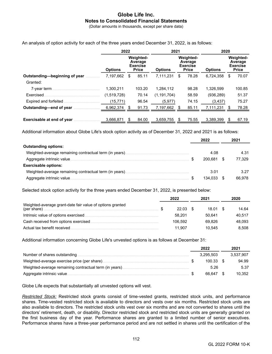 An analysis of option activity for each of the three years ended December 31, 2022, is as follows: 2022 2021 2020 Options Weighted- Average Exercise Price Options Weighted- Average Exercise Price Options Weighted- Average Exercise Price Outstanding—beginning of year .............. 7,197,662 $ 85.11 7,111,231 $ 78.28 6,724,358 $ 70.07 Granted: 7-year term................................................ 1,300,211 103.20 1,284,112 98.28 1,326,599 100.85 Exercised........................................................ (1,519,728) 70.14 (1,191,704) 58.59 (936,289) 51.37 Expired and forfeited .................................... (15,771) 96.54 (5,977) 74.15 (3,437) 75.27 Outstanding—end of year .......................... 6,962,374 $ 91.73 7,197,662 $ 85.11 7,111,231 $ 78.28 Exercisable at end of year .......................... 3,666,871 $ 84.00 3,659,755 $ 75.55 3,389,399 $ 67.19 Additional information about Globe Life's stock option activity as of December 31, 2022 and 2021 is as follows: 2022 2021 Outstanding options: Weighted-average remaining contractual term (in years)................................................................ 4.08 4.31 Aggregate intrinsic value....................................................................................................................... $ 200,681 $ 77,329 Exercisable options: Weighted-average remaining contractual term (in years)................................................................ 3.01 3.27 Aggregate intrinsic value....................................................................................................................... $ 134,033 $ 66,978 Selected stock option activity for the three years ended December 31, 2022, is presented below: 2022 2021 2020 Weighted-average grant-date fair value of options granted (per share) ................................................................................................................... $ 22.03 $ 18.01 $ 14.64 Intrinsic value of options exercised.......................................................................... 58,201 50,641 40,517 Cash received from options exercised .................................................................... 106,592 69,826 48,093 Actual tax benefit received ........................................................................................ 11,907 10,545 8,508 Additional information concerning Globe Life's unvested options is as follows at December 31: 2022 2021 Number of shares outstanding ................................................................................................................ 3,295,503 3,537,907 Weighted-average exercise price (per share)....................................................................................... $ 100.33 $ 94.99 Weighted-average remaining contractual term (in years)................................................................... 5.26 5.37 Aggregate intrinsic value.......................................................................................................................... $ 66,647 $ 10,352 Globe Life expects that substantially all unvested options will vest. Restricted Stock: Restricted stock grants consist of time-vested grants, restricted stock units, and performance shares. Time-vested restricted stock is available to directors and vests over six months. Restricted stock units are also available to directors. The restricted stock units vest over six months and are not converted to shares until the directors’ retirement, death, or disability. Director restricted stock and restricted stock units are generally granted on the first business day of the year. Performance shares are granted to a limited number of senior executives. Performance shares have a three-year performance period and are not settled in shares until the certification of the Globe Life Inc. Notes to Consolidated Financial Statements (Dollar amounts in thousands, except per share data) 112 GL 2022 FORM 10-K