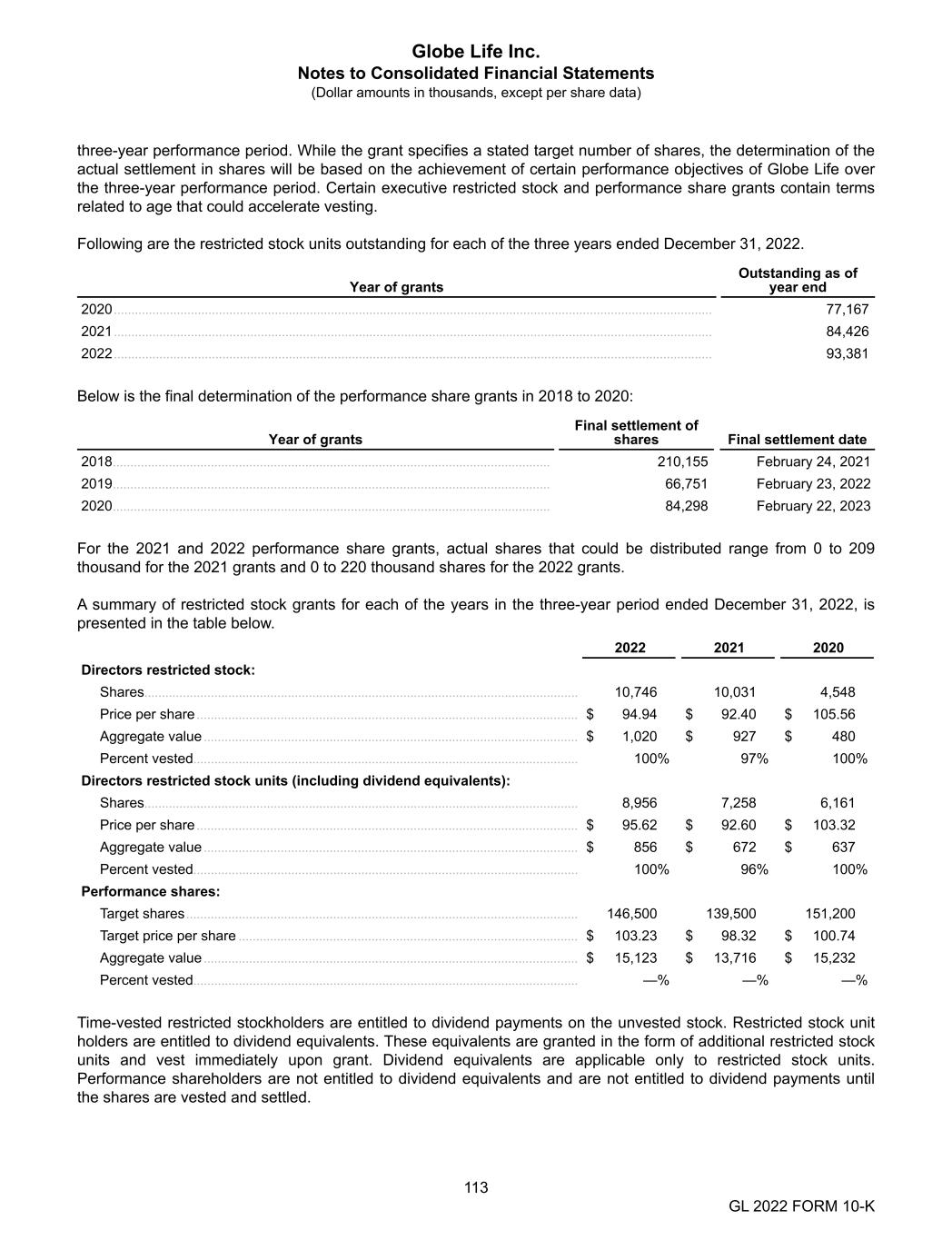 three-year performance period. While the grant specifies a stated target number of shares, the determination of the actual settlement in shares will be based on the achievement of certain performance objectives of Globe Life over the three-year performance period. Certain executive restricted stock and performance share grants contain terms related to age that could accelerate vesting. Following are the restricted stock units outstanding for each of the three years ended December 31, 2022. Year of grants Outstanding as of year end 2020 ........................................................................................................................................................................... 77,167 2021 ........................................................................................................................................................................... 84,426 2022 ........................................................................................................................................................................... 93,381 Below is the final determination of the performance share grants in 2018 to 2020: Year of grants Final settlement of shares Final settlement date 2018............................................................................................................................. 210,155 February 24, 2021 2019............................................................................................................................. 66,751 February 23, 2022 2020............................................................................................................................. 84,298 February 22, 2023 For the 2021 and 2022 performance share grants, actual shares that could be distributed range from 0 to 209 thousand for the 2021 grants and 0 to 220 thousand shares for the 2022 grants. A summary of restricted stock grants for each of the years in the three-year period ended December 31, 2022, is presented in the table below. 2022 2021 2020 Directors restricted stock: Shares............................................................................................................................ 10,746 10,031 4,548 Price per share ............................................................................................................. $ 94.94 $ 92.40 $ 105.56 Aggregate value ........................................................................................................... $ 1,020 $ 927 $ 480 Percent vested.............................................................................................................. 100% 97% 100% Directors restricted stock units (including dividend equivalents): Shares............................................................................................................................ 8,956 7,258 6,161 Price per share ............................................................................................................. $ 95.62 $ 92.60 $ 103.32 Aggregate value ........................................................................................................... $ 856 $ 672 $ 637 Percent vested.............................................................................................................. 100% 96% 100% Performance shares: Target shares ................................................................................................................ 146,500 139,500 151,200 Target price per share ................................................................................................. $ 103.23 $ 98.32 $ 100.74 Aggregate value ........................................................................................................... $ 15,123 $ 13,716 $ 15,232 Percent vested.............................................................................................................. —% —% —% Time-vested restricted stockholders are entitled to dividend payments on the unvested stock. Restricted stock unit holders are entitled to dividend equivalents. These equivalents are granted in the form of additional restricted stock units and vest immediately upon grant. Dividend equivalents are applicable only to restricted stock units. Performance shareholders are not entitled to dividend equivalents and are not entitled to dividend payments until the shares are vested and settled. Globe Life Inc. Notes to Consolidated Financial Statements (Dollar amounts in thousands, except per share data) 113 GL 2022 FORM 10-K