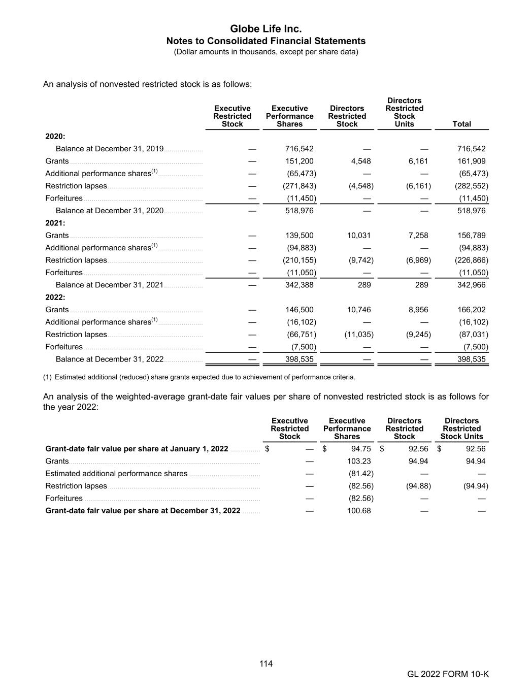 An analysis of nonvested restricted stock is as follows: Executive Restricted Stock Executive Performance Shares Directors Restricted Stock Directors Restricted Stock Units Total 2020: Balance at December 31, 2019.................... — 716,542 — — 716,542 Grants .................................................................... — 151,200 4,548 6,161 161,909 Additional performance shares(1)....................... — (65,473) — — (65,473) Restriction lapses................................................. — (271,843) (4,548) (6,161) (282,552) Forfeitures ............................................................. — (11,450) — — (11,450) Balance at December 31, 2020.................... — 518,976 — — 518,976 2021: Grants .................................................................... — 139,500 10,031 7,258 156,789 Additional performance shares(1)....................... — (94,883) — — (94,883) Restriction lapses................................................. — (210,155) (9,742) (6,969) (226,866) Forfeitures ............................................................. — (11,050) — — (11,050) Balance at December 31, 2021.................... — 342,388 289 289 342,966 2022: Grants .................................................................... — 146,500 10,746 8,956 166,202 Additional performance shares(1)....................... — (16,102) — — (16,102) Restriction lapses................................................. — (66,751) (11,035) (9,245) (87,031) Forfeitures ............................................................. — (7,500) — — (7,500) Balance at December 31, 2022.................... — 398,535 — — 398,535 (1) Estimated additional (reduced) share grants expected due to achievement of performance criteria. An analysis of the weighted-average grant-date fair values per share of nonvested restricted stock is as follows for the year 2022: Executive Restricted Stock Executive Performance Shares Directors Restricted Stock Directors Restricted Stock Units Grant-date fair value per share at January 1, 2022 ............... $ — $ 94.75 $ 92.56 $ 92.56 Grants.................................................................................................. — 103.23 94.94 94.94 Estimated additional performance shares..................................... — (81.42) — — Restriction lapses .............................................................................. — (82.56) (94.88) (94.94) Forfeitures .......................................................................................... — (82.56) — — Grant-date fair value per share at December 31, 2022 ......... — 100.68 — — Globe Life Inc. Notes to Consolidated Financial Statements (Dollar amounts in thousands, except per share data) 114 GL 2022 FORM 10-K