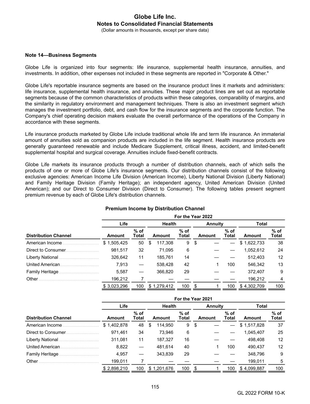Note 14—Business Segments Globe Life is organized into four segments: life insurance, supplemental health insurance, annuities, and investments. In addition, other expenses not included in these segments are reported in "Corporate & Other." Globe Life's reportable insurance segments are based on the insurance product lines it markets and administers: life insurance, supplemental health insurance, and annuities. These major product lines are set out as reportable segments because of the common characteristics of products within these categories, comparability of margins, and the similarity in regulatory environment and management techniques. There is also an investment segment which manages the investment portfolio, debt, and cash flow for the insurance segments and the corporate function. The Company's chief operating decision makers evaluate the overall performance of the operations of the Company in accordance with these segments. Life insurance products marketed by Globe Life include traditional whole life and term life insurance. An immaterial amount of annuities sold as companion products are included in the life segment. Health insurance products are generally guaranteed renewable and include Medicare Supplement, critical illness, accident, and limited-benefit supplemental hospital and surgical coverage. Annuities include fixed-benefit contracts. Globe Life markets its insurance products through a number of distribution channels, each of which sells the products of one or more of Globe Life's insurance segments. Our distribution channels consist of the following exclusive agencies: American Income Life Division (American Income), Liberty National Division (Liberty National) and Family Heritage Division (Family Heritage); an independent agency, United American Division (United American); and our Direct to Consumer Division (Direct to Consumer). The following tables present segment premium revenue by each of Globe Life's distribution channels. Premium Income by Distribution Channel For the Year 2022 Life Health Annuity Total Distribution Channel Amount % of Total Amount % of Total Amount % of Total Amount % of Total American Income ................................ $ 1,505,425 50 $ 117,308 9 $ — — $ 1,622,733 38 Direct to Consumer............................. 981,517 32 71,095 6 — — 1,052,612 24 Liberty National ................................... 326,642 11 185,761 14 — — 512,403 12 United American.................................. 7,913 — 538,428 42 1 100 546,342 13 Family Heritage ................................... 5,587 — 366,820 29 — — 372,407 9 Other ..................................................... 196,212 7 — — — — 196,212 4 $ 3,023,296 100 $ 1,279,412 100 $ 1 100 $ 4,302,709 100 For the Year 2021 Life Health Annuity Total Distribution Channel Amount % of Total Amount % of Total Amount % of Total Amount % of Total American Income ................................ $ 1,402,878 48 $ 114,950 9 $ — — $ 1,517,828 37 Direct to Consumer............................. 971,461 34 73,946 6 — — 1,045,407 25 Liberty National ................................... 311,081 11 187,327 16 — — 498,408 12 United American.................................. 8,822 — 481,614 40 1 100 490,437 12 Family Heritage ................................... 4,957 — 343,839 29 — — 348,796 9 Other ..................................................... 199,011 7 — — — — 199,011 5 $ 2,898,210 100 $ 1,201,676 100 $ 1 100 $ 4,099,887 100 Globe Life Inc. Notes to Consolidated Financial Statements (Dollar amounts in thousands, except per share data) 115 GL 2022 FORM 10-K