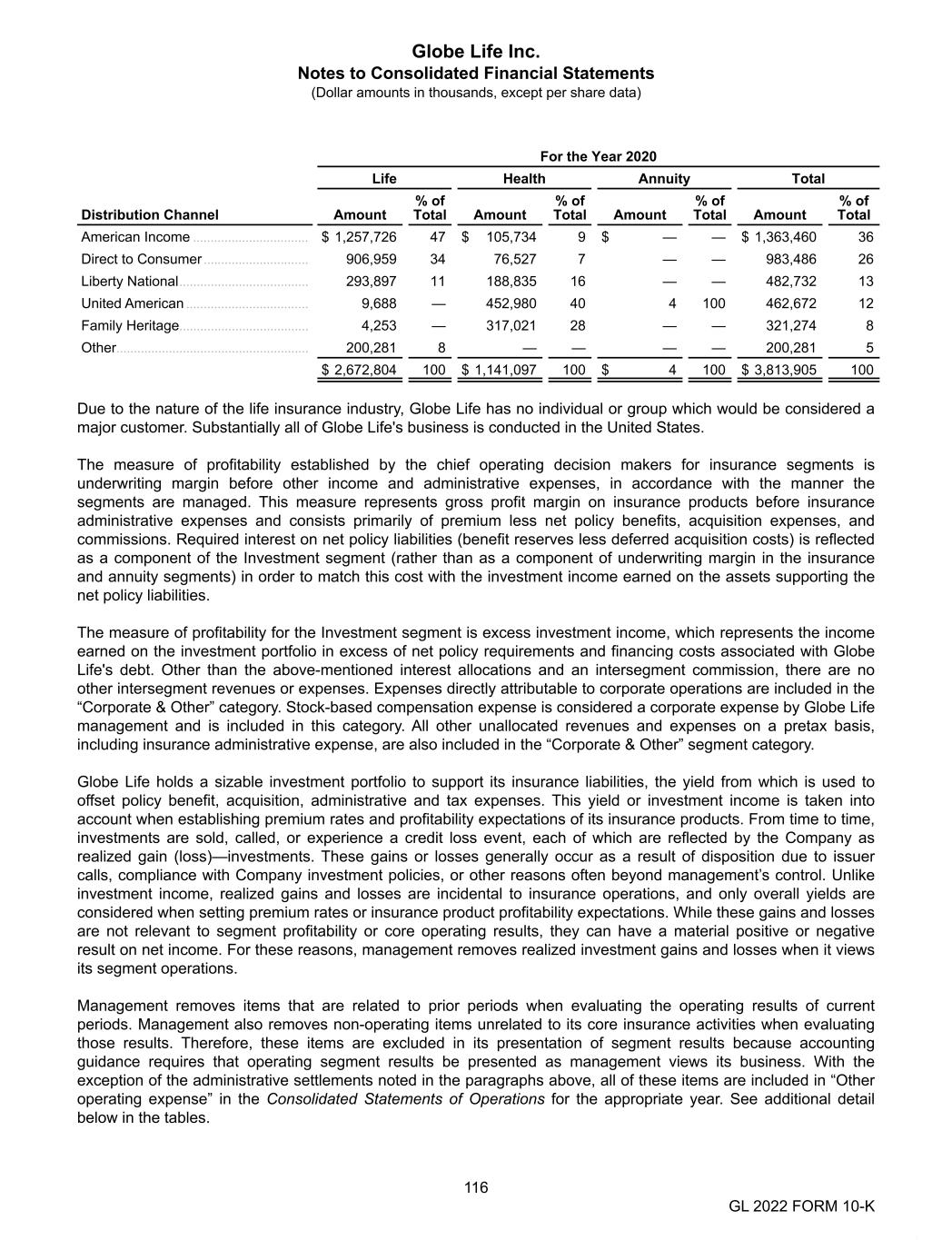 For the Year 2020 Life Health Annuity Total Distribution Channel Amount % of Total Amount % of Total Amount % of Total Amount % of Total American Income ................................. $ 1,257,726 47 $ 105,734 9 $ — — $ 1,363,460 36 Direct to Consumer .............................. 906,959 34 76,527 7 — — 983,486 26 Liberty National..................................... 293,897 11 188,835 16 — — 482,732 13 United American ................................... 9,688 — 452,980 40 4 100 462,672 12 Family Heritage..................................... 4,253 — 317,021 28 — — 321,274 8 Other....................................................... 200,281 8 — — — — 200,281 5 $ 2,672,804 100 $ 1,141,097 100 $ 4 100 $ 3,813,905 100 Due to the nature of the life insurance industry, Globe Life has no individual or group which would be considered a major customer. Substantially all of Globe Life's business is conducted in the United States. The measure of profitability established by the chief operating decision makers for insurance segments is underwriting margin before other income and administrative expenses, in accordance with the manner the segments are managed. This measure represents gross profit margin on insurance products before insurance administrative expenses and consists primarily of premium less net policy benefits, acquisition expenses, and commissions. Required interest on net policy liabilities (benefit reserves less deferred acquisition costs) is reflected as a component of the Investment segment (rather than as a component of underwriting margin in the insurance and annuity segments) in order to match this cost with the investment income earned on the assets supporting the net policy liabilities. The measure of profitability for the Investment segment is excess investment income, which represents the income earned on the investment portfolio in excess of net policy requirements and financing costs associated with Globe Life's debt. Other than the above-mentioned interest allocations and an intersegment commission, there are no other intersegment revenues or expenses. Expenses directly attributable to corporate operations are included in the “Corporate & Other” category. Stock-based compensation expense is considered a corporate expense by Globe Life management and is included in this category. All other unallocated revenues and expenses on a pretax basis, including insurance administrative expense, are also included in the “Corporate & Other” segment category. Globe Life holds a sizable investment portfolio to support its insurance liabilities, the yield from which is used to offset policy benefit, acquisition, administrative and tax expenses. This yield or investment income is taken into account when establishing premium rates and profitability expectations of its insurance products. From time to time, investments are sold, called, or experience a credit loss event, each of which are reflected by the Company as realized gain (loss)—investments. These gains or losses generally occur as a result of disposition due to issuer calls, compliance with Company investment policies, or other reasons often beyond management’s control. Unlike investment income, realized gains and losses are incidental to insurance operations, and only overall yields are considered when setting premium rates or insurance product profitability expectations. While these gains and losses are not relevant to segment profitability or core operating results, they can have a material positive or negative result on net income. For these reasons, management removes realized investment gains and losses when it views its segment operations. Management removes items that are related to prior periods when evaluating the operating results of current periods. Management also removes non-operating items unrelated to its core insurance activities when evaluating those results. Therefore, these items are excluded in its presentation of segment results because accounting guidance requires that operating segment results be presented as management views its business. With the exception of the administrative settlements noted in the paragraphs above, all of these items are included in “Other operating expense” in the Consolidated Statements of Operations for the appropriate year. See additional detail below in the tables. Globe Life Inc. Notes to Consolidated Financial Statements (Dollar amounts in thousands, except per share data) 116 GL 2022 FORM 10-K