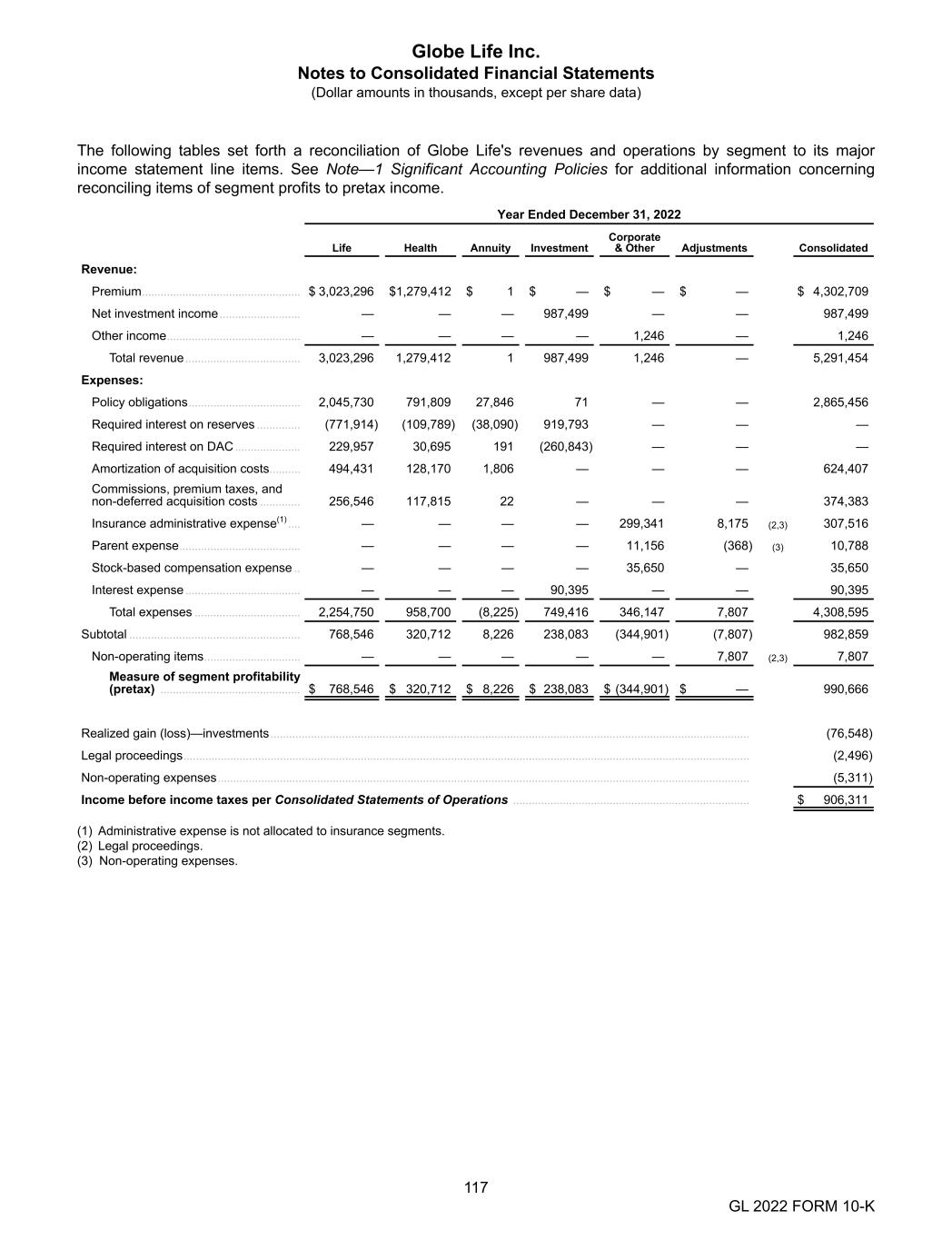 The following tables set forth a reconciliation of Globe Life's revenues and operations by segment to its major income statement line items. See Note—1 Significant Accounting Policies for additional information concerning reconciling items of segment profits to pretax income. Year Ended December 31, 2022 Life Health Annuity Investment Corporate & Other Adjustments Consolidated Revenue: Premium................................................... $ 3,023,296 $1,279,412 $ 1 $ — $ — $ — $ 4,302,709 Net investment income .......................... — — — 987,499 — — 987,499 Other income........................................... — — — — 1,246 — 1,246 Total revenue ..................................... 3,023,296 1,279,412 1 987,499 1,246 — 5,291,454 Expenses: Policy obligations.................................... 2,045,730 791,809 27,846 71 — — 2,865,456 Required interest on reserves .............. (771,914) (109,789) (38,090) 919,793 — — — Required interest on DAC ..................... 229,957 30,695 191 (260,843) — — — Amortization of acquisition costs.......... 494,431 128,170 1,806 — — — 624,407 Commissions, premium taxes, and non-deferred acquisition costs ............. 256,546 117,815 22 — — — 374,383 Insurance administrative expense(1) .... — — — — 299,341 8,175 (2,3) 307,516 Parent expense....................................... — — — — 11,156 (368) (3) 10,788 Stock-based compensation expense .. — — — — 35,650 — 35,650 Interest expense ..................................... — — — 90,395 — — 90,395 Total expenses .................................. 2,254,750 958,700 (8,225) 749,416 346,147 7,807 4,308,595 Subtotal ....................................................... 768,546 320,712 8,226 238,083 (344,901) (7,807) 982,859 Non-operating items............................... — — — — — 7,807 (2,3) 7,807 Measure of segment profitability (pretax) ............................................. $ 768,546 $ 320,712 $ 8,226 $ 238,083 $ (344,901) $ — 990,666 Realized gain (loss)—investments .......................................................................................................................................................... (76,548) Legal proceedings...................................................................................................................................................................................... (2,496) Non-operating expenses ........................................................................................................................................................................... (5,311) Income before income taxes per Consolidated Statements of Operations ............................................................................ $ 906,311 (1) Administrative expense is not allocated to insurance segments. (2) Legal proceedings. (3) Non-operating expenses. Globe Life Inc. Notes to Consolidated Financial Statements (Dollar amounts in thousands, except per share data) 117 GL 2022 FORM 10-K