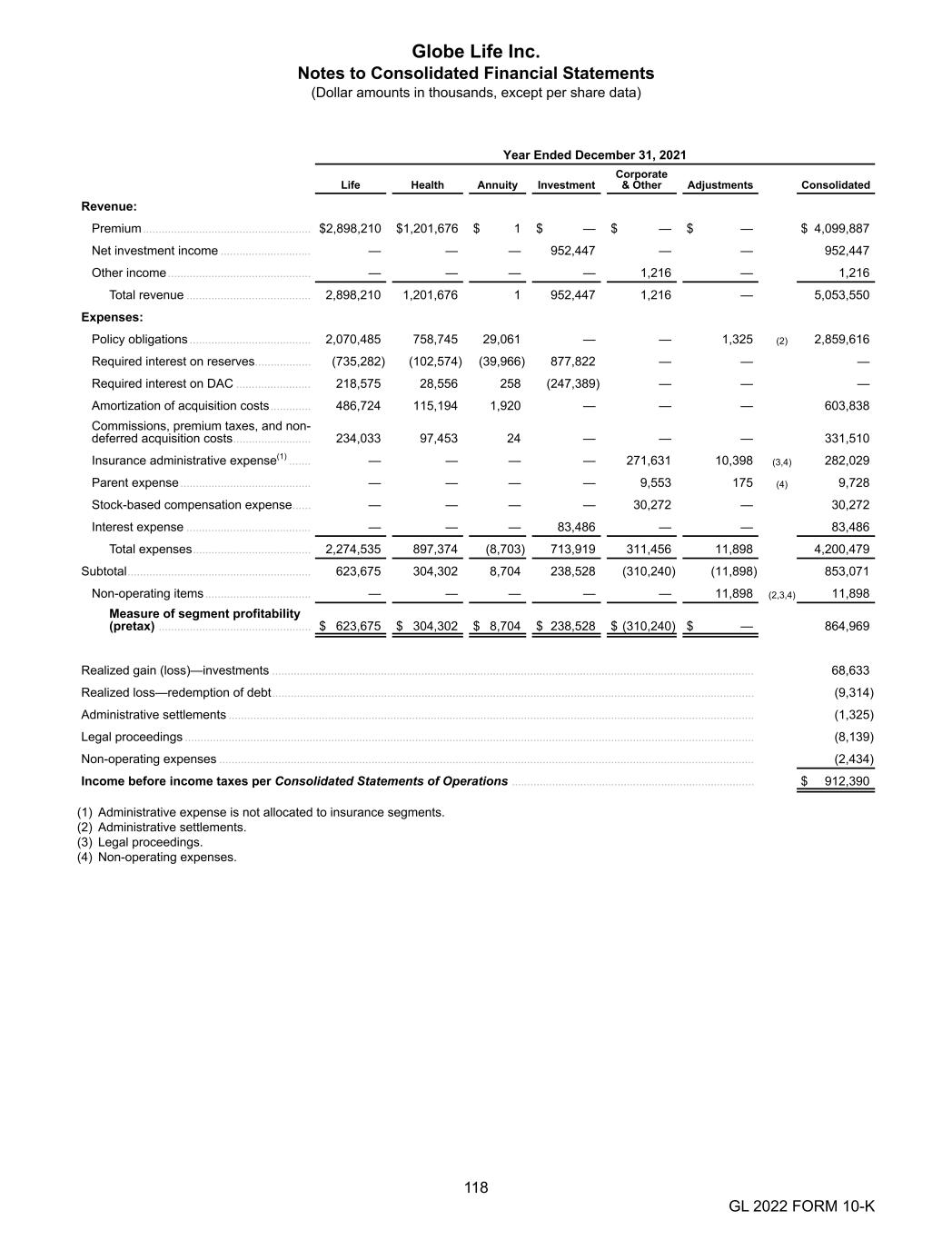 Year Ended December 31, 2021 Life Health Annuity Investment Corporate & Other Adjustments Consolidated Revenue: Premium ...................................................... $2,898,210 $1,201,676 $ 1 $ — $ — $ — $ 4,099,887 Net investment income ............................. — — — 952,447 — — 952,447 Other income .............................................. — — — — 1,216 — 1,216 Total revenue ........................................ 2,898,210 1,201,676 1 952,447 1,216 — 5,053,550 Expenses: Policy obligations ....................................... 2,070,485 758,745 29,061 — — 1,325 (2) 2,859,616 Required interest on reserves.................. (735,282) (102,574) (39,966) 877,822 — — — Required interest on DAC ........................ 218,575 28,556 258 (247,389) — — — Amortization of acquisition costs ............. 486,724 115,194 1,920 — — — 603,838 Commissions, premium taxes, and non- deferred acquisition costs......................... 234,033 97,453 24 — — — 331,510 Insurance administrative expense(1) ....... — — — — 271,631 10,398 (3,4) 282,029 Parent expense .......................................... — — — — 9,553 175 (4) 9,728 Stock-based compensation expense...... — — — — 30,272 — 30,272 Interest expense ........................................ — — — 83,486 — — 83,486 Total expenses...................................... 2,274,535 897,374 (8,703) 713,919 311,456 11,898 4,200,479 Subtotal........................................................... 623,675 304,302 8,704 238,528 (310,240) (11,898) 853,071 Non-operating items .................................. — — — — — 11,898 (2,3,4) 11,898 Measure of segment profitability (pretax) ................................................. $ 623,675 $ 304,302 $ 8,704 $ 238,528 $ (310,240) $ — 864,969 Realized gain (loss)—investments ........................................................................................................................................................... 68,633 Realized loss—redemption of debt........................................................................................................................................................... (9,314) Administrative settlements ......................................................................................................................................................................... (1,325) Legal proceedings ....................................................................................................................................................................................... (8,139) Non-operating expenses ............................................................................................................................................................................ (2,434) Income before income taxes per Consolidated Statements of Operations .............................................................................. $ 912,390 (1) Administrative expense is not allocated to insurance segments. (2) Administrative settlements. (3) Legal proceedings. (4) Non-operating expenses. Globe Life Inc. Notes to Consolidated Financial Statements (Dollar amounts in thousands, except per share data) 118 GL 2022 FORM 10-K
