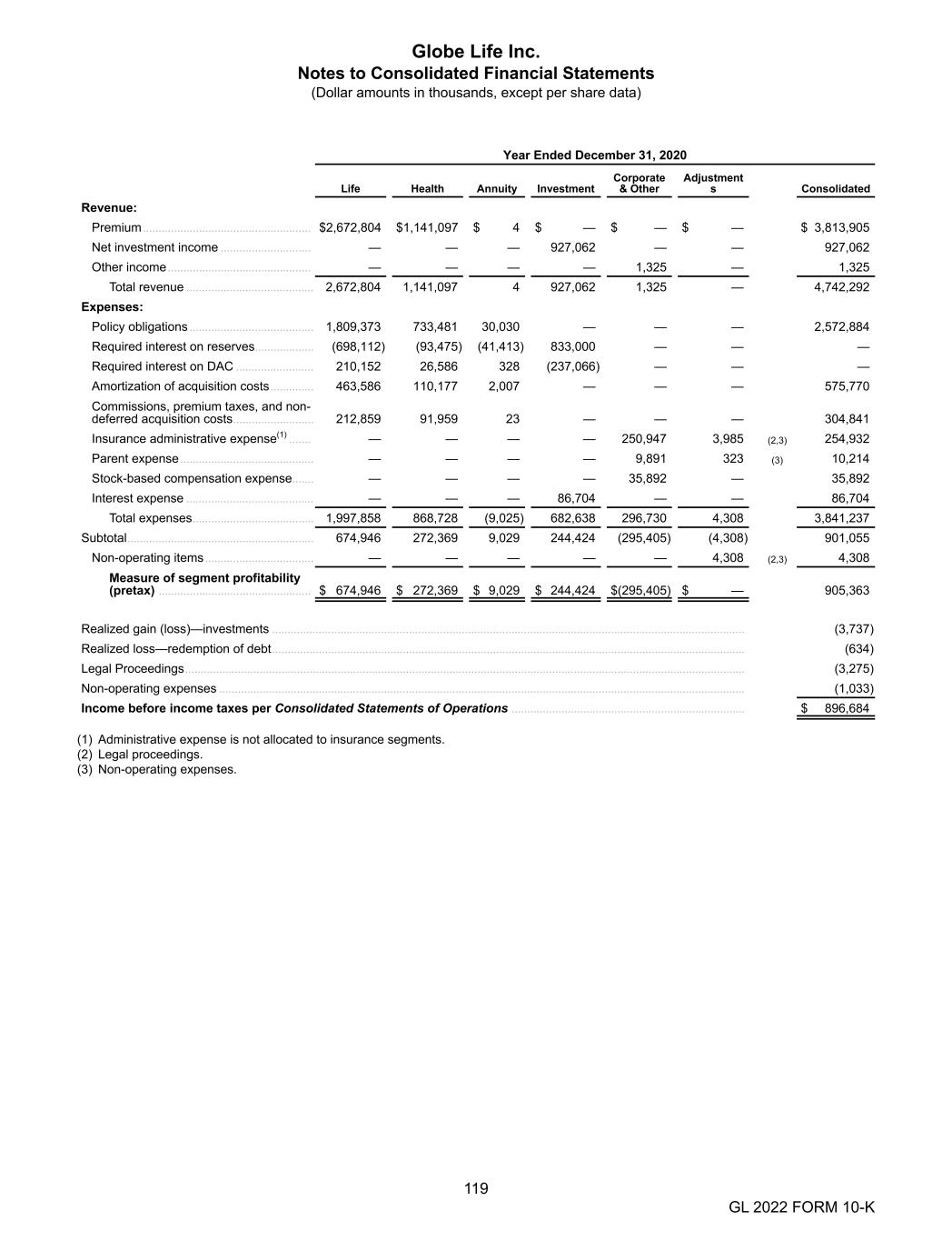 Year Ended December 31, 2020 Life Health Annuity Investment Corporate & Other Adjustment s Consolidated Revenue: Premium ...................................................... $2,672,804 $1,141,097 $ 4 $ — $ — $ — $ 3,813,905 Net investment income ............................. — — — 927,062 — — 927,062 Other income .............................................. — — — — 1,325 — 1,325 Total revenue ......................................... 2,672,804 1,141,097 4 927,062 1,325 — 4,742,292 Expenses: Policy obligations ........................................ 1,809,373 733,481 30,030 — — — 2,572,884 Required interest on reserves................... (698,112) (93,475) (41,413) 833,000 — — — Required interest on DAC ......................... 210,152 26,586 328 (237,066) — — — Amortization of acquisition costs .............. 463,586 110,177 2,007 — — — 575,770 Commissions, premium taxes, and non- deferred acquisition costs.......................... 212,859 91,959 23 — — — 304,841 Insurance administrative expense(1) ....... — — — — 250,947 3,985 (2,3) 254,932 Parent expense ........................................... — — — — 9,891 323 (3) 10,214 Stock-based compensation expense....... — — — — 35,892 — 35,892 Interest expense ......................................... — — — 86,704 — — 86,704 Total expenses....................................... 1,997,858 868,728 (9,025) 682,638 296,730 4,308 3,841,237 Subtotal............................................................ 674,946 272,369 9,029 244,424 (295,405) (4,308) 901,055 Non-operating items ................................... — — — — — 4,308 (2,3) 4,308 Measure of segment profitability (pretax) ................................................. $ 674,946 $ 272,369 $ 9,029 $ 244,424 $(295,405) $ — 905,363 Realized gain (loss)—investments ........................................................................................................................................................ (3,737) Realized loss—redemption of debt........................................................................................................................................................ (634) Legal Proceedings.................................................................................................................................................................................... (3,275) Non-operating expenses ......................................................................................................................................................................... (1,033) Income before income taxes per Consolidated Statements of Operations ........................................................................... $ 896,684 (1) Administrative expense is not allocated to insurance segments. (2) Legal proceedings. (3) Non-operating expenses. Globe Life Inc. Notes to Consolidated Financial Statements (Dollar amounts in thousands, except per share data) 119 GL 2022 FORM 10-K