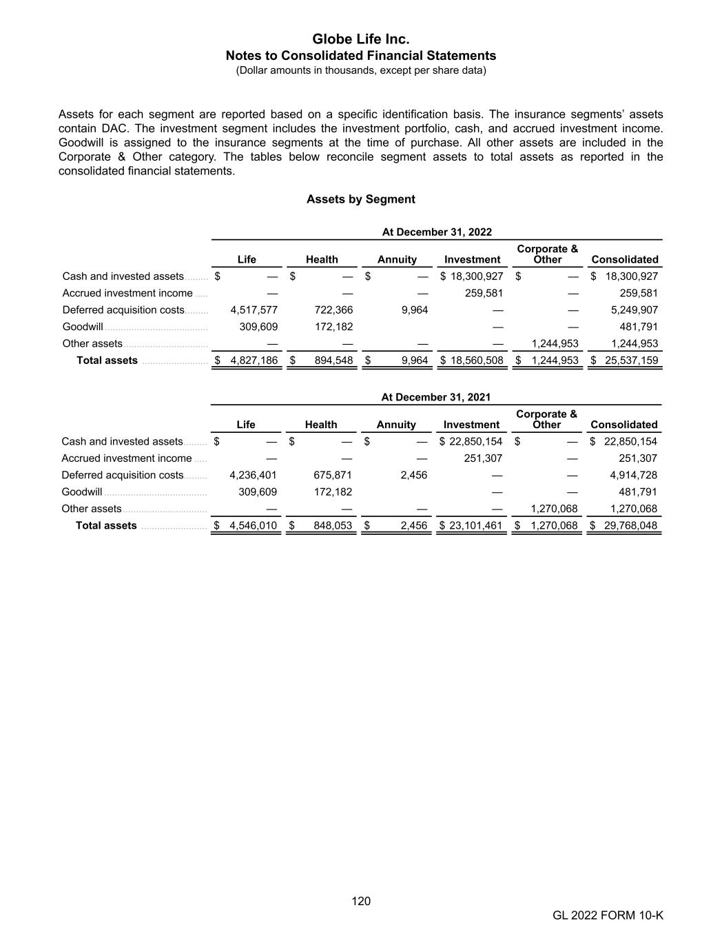 Assets for each segment are reported based on a specific identification basis. The insurance segments’ assets contain DAC. The investment segment includes the investment portfolio, cash, and accrued investment income. Goodwill is assigned to the insurance segments at the time of purchase. All other assets are included in the Corporate & Other category. The tables below reconcile segment assets to total assets as reported in the consolidated financial statements. Assets by Segment At December 31, 2022 Life Health Annuity Investment Corporate & Other Consolidated Cash and invested assets......... $ — $ — $ — $ 18,300,927 $ — $ 18,300,927 Accrued investment income ..... — — — 259,581 — 259,581 Deferred acquisition costs......... 4,517,577 722,366 9,964 — — 5,249,907 Goodwill ....................................... 309,609 172,182 — — 481,791 Other assets................................ — — — — 1,244,953 1,244,953 Total assets ......................... $ 4,827,186 $ 894,548 $ 9,964 $ 18,560,508 $ 1,244,953 $ 25,537,159 At December 31, 2021 Life Health Annuity Investment Corporate & Other Consolidated Cash and invested assets......... $ — $ — $ — $ 22,850,154 $ — $ 22,850,154 Accrued investment income ..... — — — 251,307 — 251,307 Deferred acquisition costs......... 4,236,401 675,871 2,456 — — 4,914,728 Goodwill ....................................... 309,609 172,182 — — 481,791 Other assets................................ — — — — 1,270,068 1,270,068 Total assets ......................... $ 4,546,010 $ 848,053 $ 2,456 $ 23,101,461 $ 1,270,068 $ 29,768,048 Globe Life Inc. Notes to Consolidated Financial Statements (Dollar amounts in thousands, except per share data) 120 GL 2022 FORM 10-K