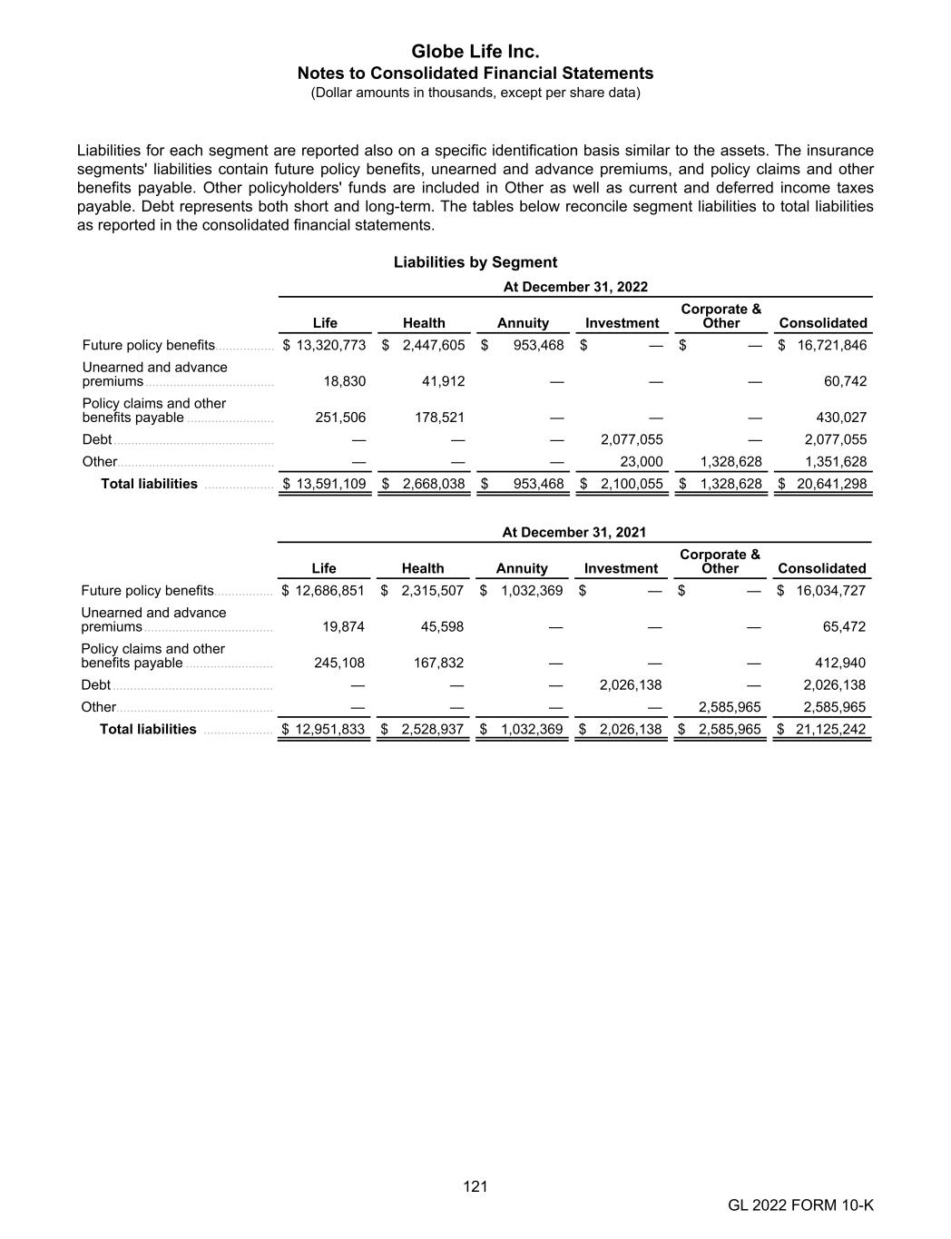 Liabilities for each segment are reported also on a specific identification basis similar to the assets. The insurance segments' liabilities contain future policy benefits, unearned and advance premiums, and policy claims and other benefits payable. Other policyholders' funds are included in Other as well as current and deferred income taxes payable. Debt represents both short and long-term. The tables below reconcile segment liabilities to total liabilities as reported in the consolidated financial statements. Liabilities by Segment At December 31, 2022 Life Health Annuity Investment Corporate & Other Consolidated Future policy benefits................. $ 13,320,773 $ 2,447,605 $ 953,468 $ — $ — $ 16,721,846 Unearned and advance premiums ..................................... 18,830 41,912 — — — 60,742 Policy claims and other benefits payable ......................... 251,506 178,521 — — — 430,027 Debt .............................................. — — — 2,077,055 — 2,077,055 Other............................................. — — — 23,000 1,328,628 1,351,628 Total liabilities .................... $ 13,591,109 $ 2,668,038 $ 953,468 $ 2,100,055 $ 1,328,628 $ 20,641,298 At December 31, 2021 Life Health Annuity Investment Corporate & Other Consolidated Future policy benefits................. $ 12,686,851 $ 2,315,507 $ 1,032,369 $ — $ — $ 16,034,727 Unearned and advance premiums ..................................... 19,874 45,598 — — — 65,472 Policy claims and other benefits payable ......................... 245,108 167,832 — — — 412,940 Debt .............................................. — — — 2,026,138 — 2,026,138 Other............................................. — — — — 2,585,965 2,585,965 Total liabilities .................... $ 12,951,833 $ 2,528,937 $ 1,032,369 $ 2,026,138 $ 2,585,965 $ 21,125,242 Globe Life Inc. Notes to Consolidated Financial Statements (Dollar amounts in thousands, except per share data) 121 GL 2022 FORM 10-K