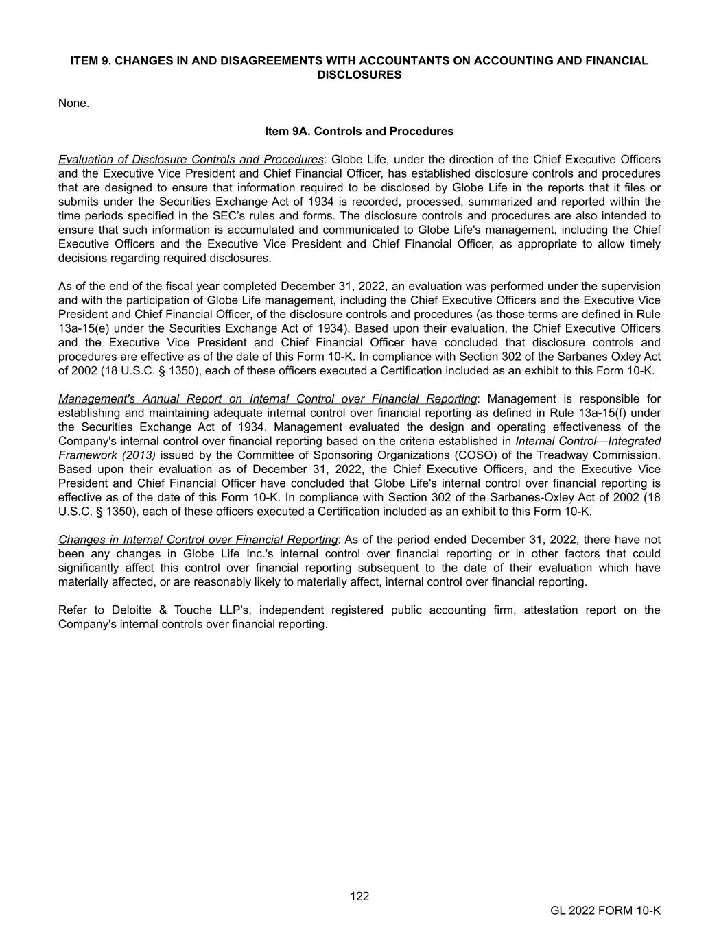 ITEM 9. CHANGES IN AND DISAGREEMENTS WITH ACCOUNTANTS ON ACCOUNTING AND FINANCIAL DISCLOSURES None. Item 9A. Controls and Procedures Evaluation of Disclosure Controls and Procedures: Globe Life, under the direction of the Chief Executive Officers and the Executive Vice President and Chief Financial Officer, has established disclosure controls and procedures that are designed to ensure that information required to be disclosed by Globe Life in the reports that it files or submits under the Securities Exchange Act of 1934 is recorded, processed, summarized and reported within the time periods specified in the SEC’s rules and forms. The disclosure controls and procedures are also intended to ensure that such information is accumulated and communicated to Globe Life's management, including the Chief Executive Officers and the Executive Vice President and Chief Financial Officer, as appropriate to allow timely decisions regarding required disclosures. As of the end of the fiscal year completed December 31, 2022, an evaluation was performed under the supervision and with the participation of Globe Life management, including the Chief Executive Officers and the Executive Vice President and Chief Financial Officer, of the disclosure controls and procedures (as those terms are defined in Rule 13a-15(e) under the Securities Exchange Act of 1934). Based upon their evaluation, the Chief Executive Officers and the Executive Vice President and Chief Financial Officer have concluded that disclosure controls and procedures are effective as of the date of this Form 10-K. In compliance with Section 302 of the Sarbanes Oxley Act of 2002 (18 U.S.C. § 1350), each of these officers executed a Certification included as an exhibit to this Form 10-K. Management's Annual Report on Internal Control over Financial Reporting: Management is responsible for establishing and maintaining adequate internal control over financial reporting as defined in Rule 13a-15(f) under the Securities Exchange Act of 1934. Management evaluated the design and operating effectiveness of the Company's internal control over financial reporting based on the criteria established in Internal Control—Integrated Framework (2013) issued by the Committee of Sponsoring Organizations (COSO) of the Treadway Commission. Based upon their evaluation as of December 31, 2022, the Chief Executive Officers, and the Executive Vice President and Chief Financial Officer have concluded that Globe Life's internal control over financial reporting is effective as of the date of this Form 10-K. In compliance with Section 302 of the Sarbanes-Oxley Act of 2002 (18 U.S.C. § 1350), each of these officers executed a Certification included as an exhibit to this Form 10-K. Changes in Internal Control over Financial Reporting: As of the period ended December 31, 2022, there have not been any changes in Globe Life Inc.'s internal control over financial reporting or in other factors that could significantly affect this control over financial reporting subsequent to the date of their evaluation which have materially affected, or are reasonably likely to materially affect, internal control over financial reporting. Refer to Deloitte & Touche LLP's, independent registered public accounting firm, attestation report on the Company's internal controls over financial reporting. 122 GL 2022 FORM 10-K