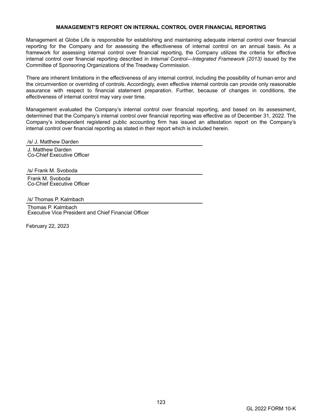 MANAGEMENT'S REPORT ON INTERNAL CONTROL OVER FINANCIAL REPORTING Management at Globe Life is responsible for establishing and maintaining adequate internal control over financial reporting for the Company and for assessing the effectiveness of internal control on an annual basis. As a framework for assessing internal control over financial reporting, the Company utilizes the criteria for effective internal control over financial reporting described in Internal Control—Integrated Framework (2013) issued by the Committee of Sponsoring Organizations of the Treadway Commission. There are inherent limitations in the effectiveness of any internal control, including the possibility of human error and the circumvention or overriding of controls. Accordingly, even effective internal controls can provide only reasonable assurance with respect to financial statement preparation. Further, because of changes in conditions, the effectiveness of internal control may vary over time. Management evaluated the Company’s internal control over financial reporting, and based on its assessment, determined that the Company’s internal control over financial reporting was effective as of December 31, 2022. The Company’s independent registered public accounting firm has issued an attestation report on the Company’s internal control over financial reporting as stated in their report which is included herein. /s/ J. Matthew Darden J. Matthew Darden Co-Chief Executive Officer /s/ Frank M. Svoboda Frank M. Svoboda Co-Chief Executive Officer /s/ Thomas P. Kalmbach Thomas P. Kalmbach Executive Vice President and Chief Financial Officer February 22, 2023 123 GL 2022 FORM 10-K