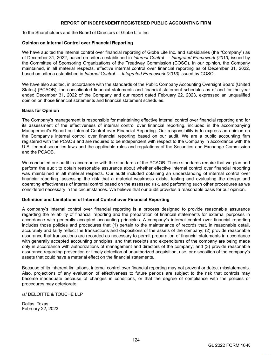 REPORT OF INDEPENDENT REGISTERED PUBLIC ACCOUNTING FIRM To the Shareholders and the Board of Directors of Globe Life Inc. Opinion on Internal Control over Financial Reporting We have audited the internal control over financial reporting of Globe Life Inc. and subsidiaries (the “Company”) as of December 31, 2022, based on criteria established in Internal Control — Integrated Framework (2013) issued by the Committee of Sponsoring Organizations of the Treadway Commission (COSO). In our opinion, the Company maintained, in all material respects, effective internal control over financial reporting as of December 31, 2022, based on criteria established in Internal Control — Integrated Framework (2013) issued by COSO. We have also audited, in accordance with the standards of the Public Company Accounting Oversight Board (United States) (PCAOB), the consolidated financial statements and financial statement schedules as of and for the year ended December 31, 2022 of the Company and our report dated February 22, 2023, expressed an unqualified opinion on those financial statements and financial statement schedules. Basis for Opinion The Company’s management is responsible for maintaining effective internal control over financial reporting and for its assessment of the effectiveness of internal control over financial reporting, included in the accompanying Management's Report on Internal Control over Financial Reporting. Our responsibility is to express an opinion on the Company’s internal control over financial reporting based on our audit. We are a public accounting firm registered with the PCAOB and are required to be independent with respect to the Company in accordance with the U.S. federal securities laws and the applicable rules and regulations of the Securities and Exchange Commission and the PCAOB. We conducted our audit in accordance with the standards of the PCAOB. Those standards require that we plan and perform the audit to obtain reasonable assurance about whether effective internal control over financial reporting was maintained in all material respects. Our audit included obtaining an understanding of internal control over financial reporting, assessing the risk that a material weakness exists, testing and evaluating the design and operating effectiveness of internal control based on the assessed risk, and performing such other procedures as we considered necessary in the circumstances. We believe that our audit provides a reasonable basis for our opinion. Definition and Limitations of Internal Control over Financial Reporting A company’s internal control over financial reporting is a process designed to provide reasonable assurance regarding the reliability of financial reporting and the preparation of financial statements for external purposes in accordance with generally accepted accounting principles. A company’s internal control over financial reporting includes those policies and procedures that (1) pertain to the maintenance of records that, in reasonable detail, accurately and fairly reflect the transactions and dispositions of the assets of the company; (2) provide reasonable assurance that transactions are recorded as necessary to permit preparation of financial statements in accordance with generally accepted accounting principles, and that receipts and expenditures of the company are being made only in accordance with authorizations of management and directors of the company; and (3) provide reasonable assurance regarding prevention or timely detection of unauthorized acquisition, use, or disposition of the company’s assets that could have a material effect on the financial statements. Because of its inherent limitations, internal control over financial reporting may not prevent or detect misstatements. Also, projections of any evaluation of effectiveness to future periods are subject to the risk that controls may become inadequate because of changes in conditions, or that the degree of compliance with the policies or procedures may deteriorate. /s/ DELOITTE & TOUCHE LLP Dallas, Texas February 22, 2023 124 GL 2022 FORM 10-K
