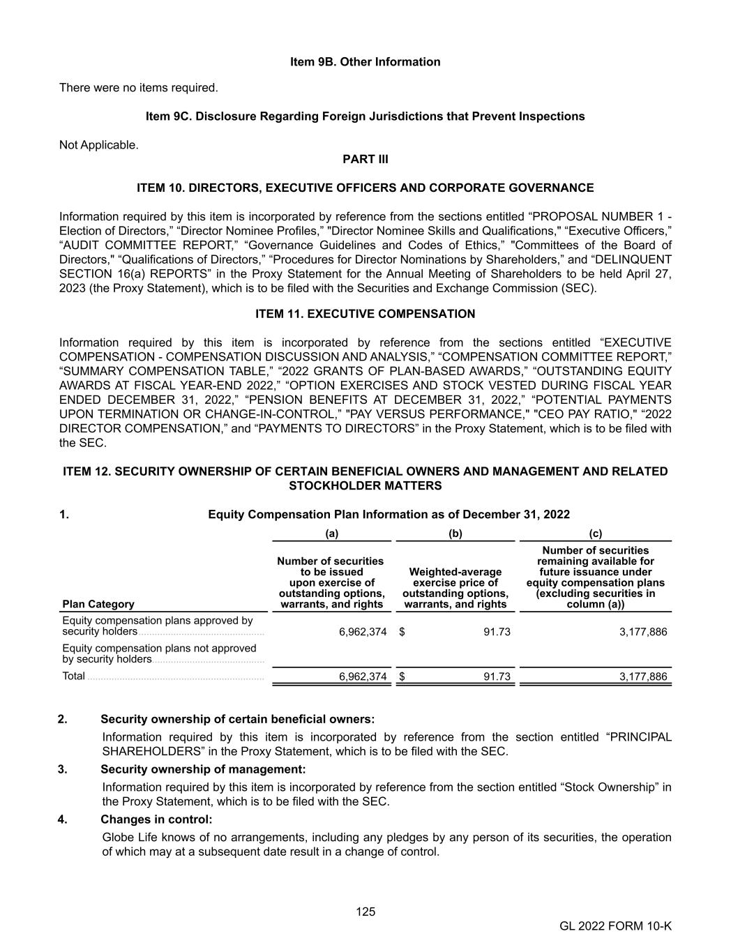 Item 9B. Other Information There were no items required. Item 9C. Disclosure Regarding Foreign Jurisdictions that Prevent Inspections Not Applicable. PART III ITEM 10. DIRECTORS, EXECUTIVE OFFICERS AND CORPORATE GOVERNANCE Information required by this item is incorporated by reference from the sections entitled “PROPOSAL NUMBER 1 - Election of Directors,” “Director Nominee Profiles,” "Director Nominee Skills and Qualifications," “Executive Officers,” “AUDIT COMMITTEE REPORT,” “Governance Guidelines and Codes of Ethics,” "Committees of the Board of Directors," “Qualifications of Directors,” “Procedures for Director Nominations by Shareholders,” and “DELINQUENT SECTION 16(a) REPORTS” in the Proxy Statement for the Annual Meeting of Shareholders to be held April 27, 2023 (the Proxy Statement), which is to be filed with the Securities and Exchange Commission (SEC). ITEM 11. EXECUTIVE COMPENSATION Information required by this item is incorporated by reference from the sections entitled “EXECUTIVE COMPENSATION - COMPENSATION DISCUSSION AND ANALYSIS,” “COMPENSATION COMMITTEE REPORT,” “SUMMARY COMPENSATION TABLE,” “2022 GRANTS OF PLAN-BASED AWARDS,” “OUTSTANDING EQUITY AWARDS AT FISCAL YEAR-END 2022,” “OPTION EXERCISES AND STOCK VESTED DURING FISCAL YEAR ENDED DECEMBER 31, 2022,” “PENSION BENEFITS AT DECEMBER 31, 2022,” “POTENTIAL PAYMENTS UPON TERMINATION OR CHANGE-IN-CONTROL,” "PAY VERSUS PERFORMANCE," "CEO PAY RATIO," “2022 DIRECTOR COMPENSATION,” and “PAYMENTS TO DIRECTORS” in the Proxy Statement, which is to be filed with the SEC. ITEM 12. SECURITY OWNERSHIP OF CERTAIN BENEFICIAL OWNERS AND MANAGEMENT AND RELATED STOCKHOLDER MATTERS 1. Equity Compensation Plan Information as of December 31, 2022 (a) (b) (c) Plan Category Number of securities to be issued upon exercise of outstanding options, warrants, and rights Weighted-average exercise price of outstanding options, warrants, and rights Number of securities remaining available for future issuance under equity compensation plans (excluding securities in column (a)) Equity compensation plans approved by security holders............................................... 6,962,374 $ 91.73 3,177,886 Equity compensation plans not approved by security holders.......................................... Total .................................................................. 6,962,374 $ 91.73 3,177,886 2. Security ownership of certain beneficial owners: Information required by this item is incorporated by reference from the section entitled “PRINCIPAL SHAREHOLDERS” in the Proxy Statement, which is to be filed with the SEC. 3. Security ownership of management: Information required by this item is incorporated by reference from the section entitled “Stock Ownership” in the Proxy Statement, which is to be filed with the SEC. 4. Changes in control: Globe Life knows of no arrangements, including any pledges by any person of its securities, the operation of which may at a subsequent date result in a change of control. 125 GL 2022 FORM 10-K