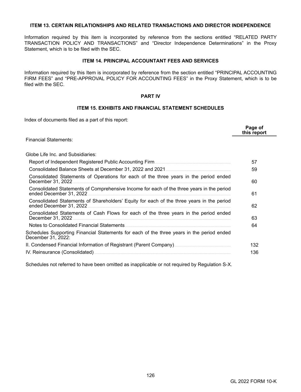 ITEM 13. CERTAIN RELATIONSHIPS AND RELATED TRANSACTIONS AND DIRECTOR INDEPENDENCE Information required by this item is incorporated by reference from the sections entitled “RELATED PARTY TRANSACTION POLICY AND TRANSACTIONS” and “Director Independence Determinations” in the Proxy Statement, which is to be filed with the SEC. ITEM 14. PRINCIPAL ACCOUNTANT FEES AND SERVICES Information required by this Item is incorporated by reference from the section entitled “PRINCIPAL ACCOUNTING FIRM FEES” and “PRE-APPROVAL POLICY FOR ACCOUNTING FEES” in the Proxy Statement, which is to be filed with the SEC. PART IV ITEM 15. EXHIBITS AND FINANCIAL STATEMENT SCHEDULES Index of documents filed as a part of this report: Page of this report Financial Statements: Globe Life Inc. and Subsidiaries: Report of Independent Registered Public Accounting Firm.............................................................. 57 Consolidated Balance Sheets at December 31, 2022 and 2021..................................................... 59 Consolidated Statements of Operations for each of the three years in the period ended December 31, 2022 ................................................................................................................................ 60 Consolidated Statements of Comprehensive Income for each of the three years in the period ended December 31, 2022 .................................................................................................................... 61 Consolidated Statements of Shareholders’ Equity for each of the three years in the period ended December 31, 2022 .................................................................................................................... 62 Consolidated Statements of Cash Flows for each of the three years in the period ended December 31, 2022 ................................................................................................................................ 63 Notes to Consolidated Financial Statements ...................................................................................... 64 Schedules Supporting Financial Statements for each of the three years in the period ended December 31, 2022: II. Condensed Financial Information of Registrant (Parent Company).............................................. 132 IV. Reinsurance (Consolidated) ............................................................................................................... 136 Schedules not referred to have been omitted as inapplicable or not required by Regulation S-X. 126 GL 2022 FORM 10-K