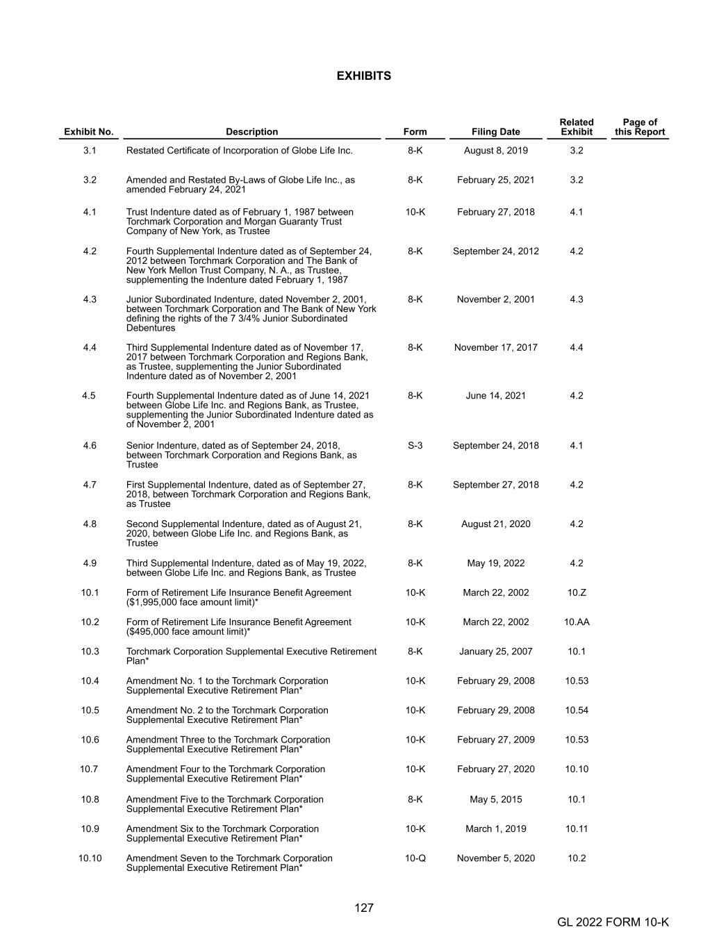 EXHIBITS 3.1 Restated Certificate of Incorporation of Globe Life Inc. 8-K August 8, 2019 3.2 3.2 Amended and Restated By-Laws of Globe Life Inc., as amended February 24, 2021 8-K February 25, 2021 3.2 4.1 Trust Indenture dated as of February 1, 1987 between Torchmark Corporation and Morgan Guaranty Trust Company of New York, as Trustee 10-K February 27, 2018 4.1 4.2 Fourth Supplemental Indenture dated as of September 24, 2012 between Torchmark Corporation and The Bank of New York Mellon Trust Company, N. A., as Trustee, supplementing the Indenture dated February 1, 1987 8-K September 24, 2012 4.2 4.3 Junior Subordinated Indenture, dated November 2, 2001, between Torchmark Corporation and The Bank of New York defining the rights of the 7 3/4% Junior Subordinated Debentures 8-K November 2, 2001 4.3 4.4 Third Supplemental Indenture dated as of November 17, 2017 between Torchmark Corporation and Regions Bank, as Trustee, supplementing the Junior Subordinated Indenture dated as of November 2, 2001 8-K November 17, 2017 4.4 4.5 Fourth Supplemental Indenture dated as of June 14, 2021 between Globe Life Inc. and Regions Bank, as Trustee, supplementing the Junior Subordinated Indenture dated as of November 2, 2001 8-K June 14, 2021 4.2 4.6 Senior Indenture, dated as of September 24, 2018, between Torchmark Corporation and Regions Bank, as Trustee S-3 September 24, 2018 4.1 4.7 First Supplemental Indenture, dated as of September 27, 2018, between Torchmark Corporation and Regions Bank, as Trustee 8-K September 27, 2018 4.2 4.8 Second Supplemental Indenture, dated as of August 21, 2020, between Globe Life Inc. and Regions Bank, as Trustee 8-K August 21, 2020 4.2 4.9 Third Supplemental Indenture, dated as of May 19, 2022, between Globe Life Inc. and Regions Bank, as Trustee 8-K May 19, 2022 4.2 10.1 Form of Retirement Life Insurance Benefit Agreement ($1,995,000 face amount limit)* 10-K March 22, 2002 10.Z 10.2 Form of Retirement Life Insurance Benefit Agreement ($495,000 face amount limit)* 10-K March 22, 2002 10.AA 10.3 Torchmark Corporation Supplemental Executive Retirement Plan* 8-K January 25, 2007 10.1 10.4 Amendment No. 1 to the Torchmark Corporation Supplemental Executive Retirement Plan* 10-K February 29, 2008 10.53 10.5 Amendment No. 2 to the Torchmark Corporation Supplemental Executive Retirement Plan* 10-K February 29, 2008 10.54 10.6 Amendment Three to the Torchmark Corporation Supplemental Executive Retirement Plan* 10-K February 27, 2009 10.53 10.7 Amendment Four to the Torchmark Corporation Supplemental Executive Retirement Plan* 10-K February 27, 2020 10.10 10.8 Amendment Five to the Torchmark Corporation Supplemental Executive Retirement Plan* 8-K May 5, 2015 10.1 10.9 Amendment Six to the Torchmark Corporation Supplemental Executive Retirement Plan* 10-K March 1, 2019 10.11 10.10 Amendment Seven to the Torchmark Corporation Supplemental Executive Retirement Plan* 10-Q November 5, 2020 10.2 Exhibit No. Description Form Filing Date Related Exhibit Page of this Report 127 GL 2022 FORM 10-K