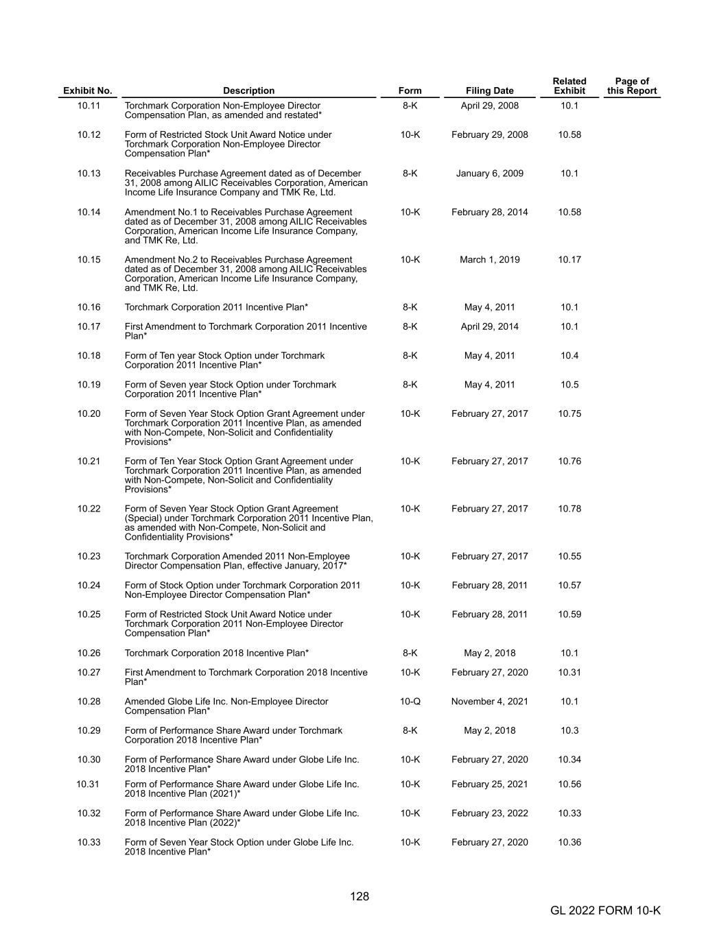 10.11 Torchmark Corporation Non-Employee Director Compensation Plan, as amended and restated* 8-K April 29, 2008 10.1 10.12 Form of Restricted Stock Unit Award Notice under Torchmark Corporation Non-Employee Director Compensation Plan* 10-K February 29, 2008 10.58 10.13 Receivables Purchase Agreement dated as of December 31, 2008 among AILIC Receivables Corporation, American Income Life Insurance Company and TMK Re, Ltd. 8-K January 6, 2009 10.1 10.14 Amendment No.1 to Receivables Purchase Agreement dated as of December 31, 2008 among AILIC Receivables Corporation, American Income Life Insurance Company, and TMK Re, Ltd. 10-K February 28, 2014 10.58 10.15 Amendment No.2 to Receivables Purchase Agreement dated as of December 31, 2008 among AILIC Receivables Corporation, American Income Life Insurance Company, and TMK Re, Ltd. 10-K March 1, 2019 10.17 10.16 Torchmark Corporation 2011 Incentive Plan* 8-K May 4, 2011 10.1 10.17 First Amendment to Torchmark Corporation 2011 Incentive Plan* 8-K April 29, 2014 10.1 10.18 Form of Ten year Stock Option under Torchmark Corporation 2011 Incentive Plan* 8-K May 4, 2011 10.4 10.19 Form of Seven year Stock Option under Torchmark Corporation 2011 Incentive Plan* 8-K May 4, 2011 10.5 10.20 Form of Seven Year Stock Option Grant Agreement under Torchmark Corporation 2011 Incentive Plan, as amended with Non-Compete, Non-Solicit and Confidentiality Provisions* 10-K February 27, 2017 10.75 10.21 Form of Ten Year Stock Option Grant Agreement under Torchmark Corporation 2011 Incentive Plan, as amended with Non-Compete, Non-Solicit and Confidentiality Provisions* 10-K February 27, 2017 10.76 10.22 Form of Seven Year Stock Option Grant Agreement (Special) under Torchmark Corporation 2011 Incentive Plan, as amended with Non-Compete, Non-Solicit and Confidentiality Provisions* 10-K February 27, 2017 10.78 10.23 Torchmark Corporation Amended 2011 Non-Employee Director Compensation Plan, effective January, 2017* 10-K February 27, 2017 10.55 10.24 Form of Stock Option under Torchmark Corporation 2011 Non-Employee Director Compensation Plan* 10-K February 28, 2011 10.57 10.25 Form of Restricted Stock Unit Award Notice under Torchmark Corporation 2011 Non-Employee Director Compensation Plan* 10-K February 28, 2011 10.59 10.26 Torchmark Corporation 2018 Incentive Plan* 8-K May 2, 2018 10.1 10.27 First Amendment to Torchmark Corporation 2018 Incentive Plan* 10-K February 27, 2020 10.31 10.28 Amended Globe Life Inc. Non-Employee Director Compensation Plan* 10-Q November 4, 2021 10.1 10.29 Form of Performance Share Award under Torchmark Corporation 2018 Incentive Plan* 8-K May 2, 2018 10.3 10.30 Form of Performance Share Award under Globe Life Inc. 2018 Incentive Plan* 10-K February 27, 2020 10.34 10.31 Form of Performance Share Award under Globe Life Inc. 2018 Incentive Plan (2021)* 10-K February 25, 2021 10.56 10.32 Form of Performance Share Award under Globe Life Inc. 2018 Incentive Plan (2022)* 10-K February 23, 2022 10.33 10.33 Form of Seven Year Stock Option under Globe Life Inc. 2018 Incentive Plan* 10-K February 27, 2020 10.36 Exhibit No. Description Form Filing Date Related Exhibit Page of this Report 128 GL 2022 FORM 10-K